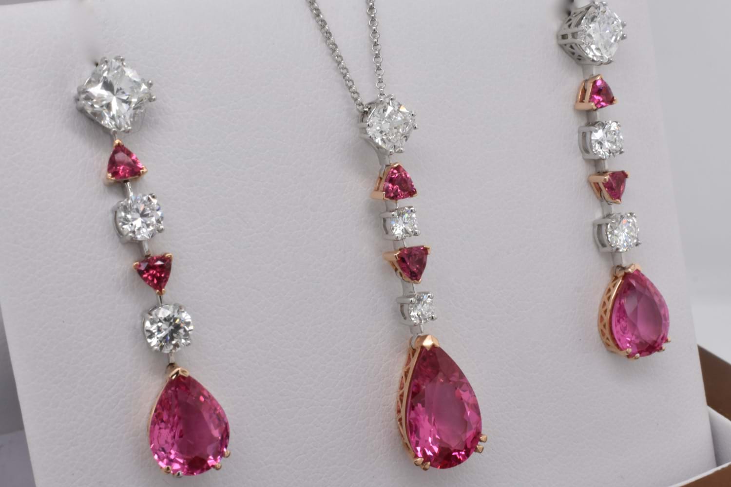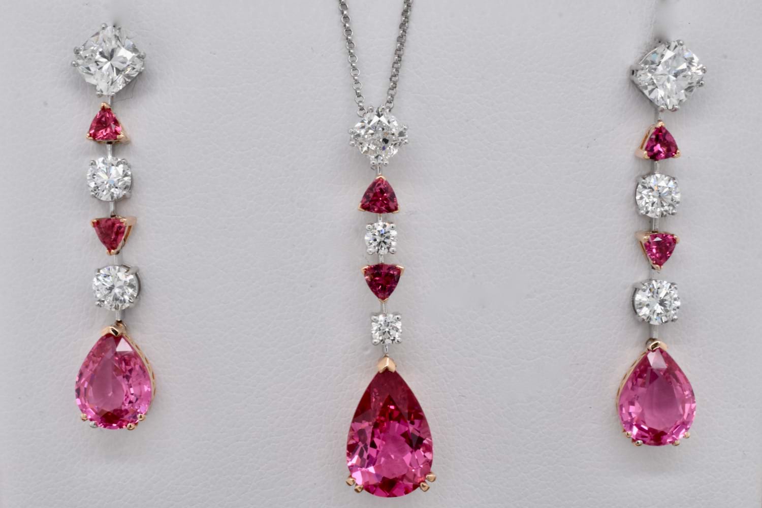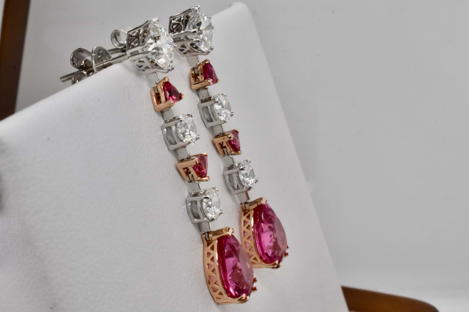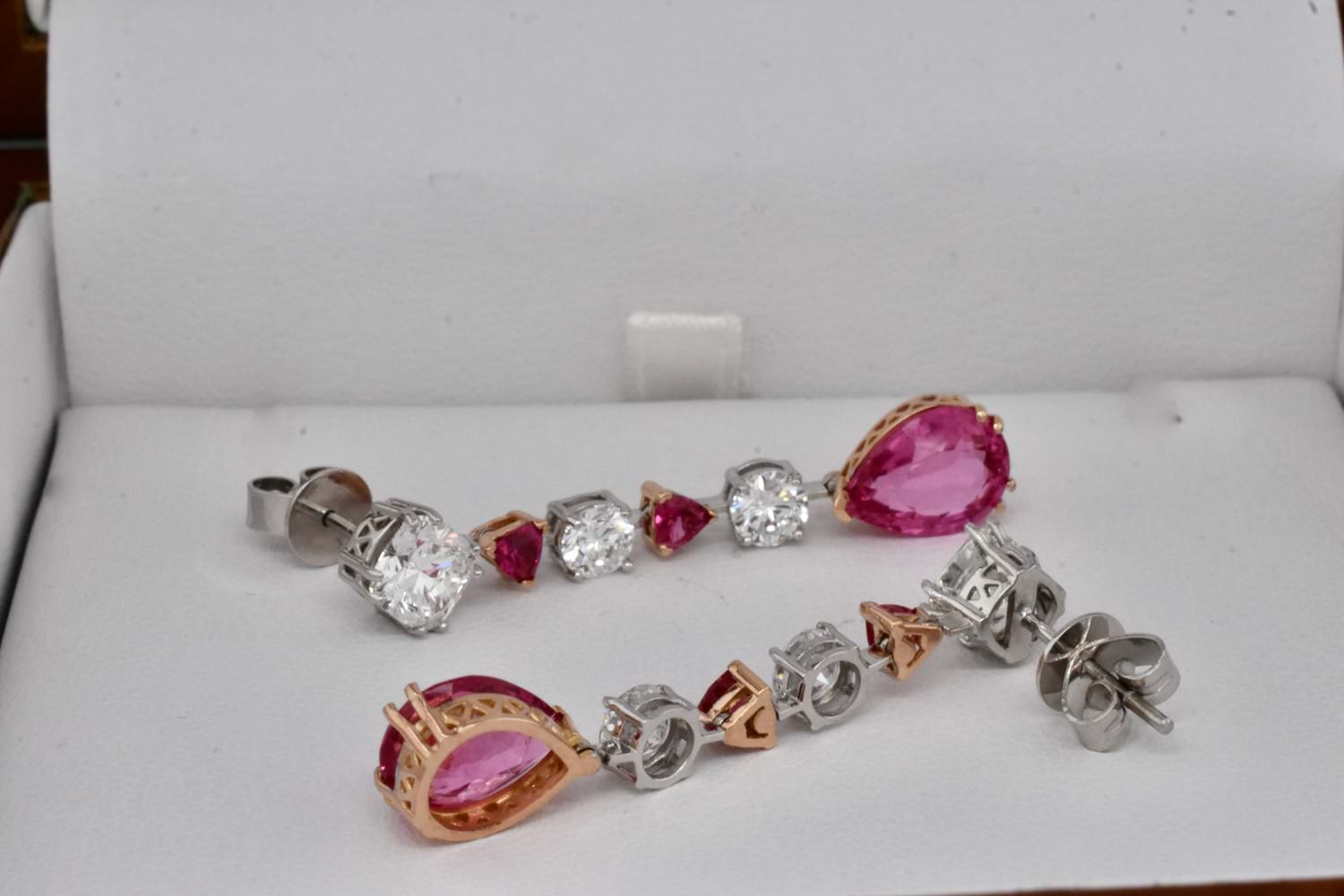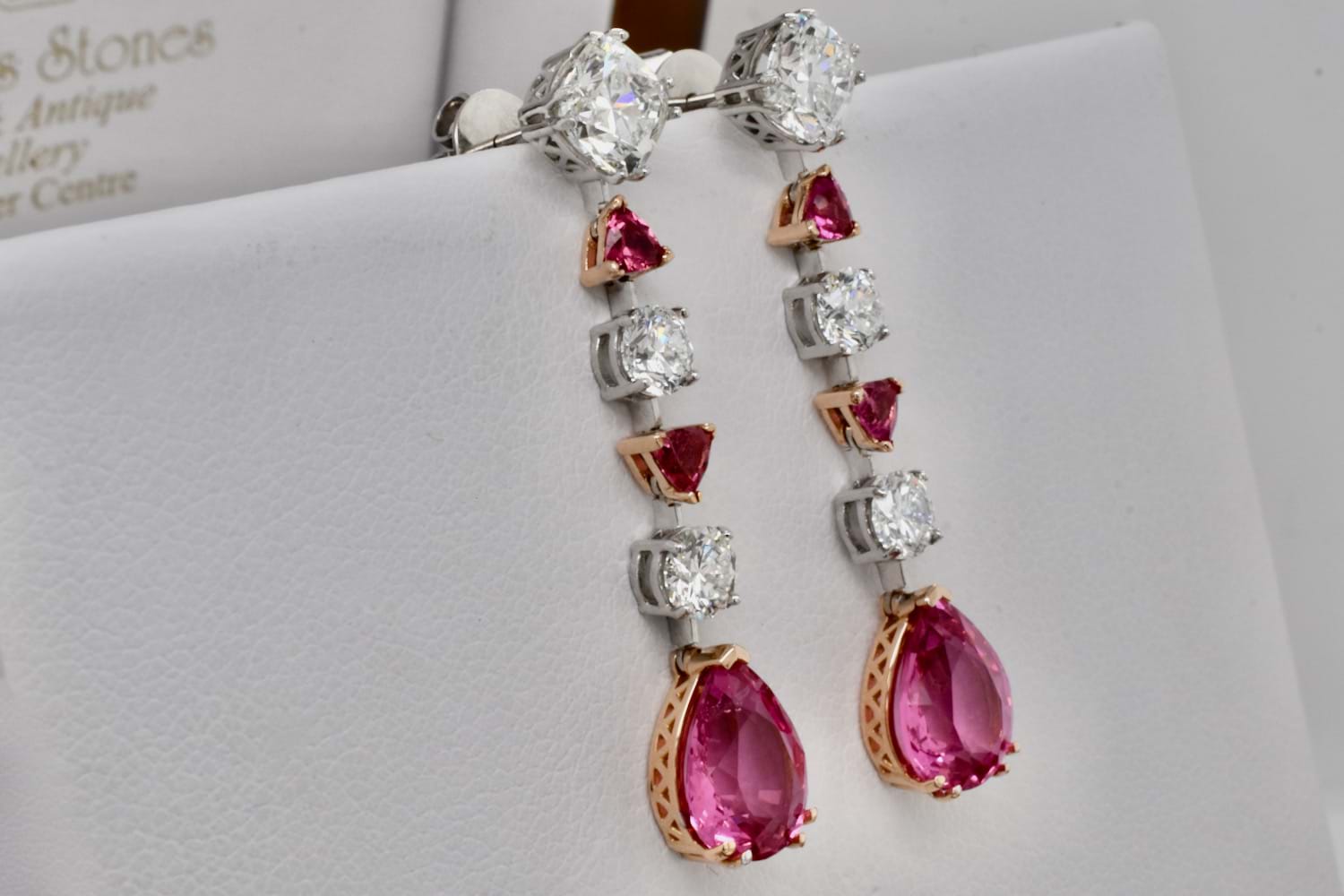 This spectacular pair of drop earrings were designed to match a previously created bespoke pendant (pictured 20281045), with all stones sourced especially to match and compliment the set. The earrings have been crafted in 18ct white and rose gold and feature a cushion cut diamond stud top with alternating trillian pink spinels and round brilliant cut diamonds with a stunning pearshape spinel feature at the base. They contain a total of 2.91cts of D-F/SI1 diamonds and 4.80cts of pink spinels. Independent Valuation Supplied.