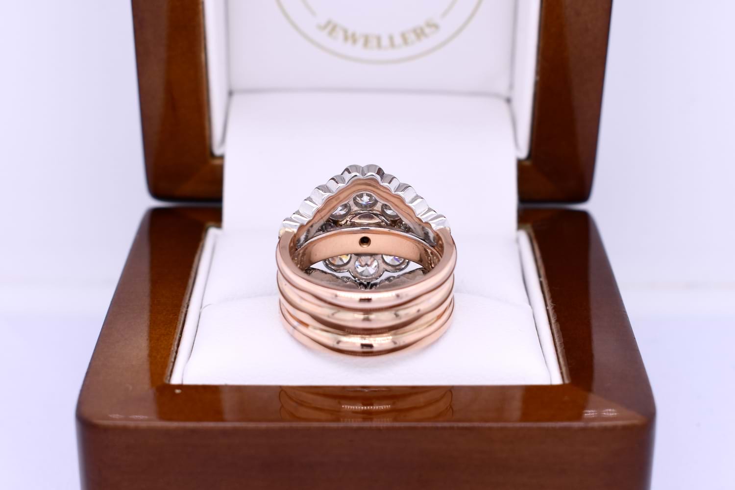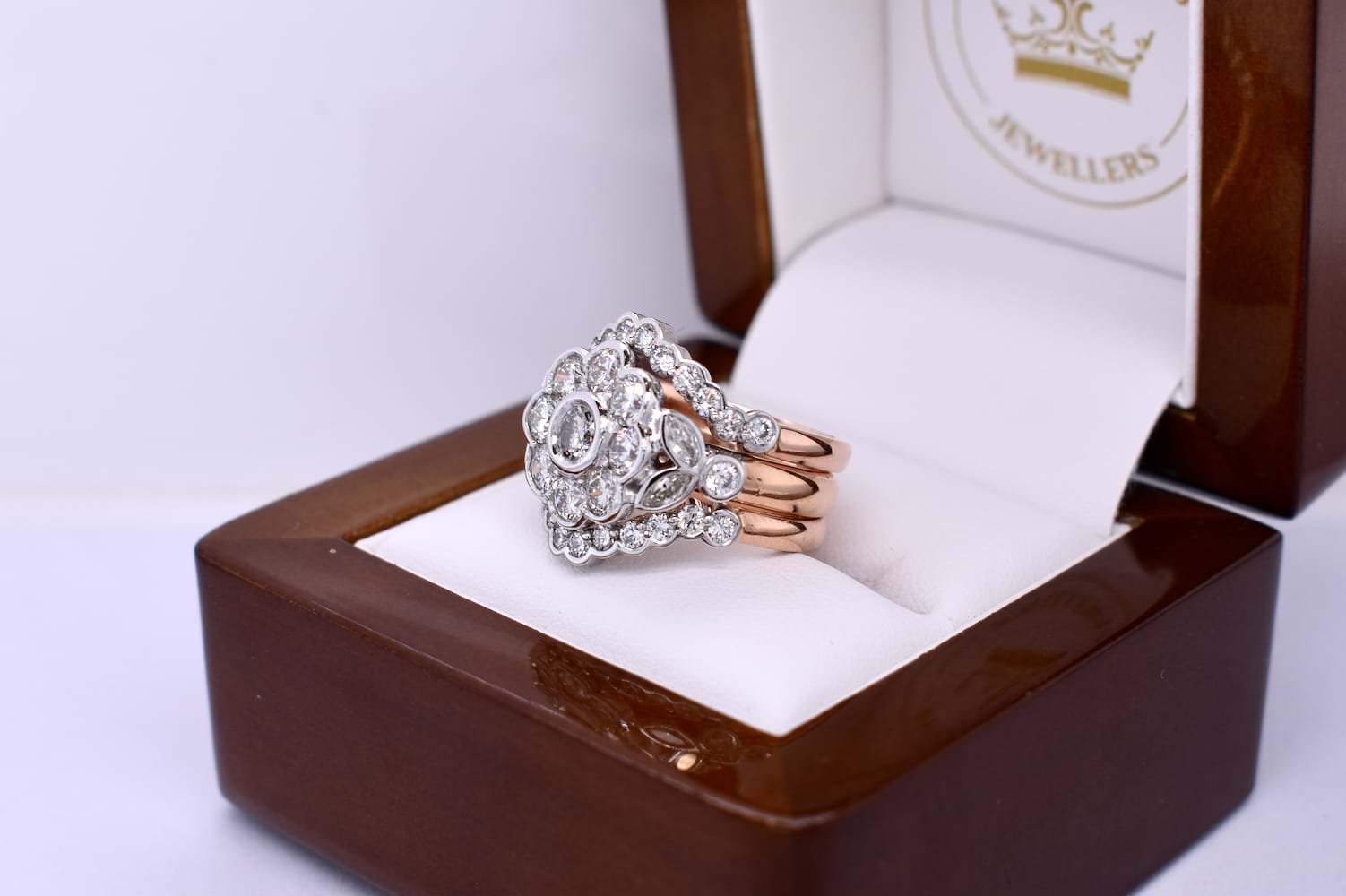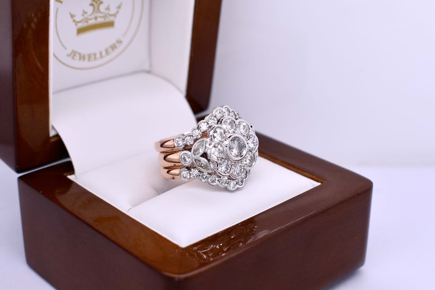These fitted bezel set diamond bands were custom made to compliment our clients existing diamond cluster ring. The bands have been made in 18ct rose gold and white gold and also contain diamonds recycled from our clients unworn jewellery. The bands are scalloped to sit around the cluster and have been tack soldered onto the original ring to create one show stopping ring. Independent Valuation Supplied.