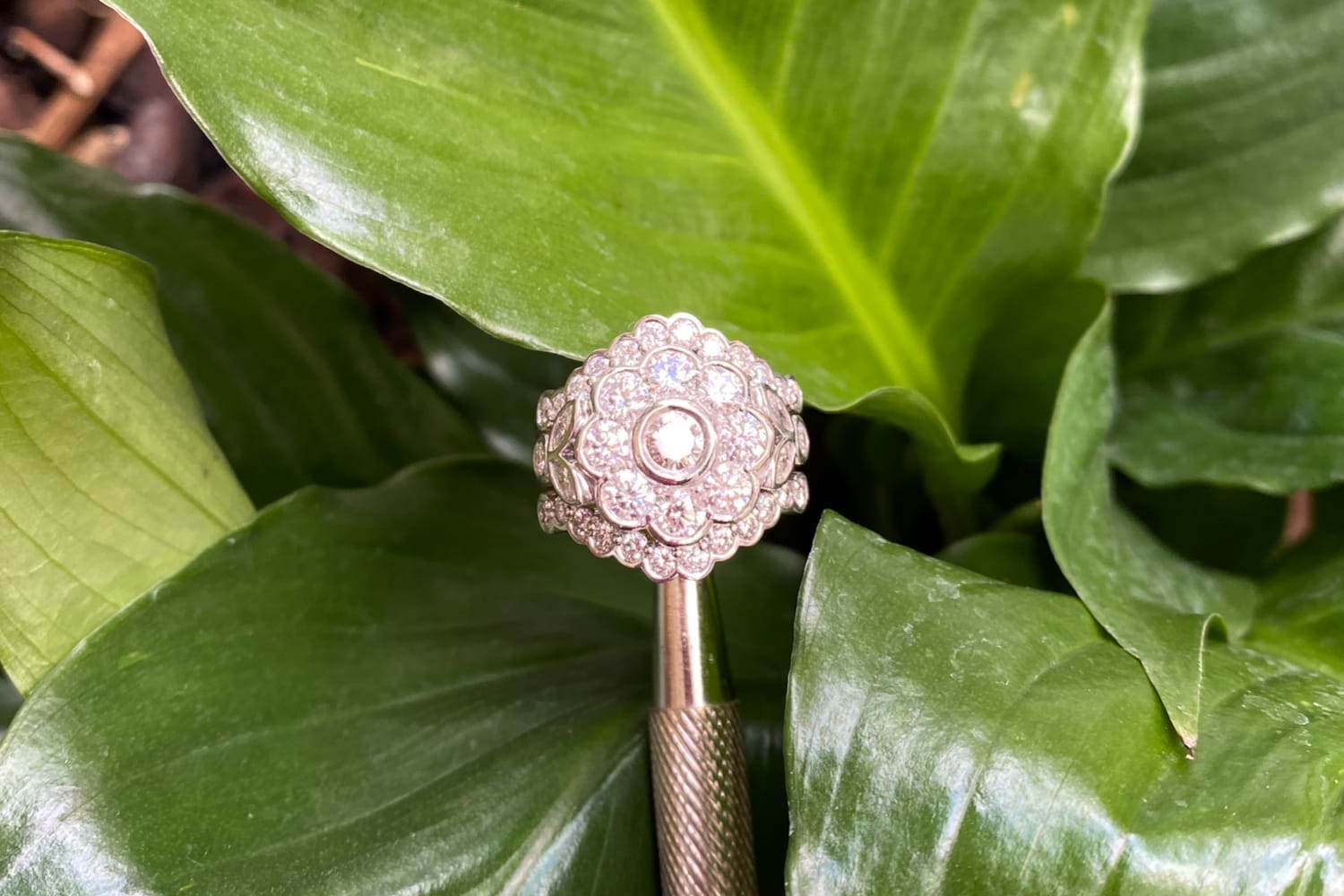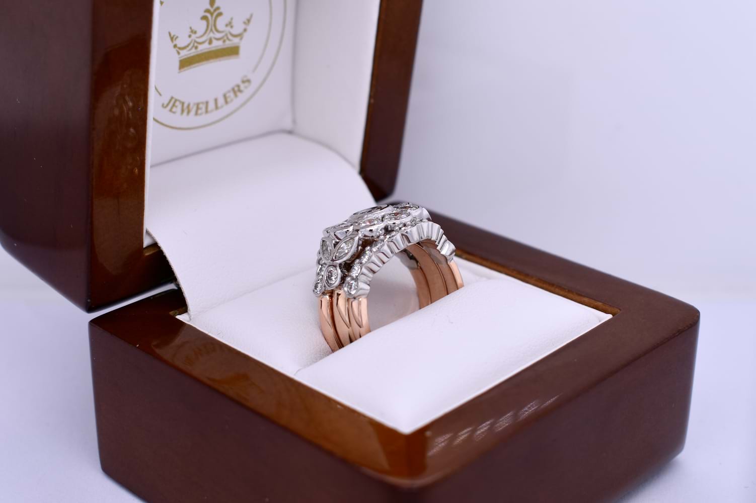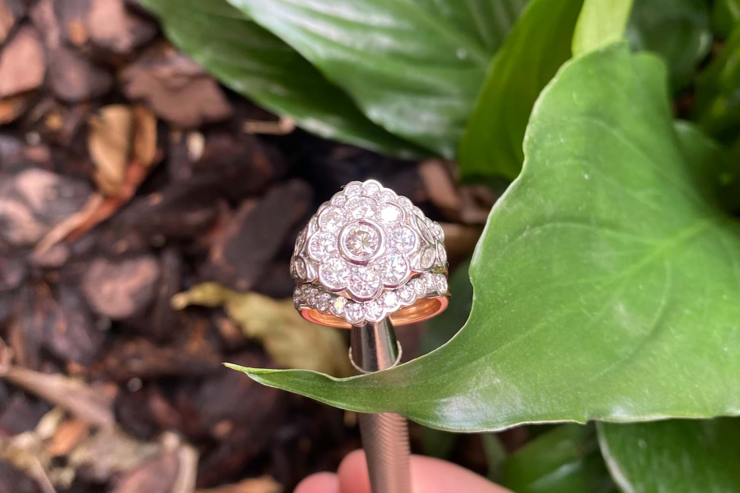 These fitted bezel set diamond bands were custom made to compliment our clients existing diamond cluster ring. The bands have been made in 18ct rose gold and white gold and also contain diamonds recycled from our clients unworn jewellery. The bands are scalloped to sit around the cluster and have been tack soldered onto the original ring to create one show stopping ring. Independent Valuation Supplied.