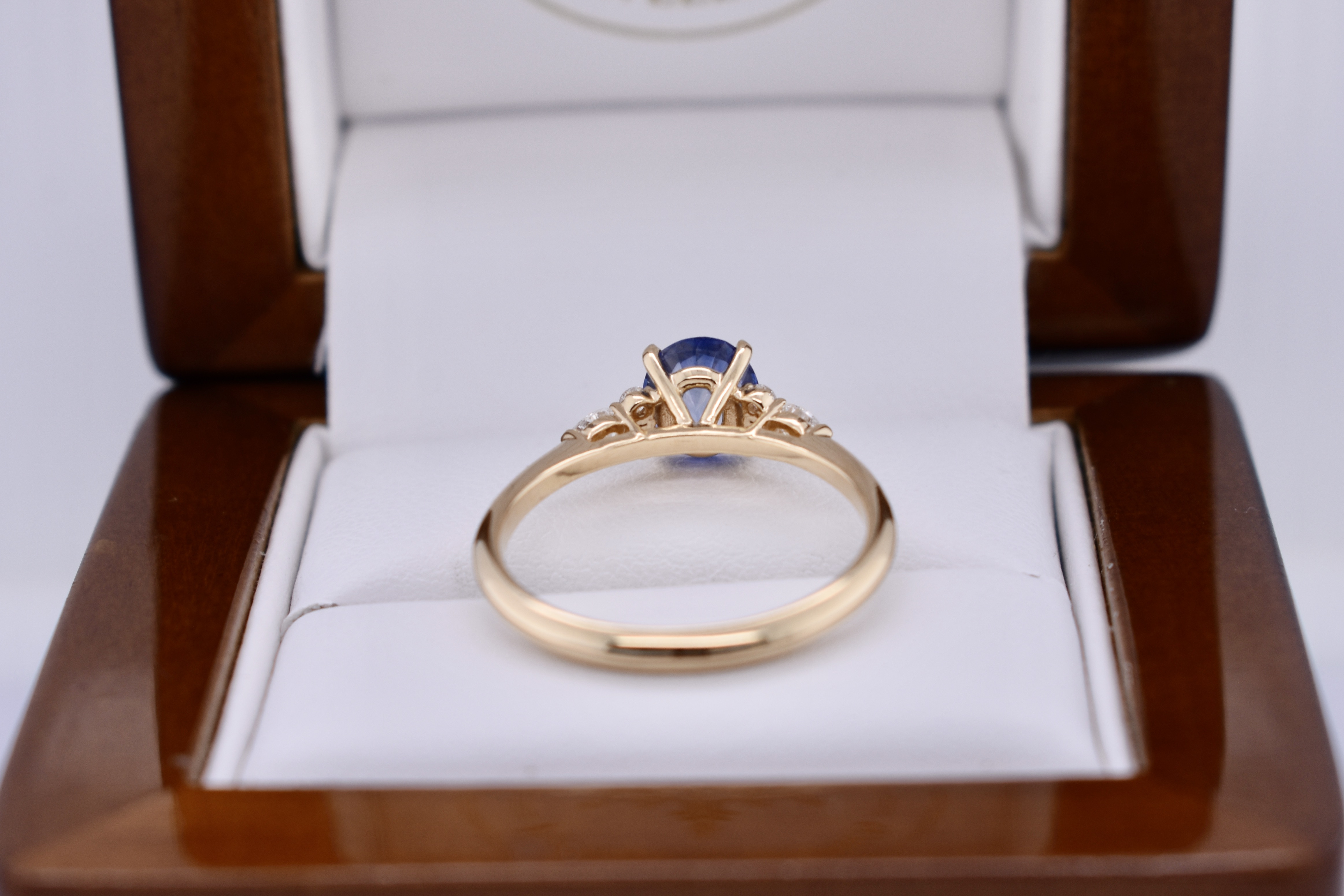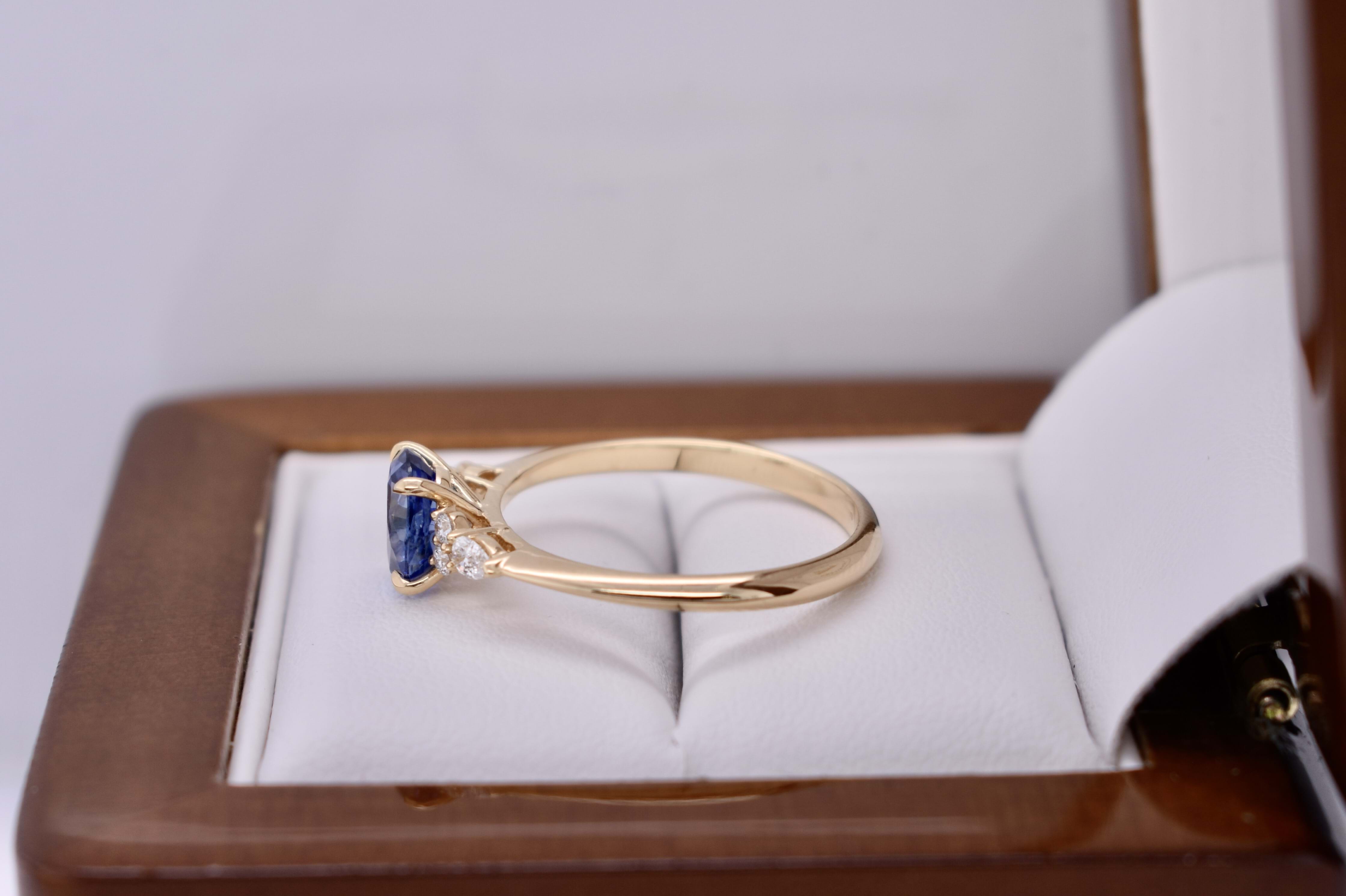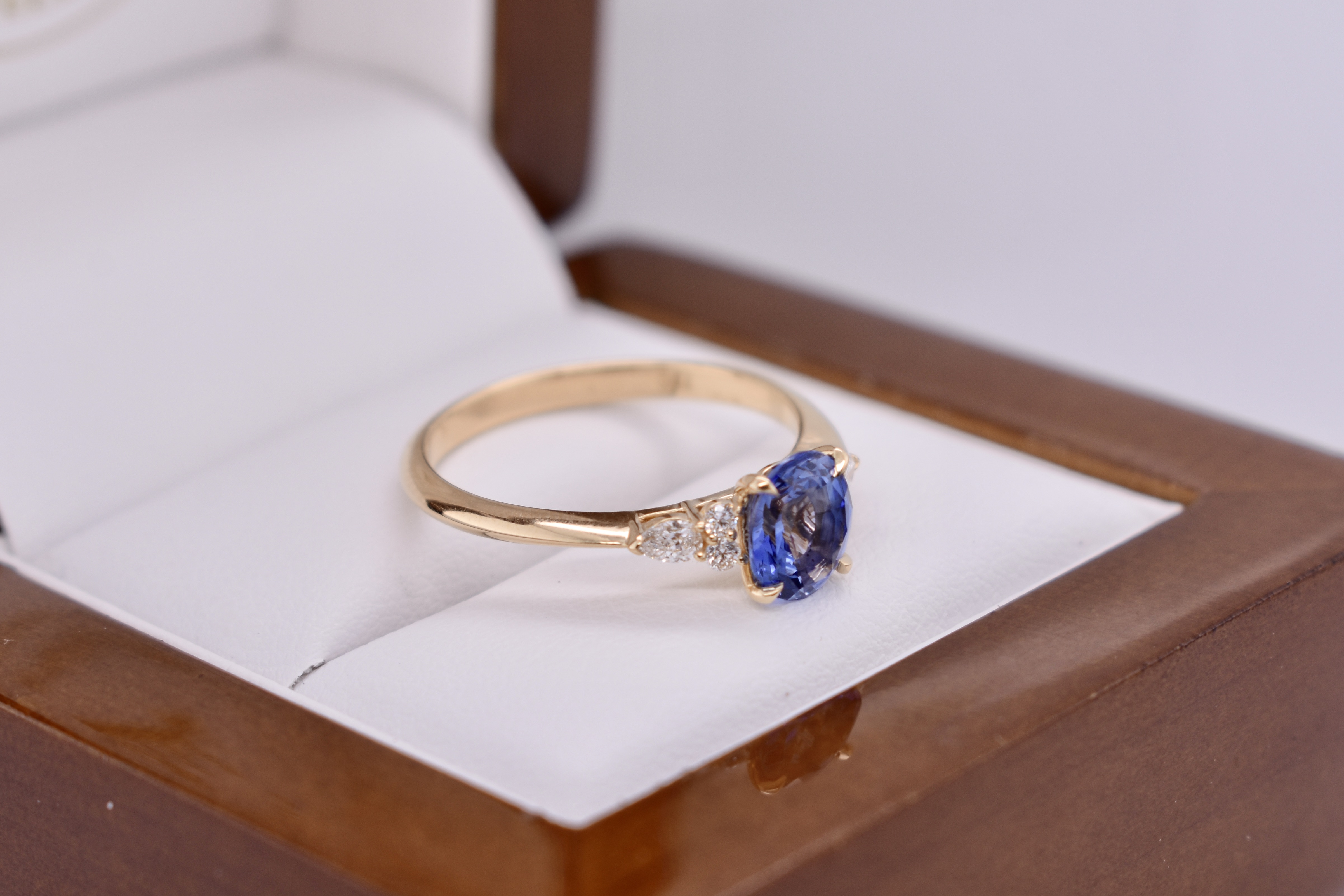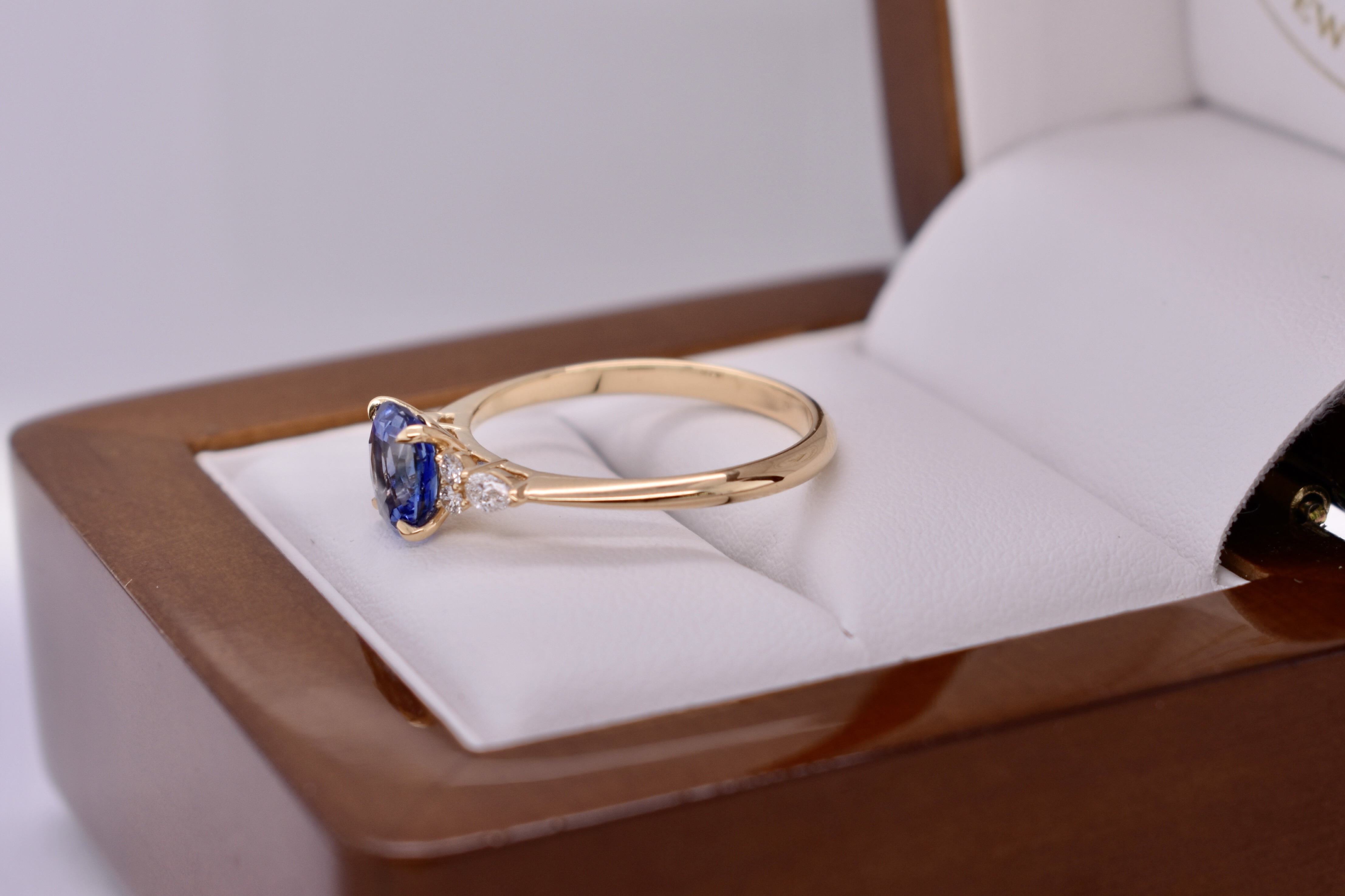 This lovely oval 1.34ct mid-light blue sapphire four claw set into a stunning 18ct yellow gold engagement ring. The sapphire is showcased with an accent of shimmering diamonds on each shoulder, with a total combined four round brilliant cuts and two pearshape diamonds equalling 0.17ct FGVS-SI. Independent Valuation Supplied.