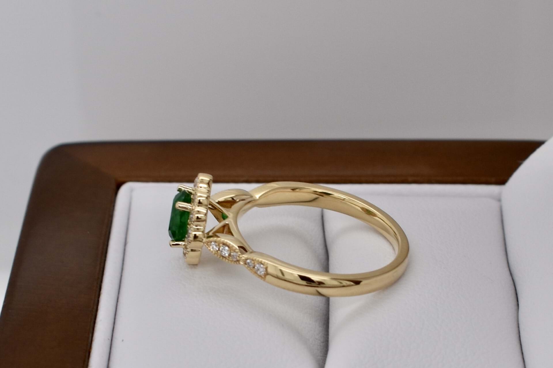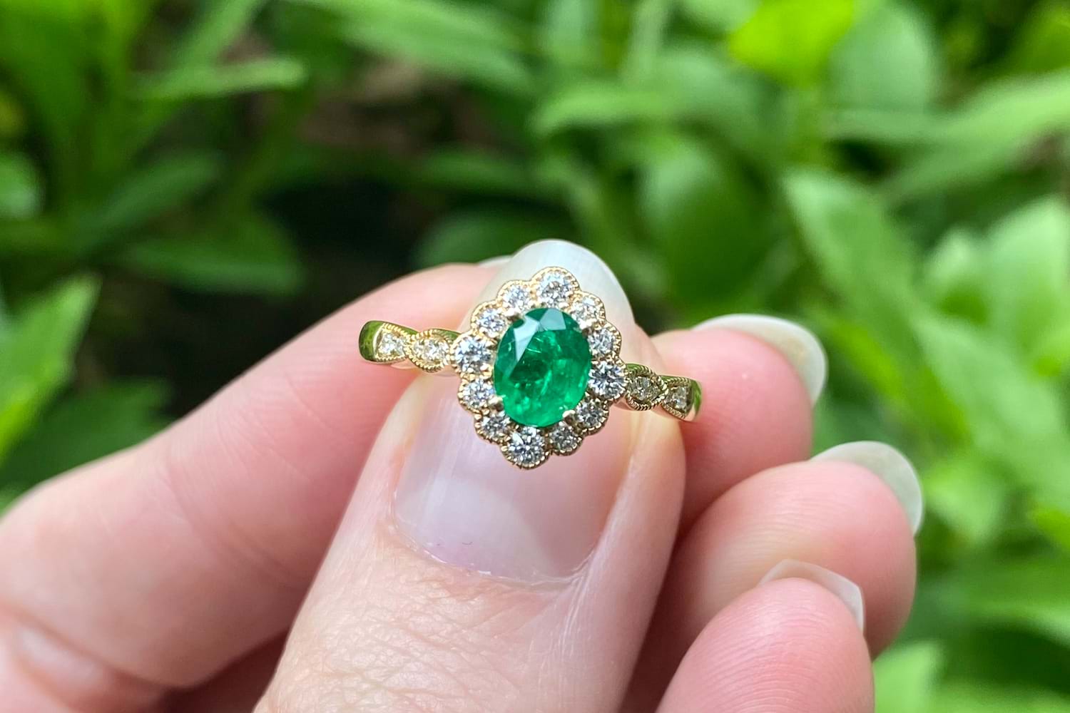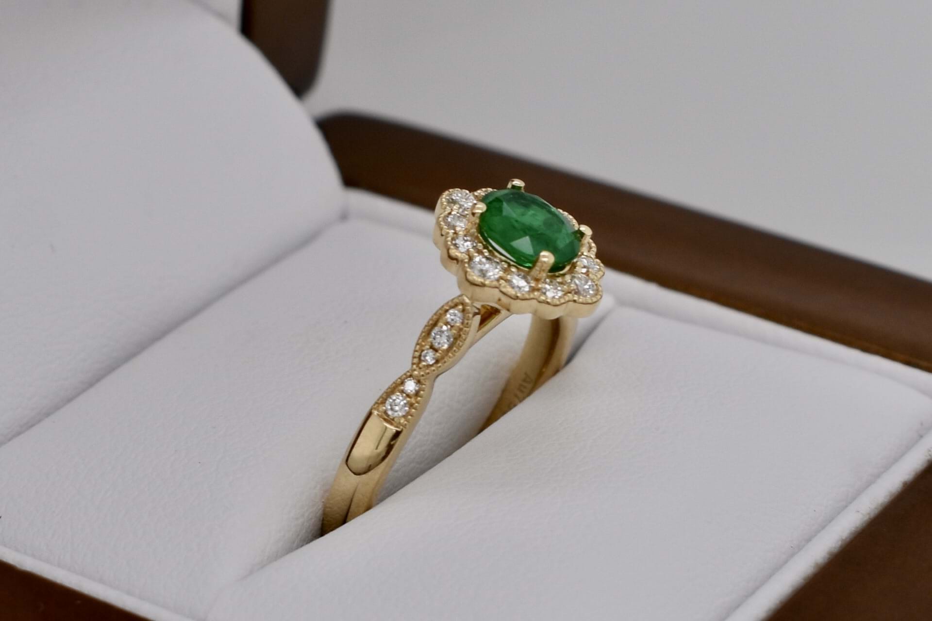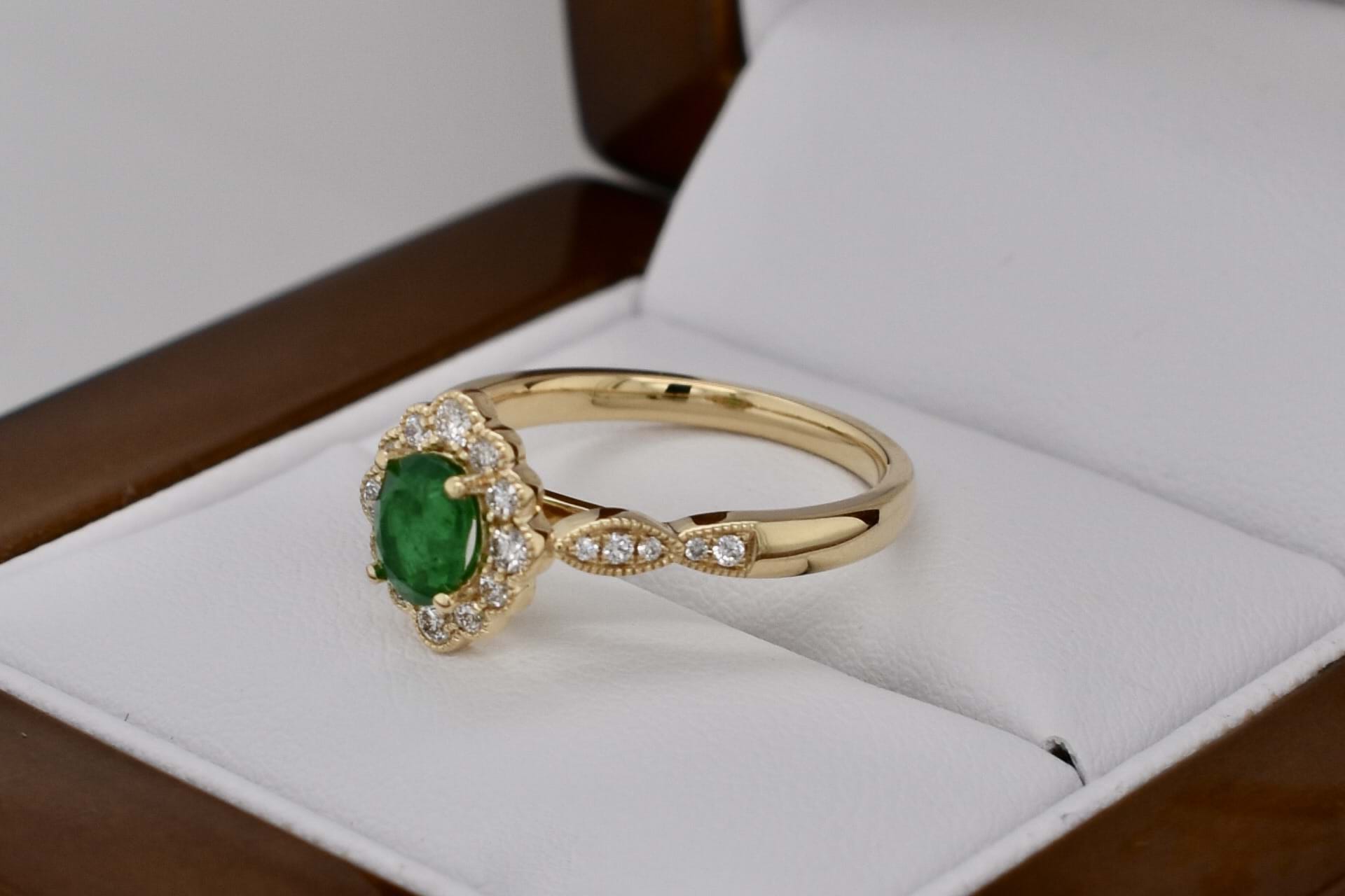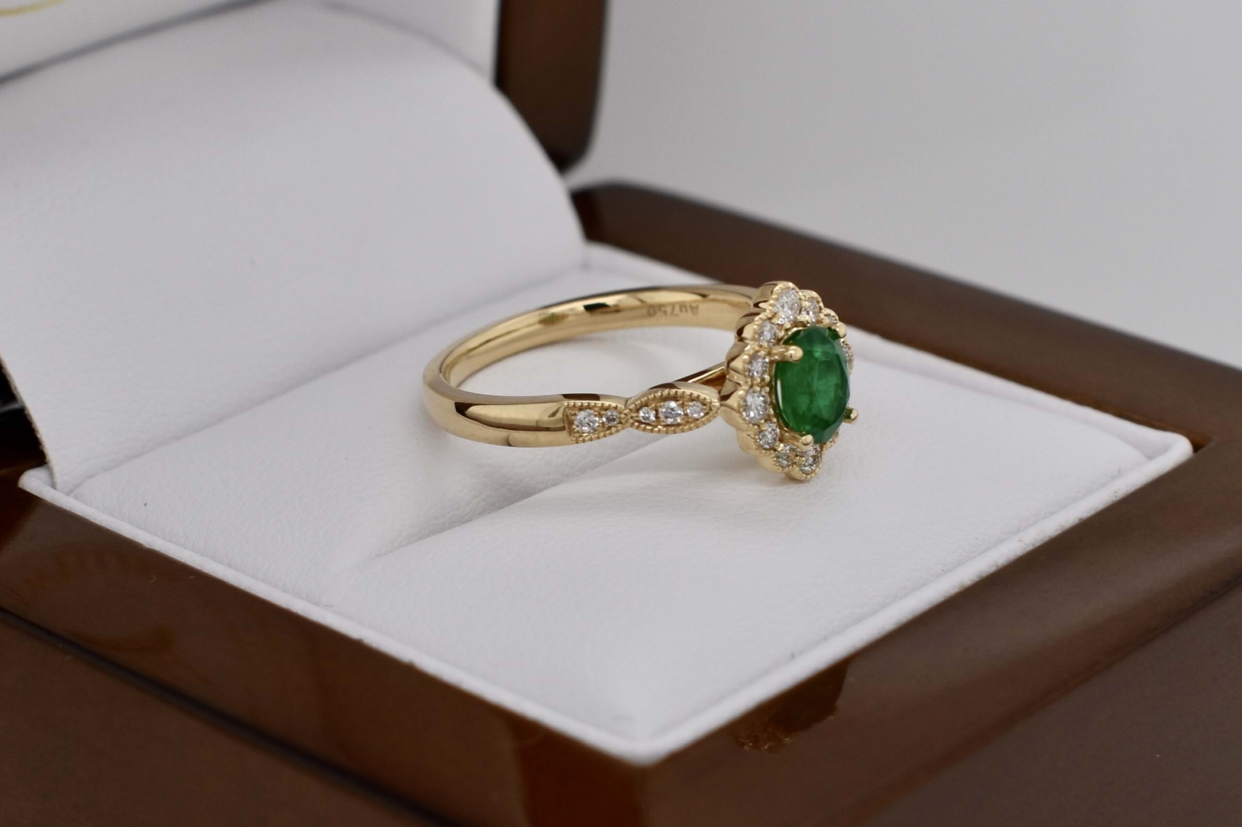 Beautiful vintage inspired engagement ring crafted in 18ct yellow gold featuring a stunning vivid green, 0.43ct, oval emerald four claw set with a scalloped marquise shape halo of shimmering round diamonds and a diamond set shoulders. This ring has been designed to sit perfectly next to a wedding band and contains a total of 0.22ct diamonds. Independent Valuation Supplied.