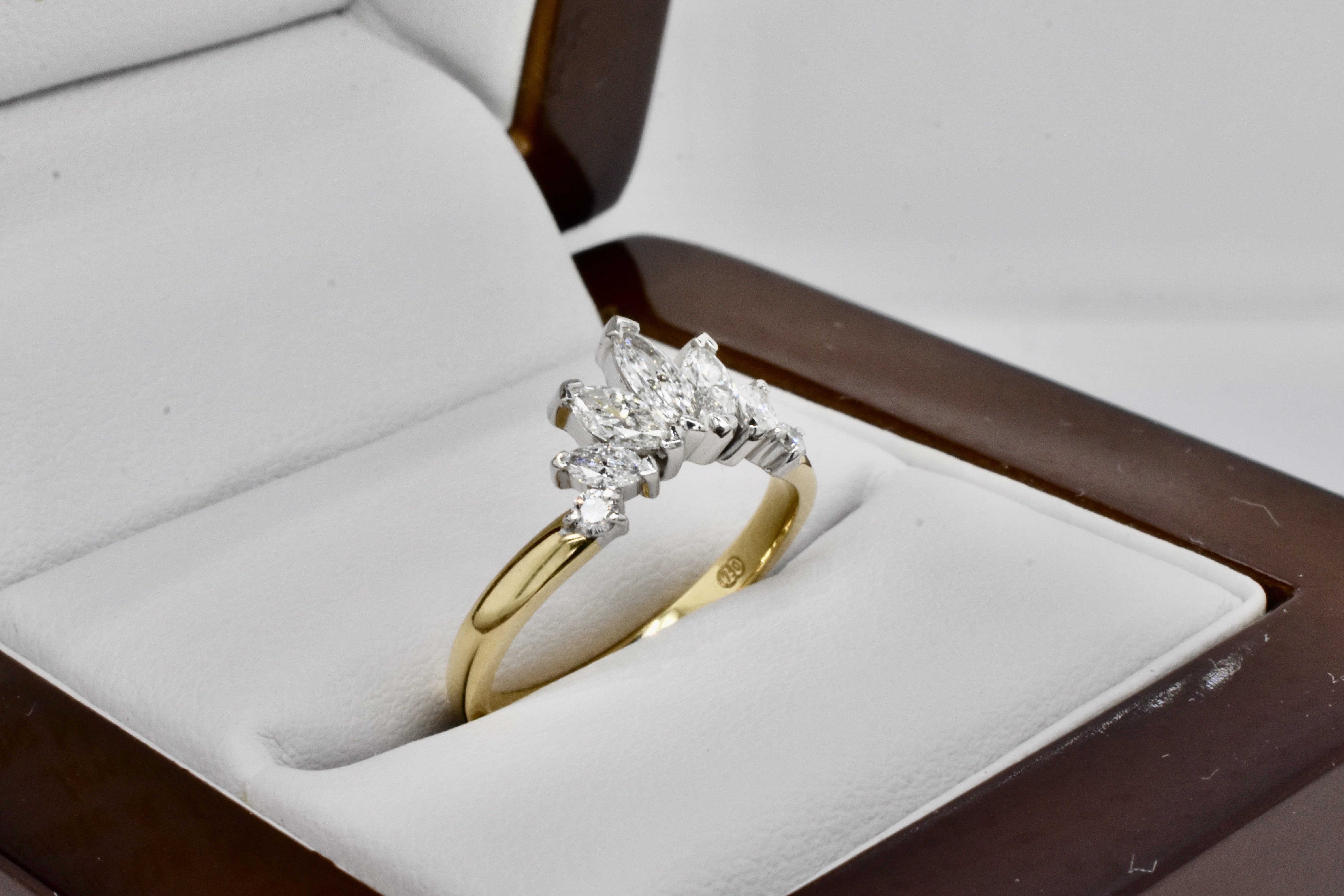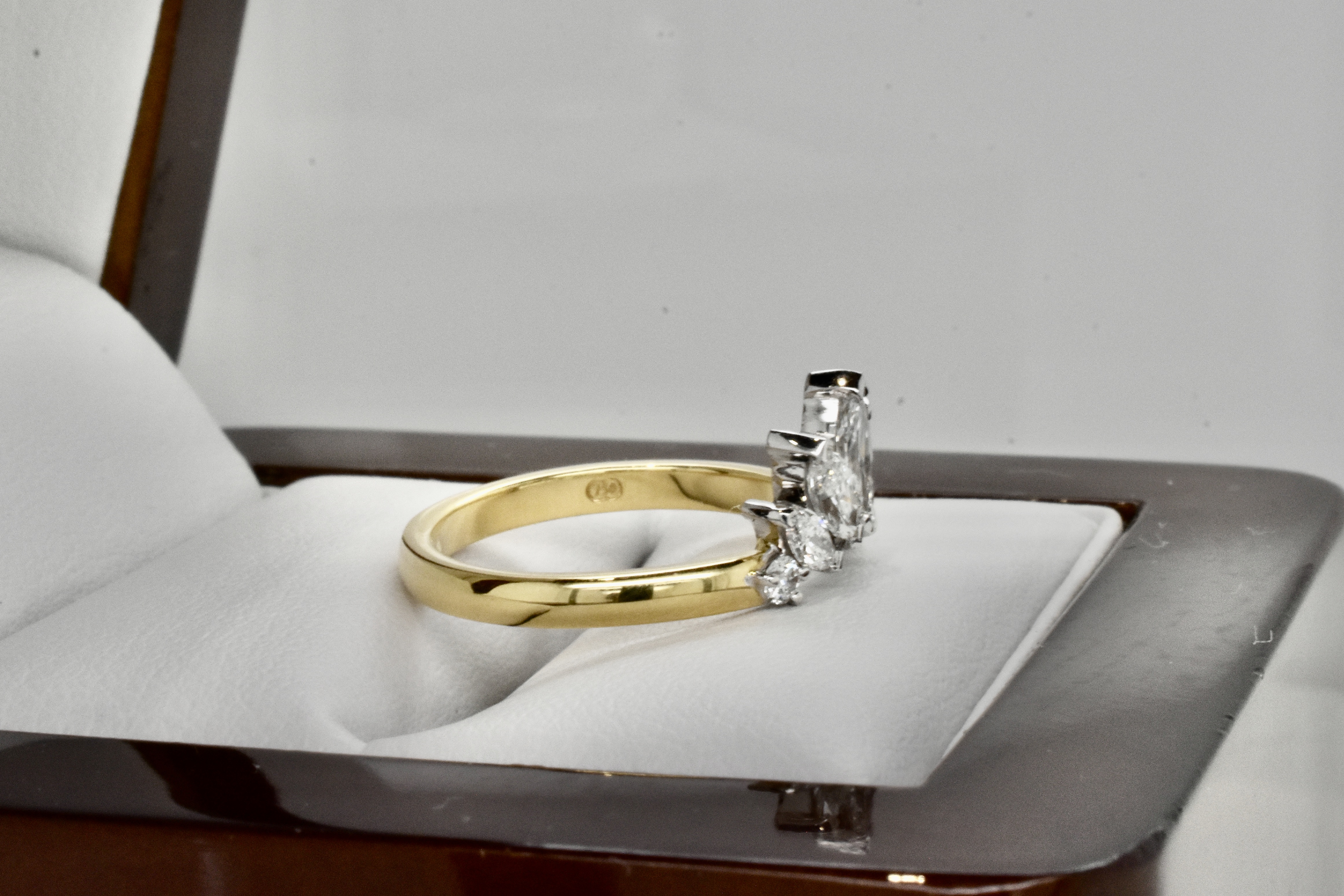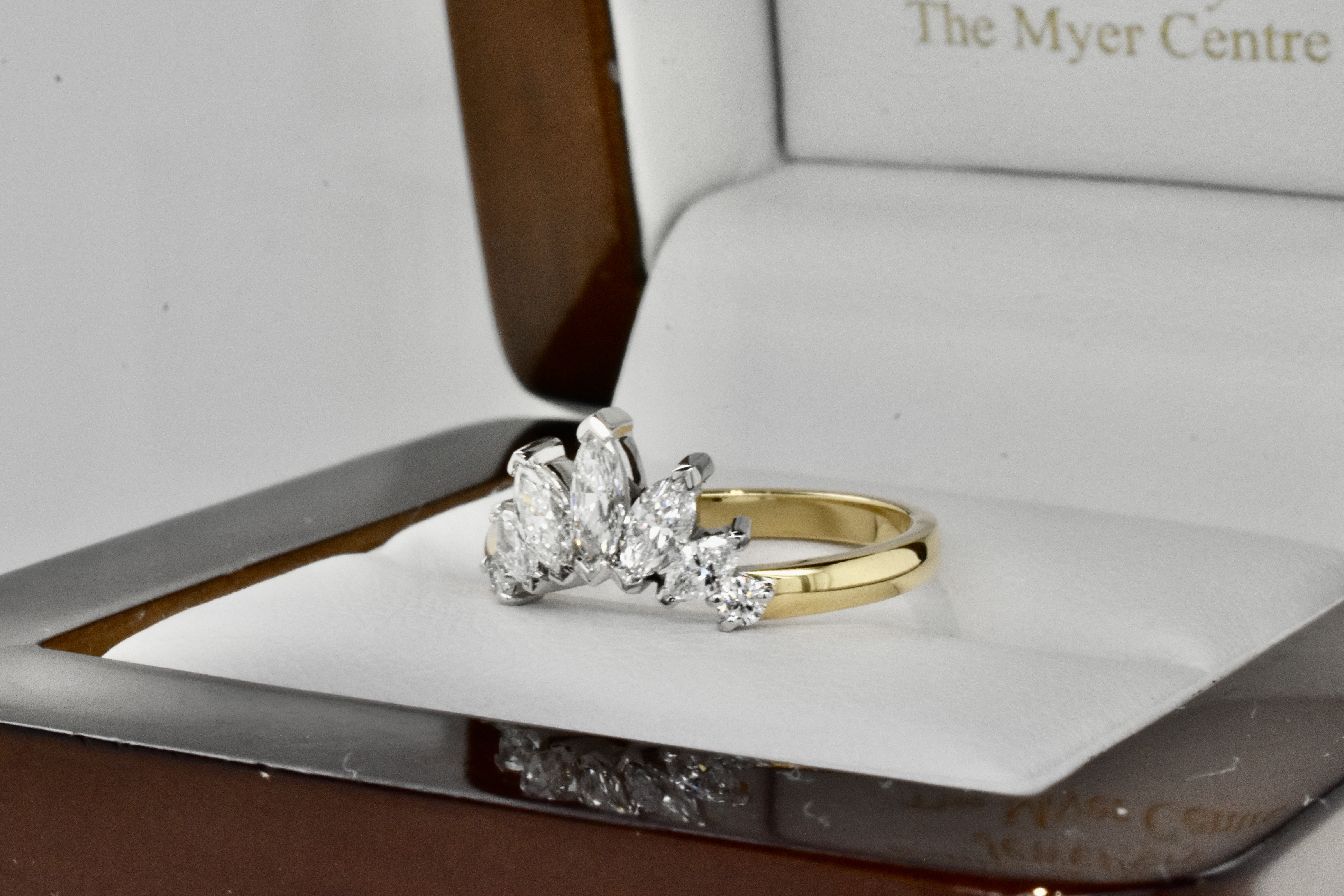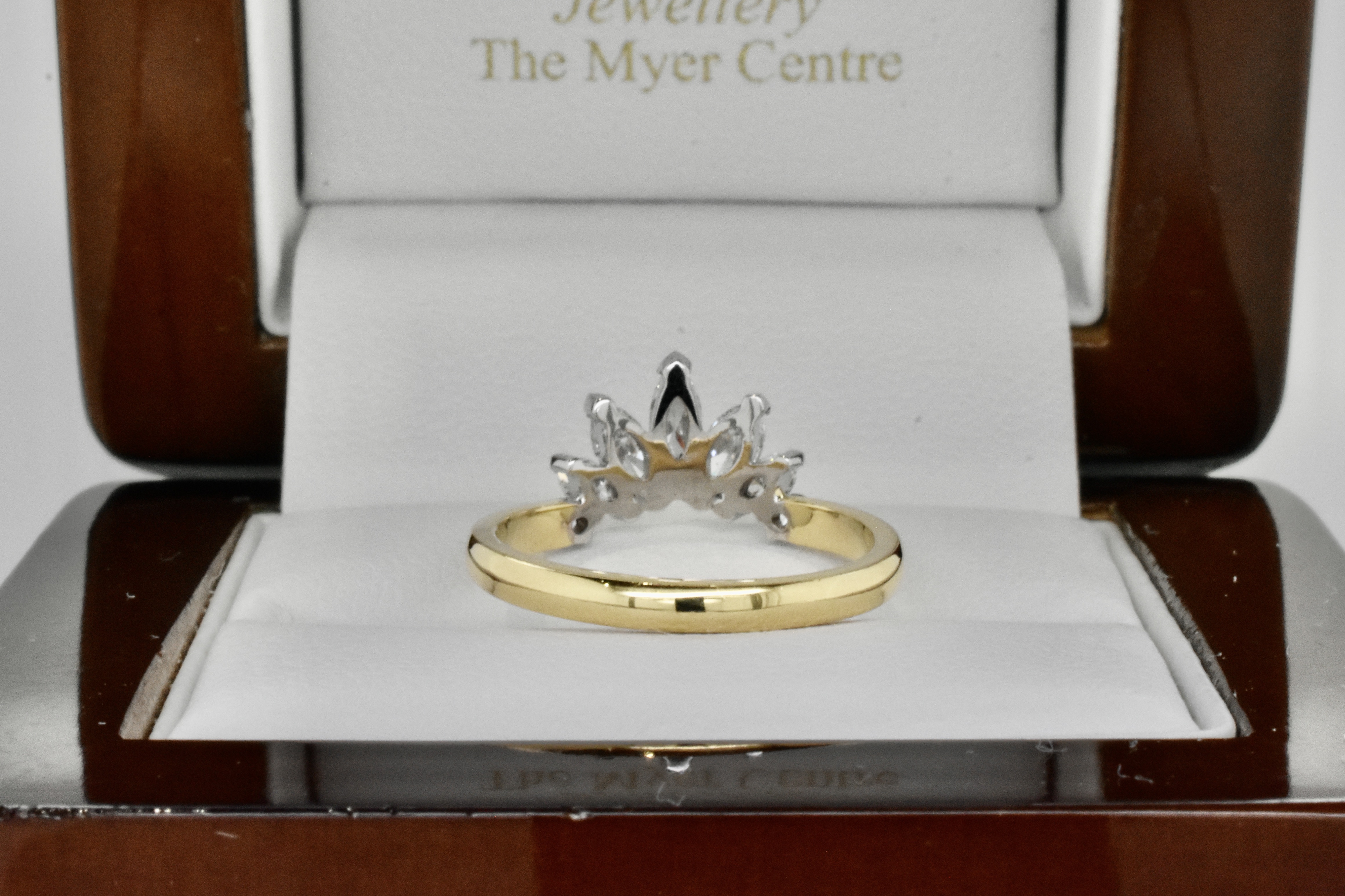 Designed to fit snuggly with our clients beautiful oval diamond engagement ring this fitted band has been expertly crafted in 18ct yellow gold with white gold settings and features five graduated marquise cut diamonds totalling 0.50cts with a shimmering round brilliant cut diamond set at each end totalling 0.06cts. Independent Valuation Supplied.