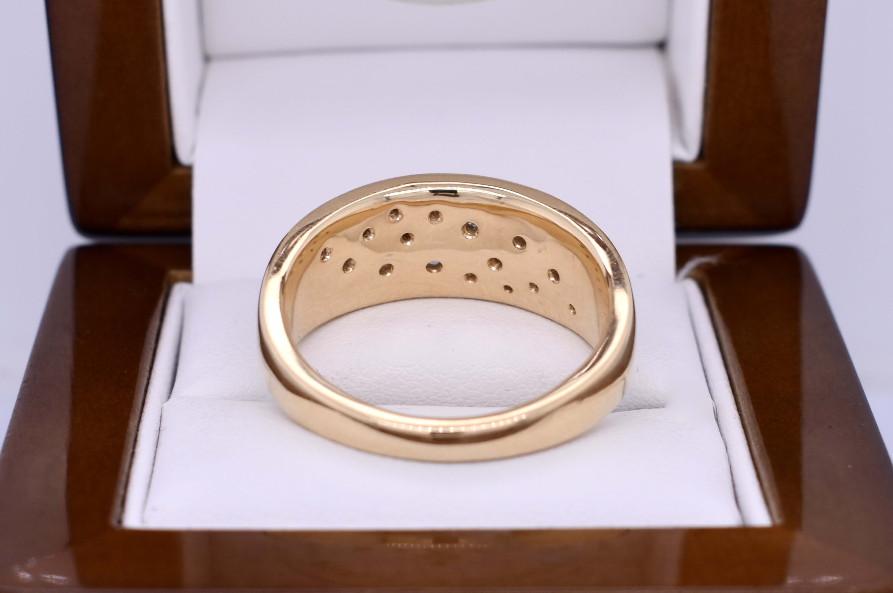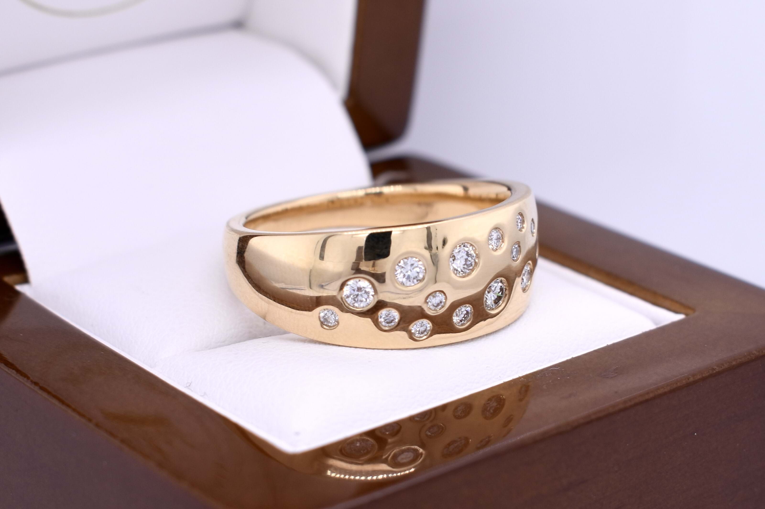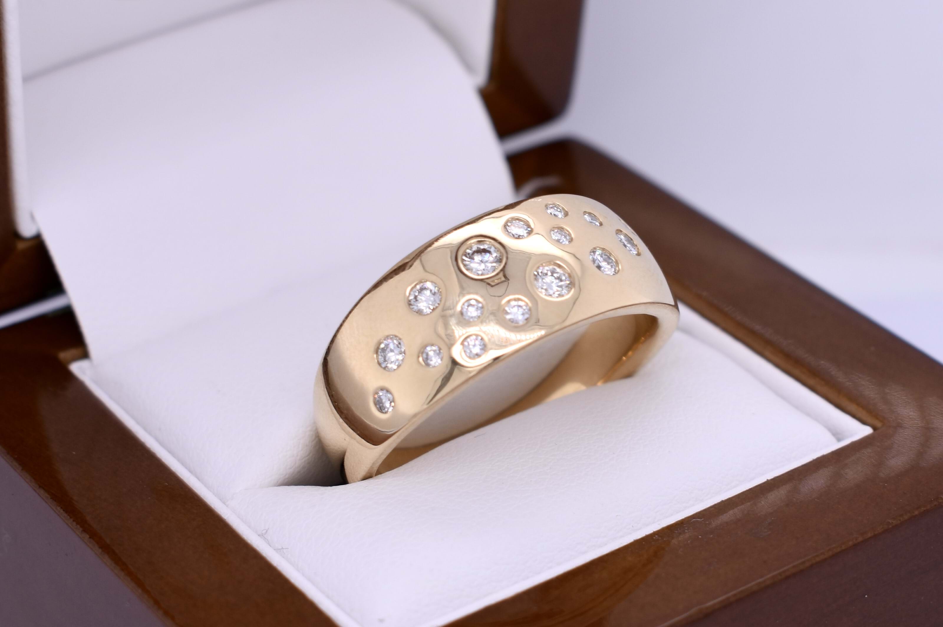 Classic, 10mm wide 18ct yellow gold band with 16 varying size round brilliant cut diamonds scattered across the wide section of the band, tapering to 3mm at base for comfort. This band can be ordered in different finger sizes and metal colours. Independent Valuation Supplied.