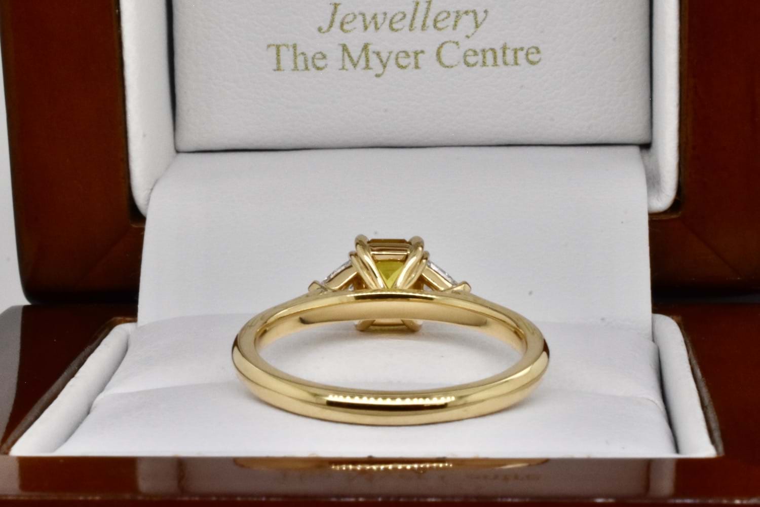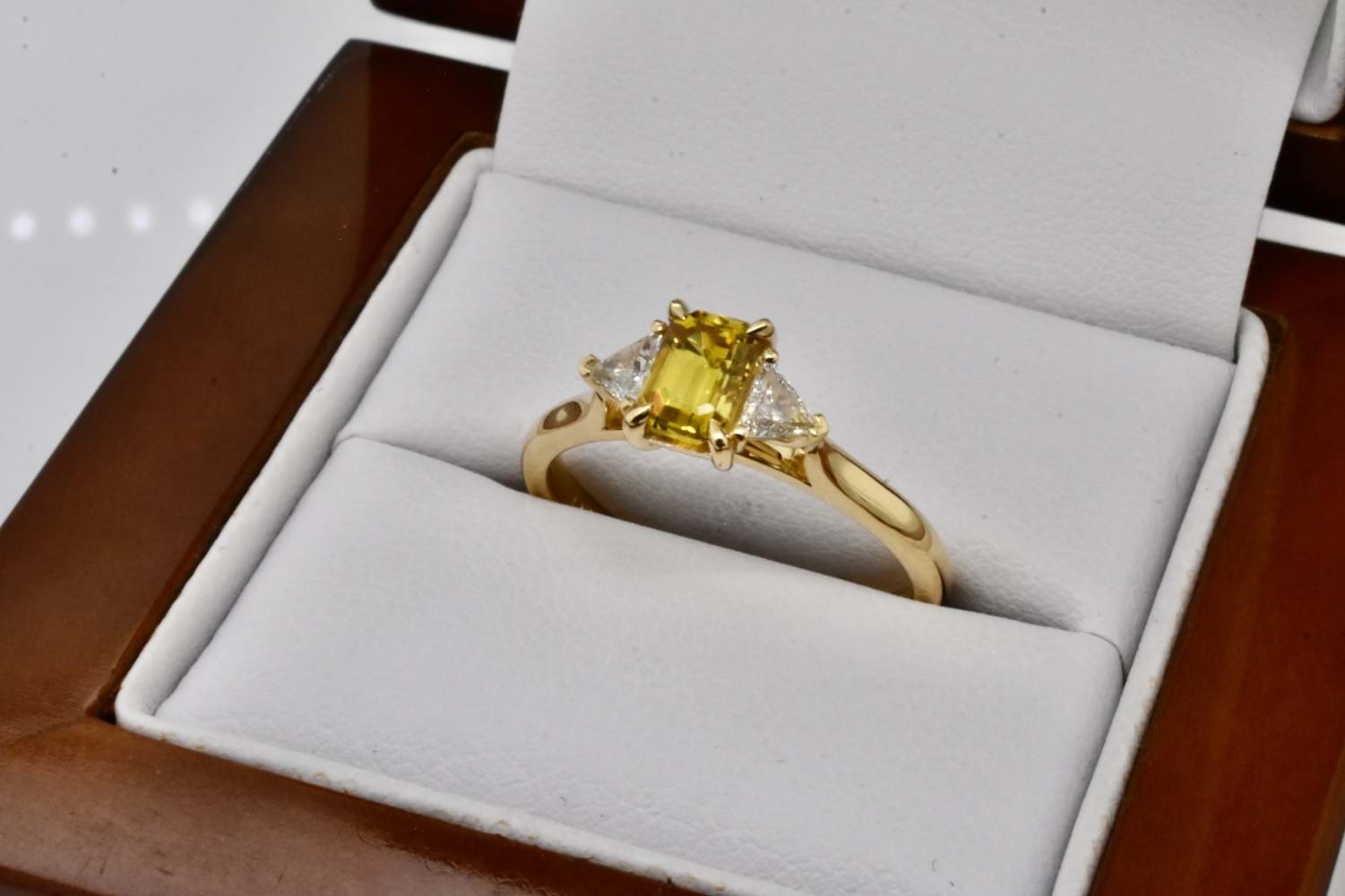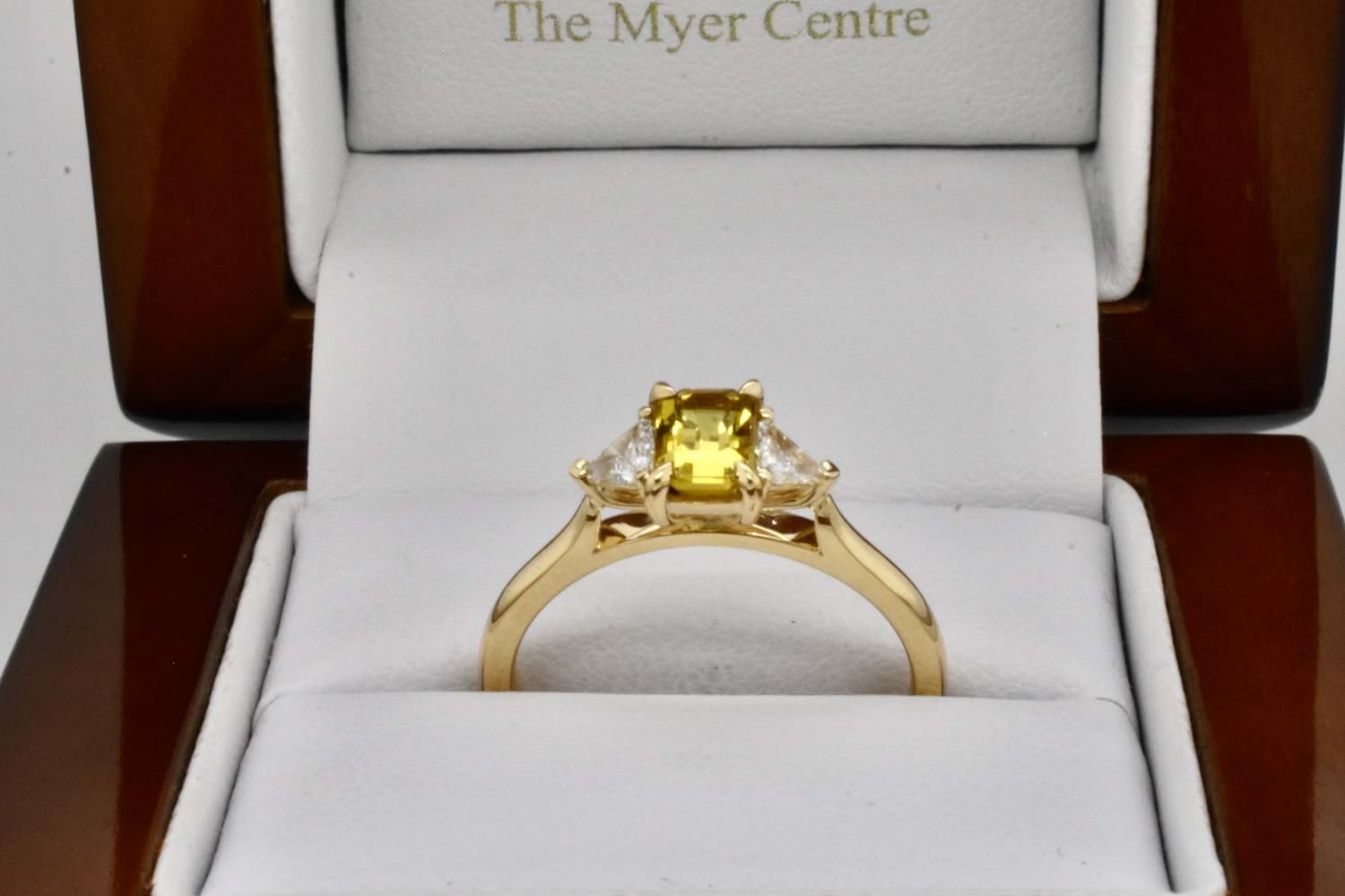 A gorgeous, unheated, 0.81ct emerald cut Australian yellow sapphire selected as a loose stone along with the shimmering trilliant cut diamond accent stones and crafted in our workshop into this stunning 18ct yellow gold trilogy engagement ring. The diamonds total 0.21cts and the ring has been designed to sit flat with a wedding band. Independent Valuation Supplied.