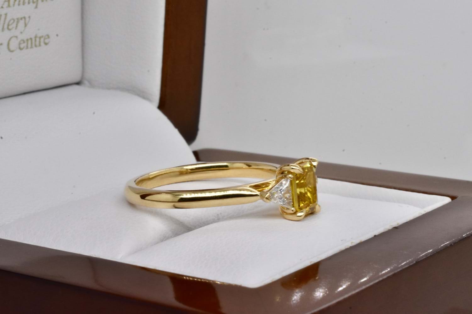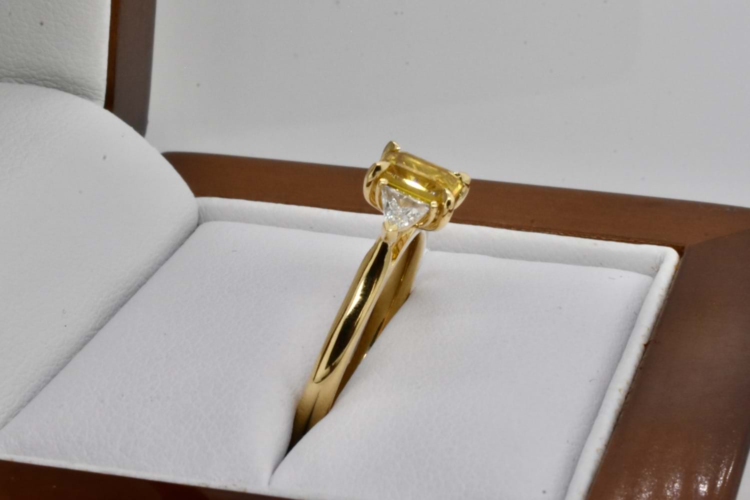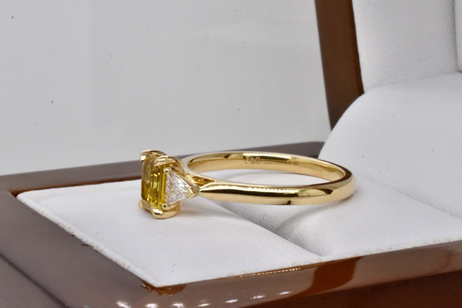 A gorgeous, unheated, 0.81ct emerald cut Australian yellow sapphire selected as a loose stone along with the shimmering trilliant cut diamond accent stones and crafted in our workshop into this stunning 18ct yellow gold trilogy engagement ring. The diamonds total 0.21cts and the ring has been designed to sit flat with a wedding band. Independent Valuation Supplied.
