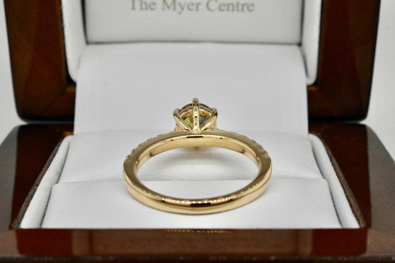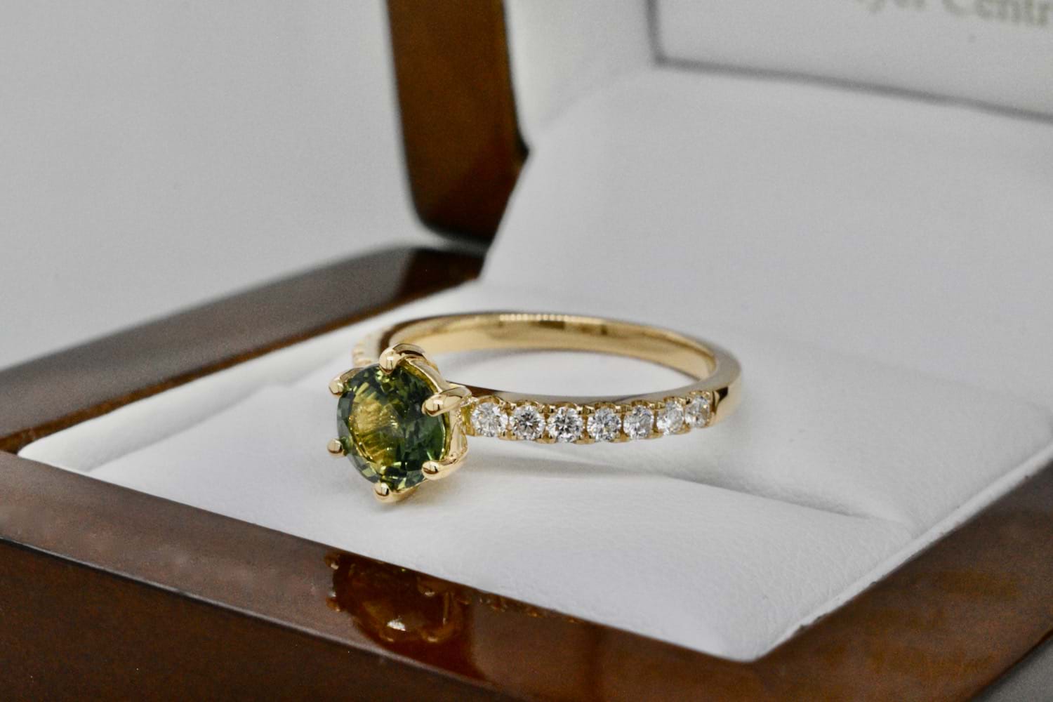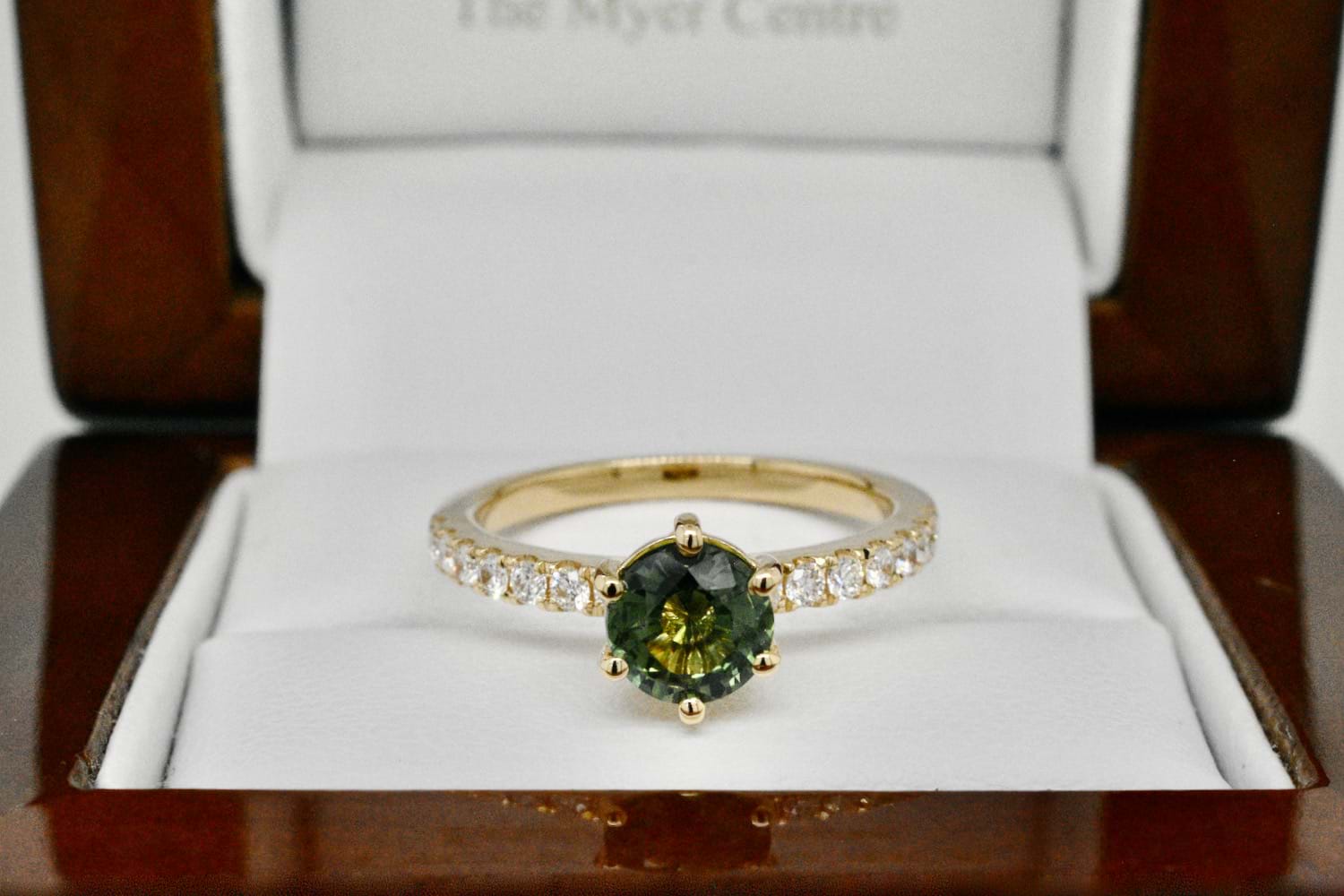 This stunning 1.10ct Australian sapphire was hand chosen in store by our clients for its gorgeous yellow blueish green colour, it has been six claw set into an 18ct yellow gold ring with 14 sparkling round brilliant cut diamonds totalling 0.30ct GVS/SI. Independent Valuation Supplied. This bespoke creation is being enjoyed by its new owner, if you are inspired by this archived design contact us today to discuss how we can create something incredible for you or your loved one.