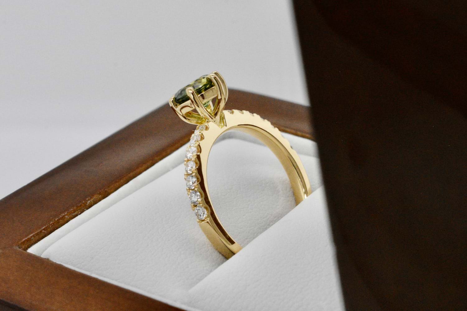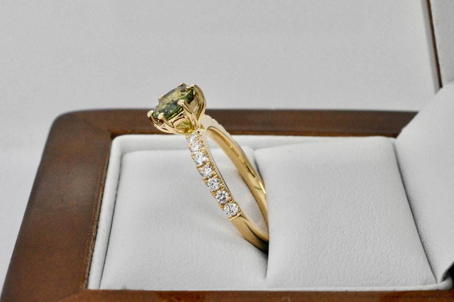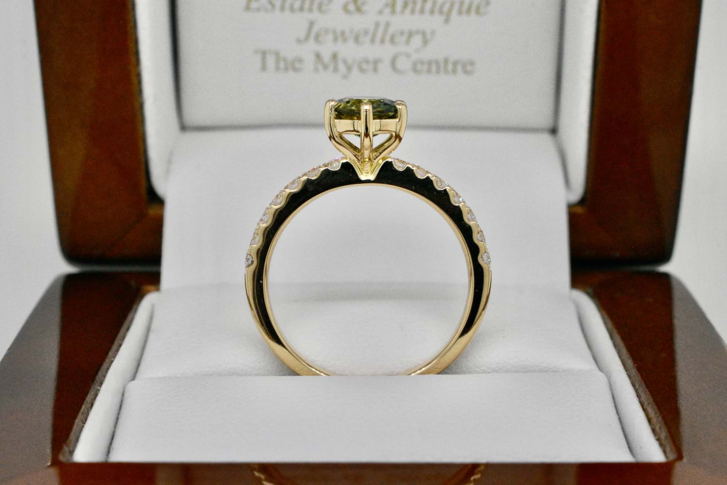 This stunning 1.10ct Australian sapphire was hand chosen in store by our clients for its gorgeous yellow blueish green colour, it has been six claw set into an 18ct yellow gold ring with 14 sparkling round brilliant cut diamonds totalling 0.30ct GVS/SI. Independent Valuation Supplied. This bespoke creation is being enjoyed by its new owner, if you are inspired by this archived design contact us today to discuss how we can create something incredible for you or your loved one.