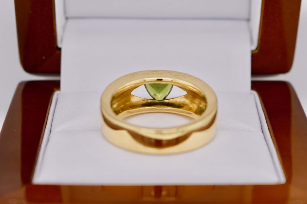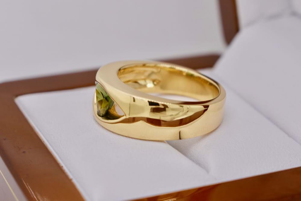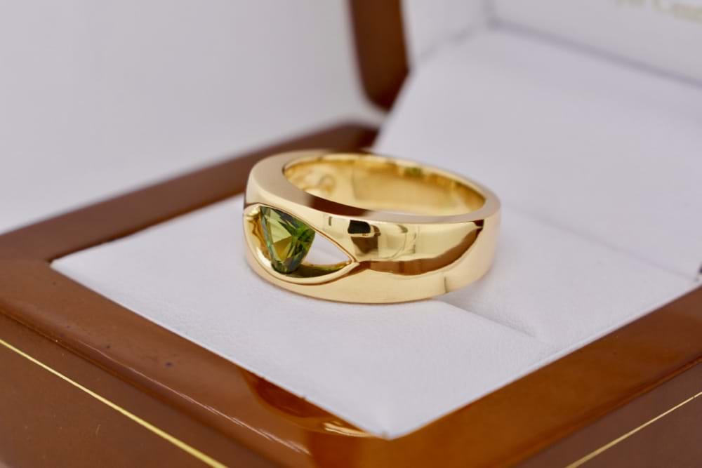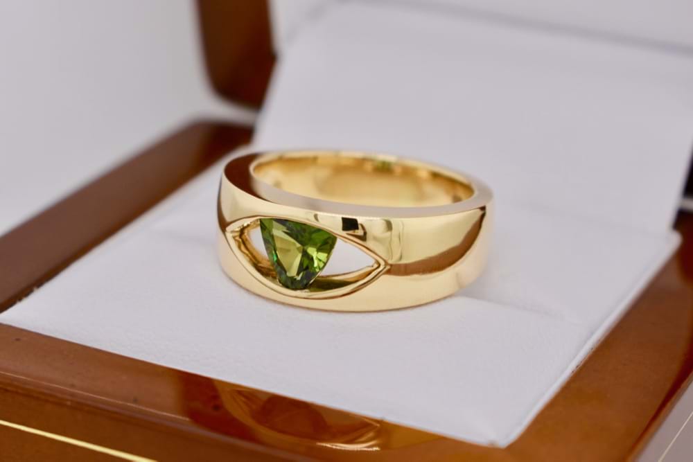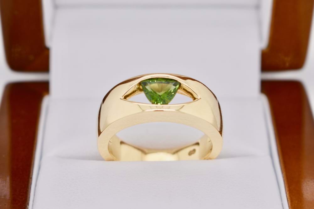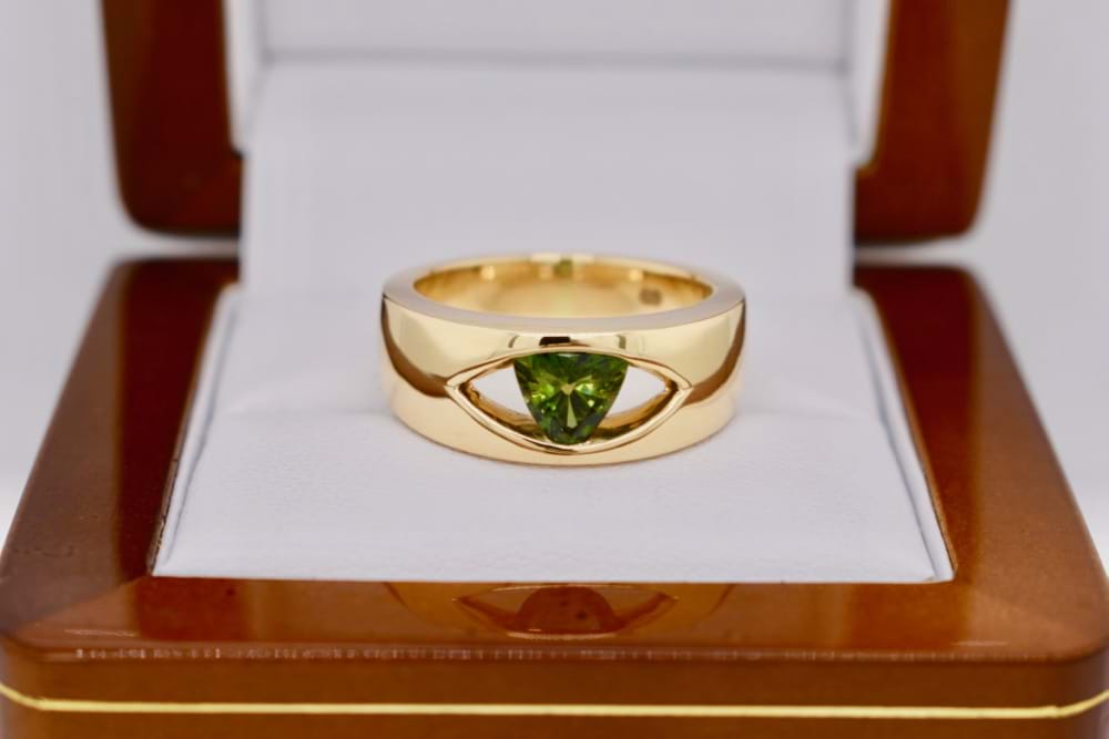 This innovative and striking design has been handcrafted in 18ct yellow gold to give the illusion that the trilliant cut sapphire is just floating in the space. The sapphire is 1.10ct, Australian origin, and a beautiful green colour. If you are inspired by this archived design contact us today to discuss how we can create something incredible for you or your loved one.