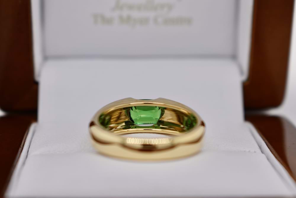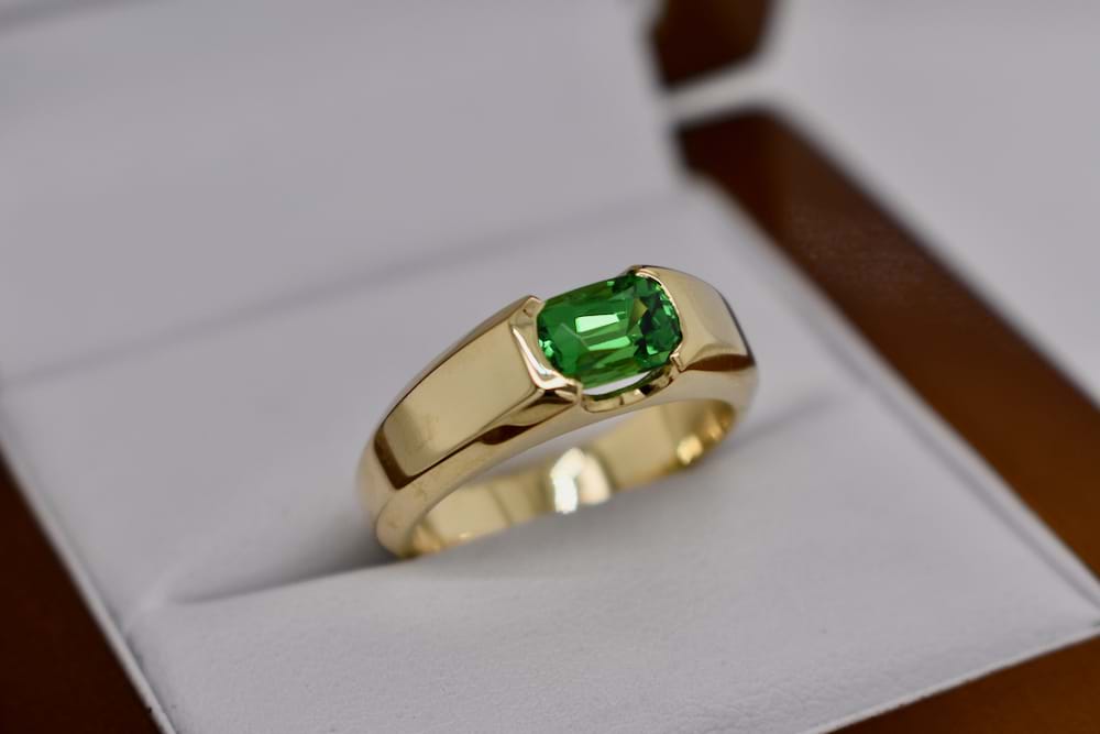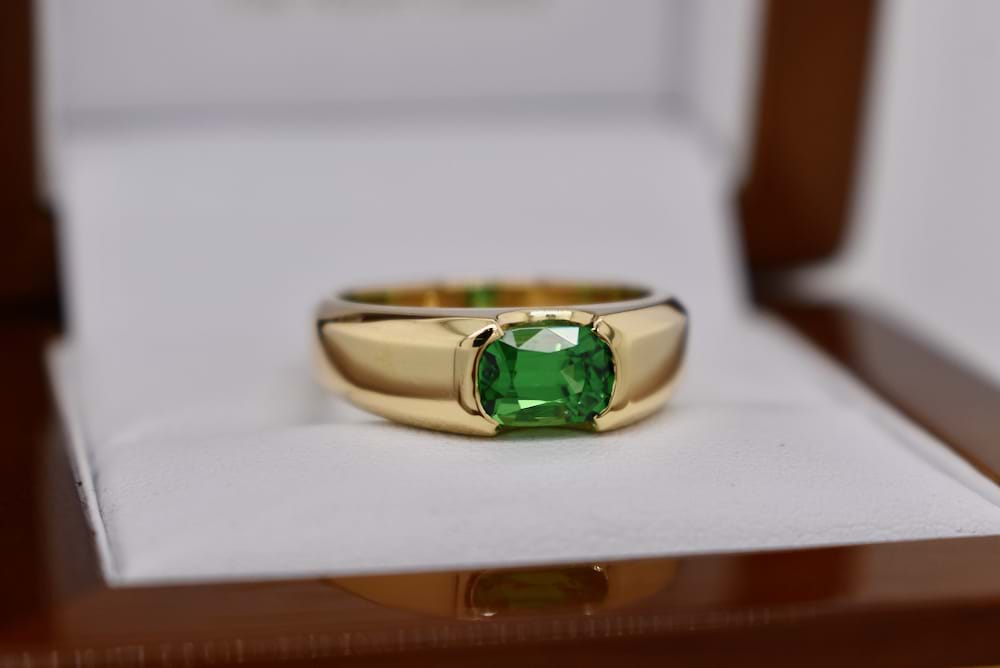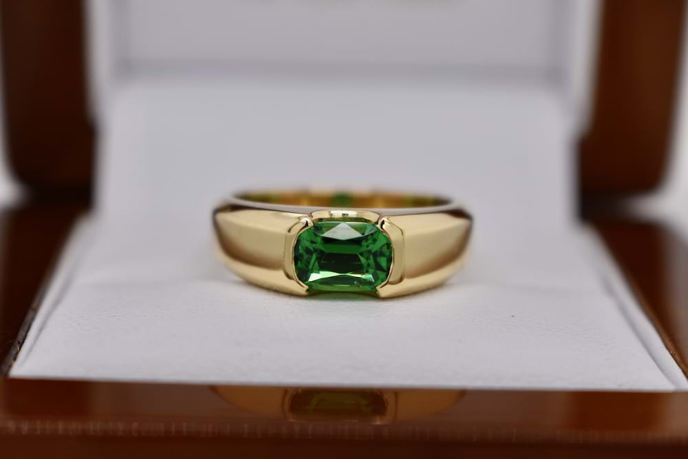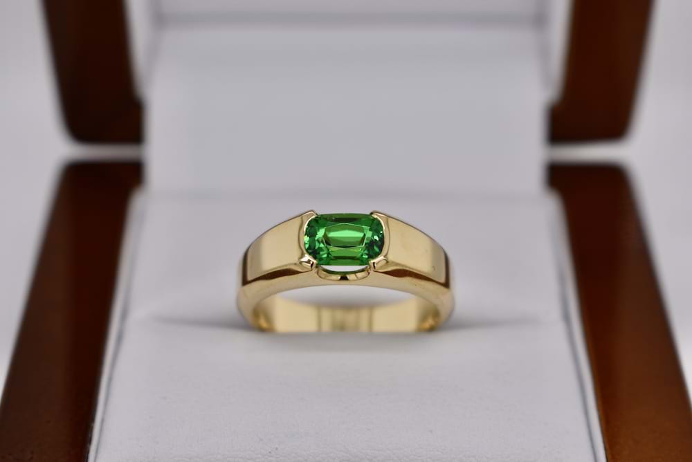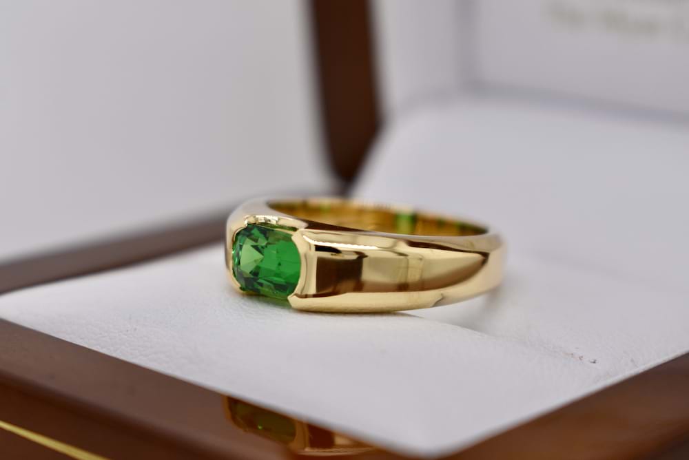This totally scintillating Tsavorite garnet of 1.21cts was selected with great care to be the feature of this striking and elegant gentleman's ring. Beautifully crafted in our workshop in 18ct yellow gold the vivid green of the garnet is both complimented and contrasted by the intense yellow tone of the gold. This bespoke creation is being enjoyed by its new owner, if you are inspired by this archived design contact us today to discuss how we can create something incredible for you or your loved one.