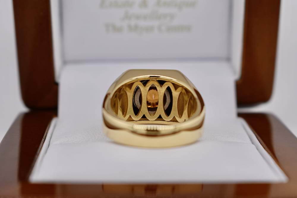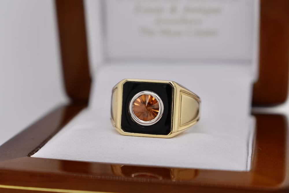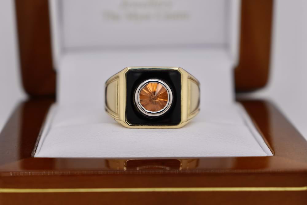 This unusual spin top cut orange zircon is 1.28cts and has been 18ct white gold bezel set into a custom piece of flat black onyx with an 18ct yellow gold surround and tapered shoulders. A striking gents dress ring with an intriguing centre stone. This bespoke creation is being enjoyed by its new owner, if you are inspired by this archived design contact us today to discuss how we can create something incredible for you or your loved one.