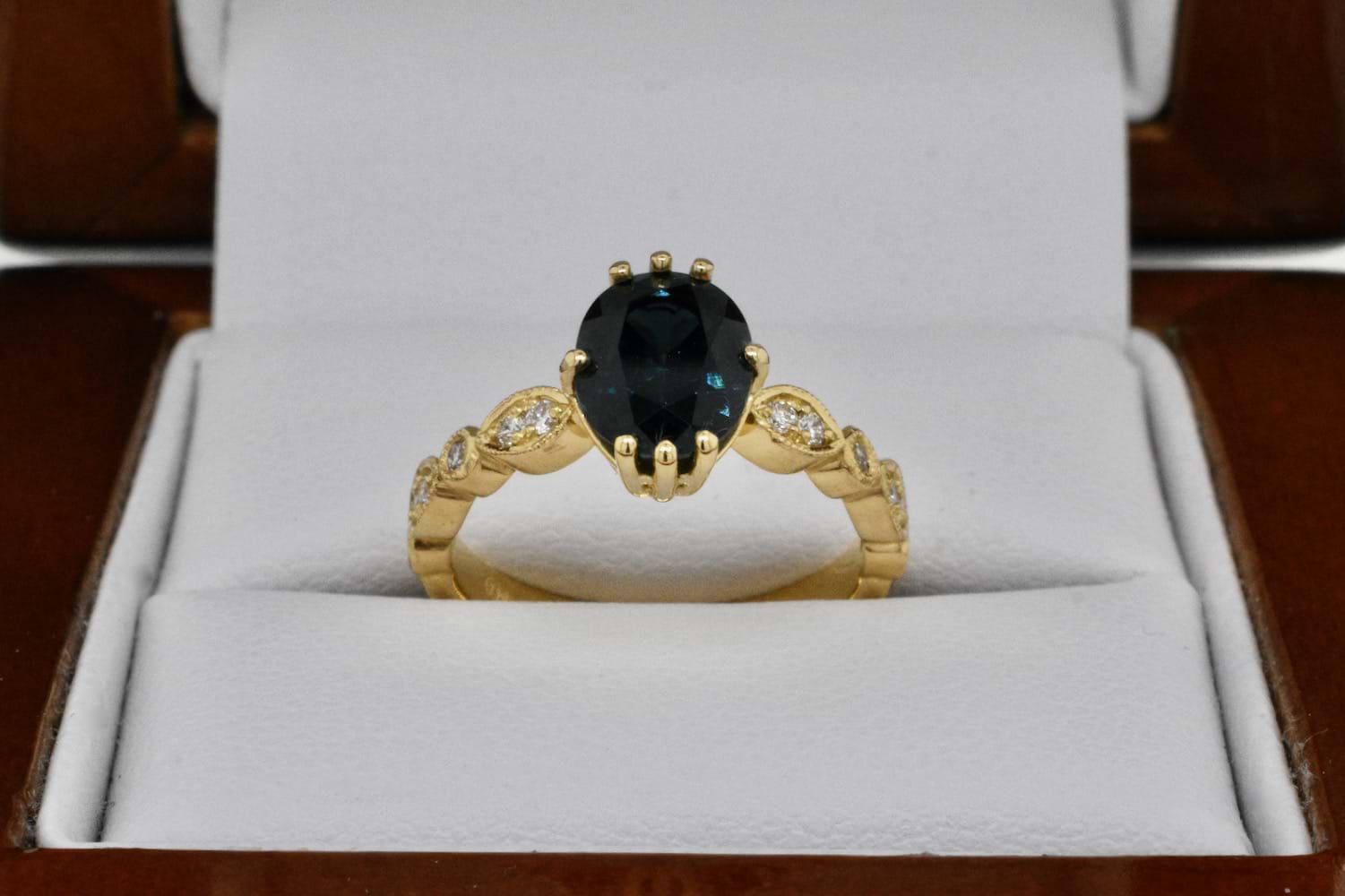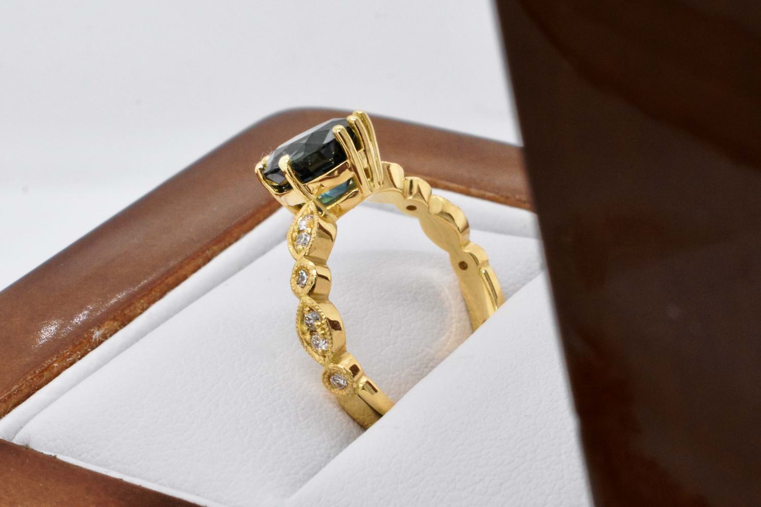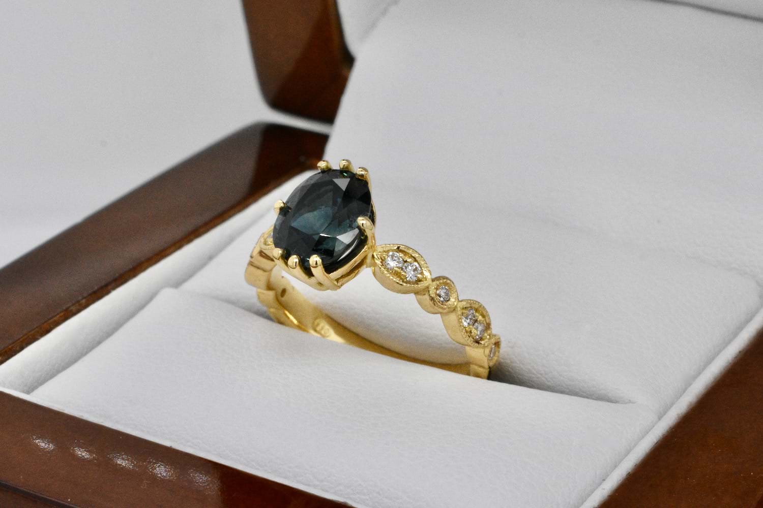 A gorgeous bespoke designed engagement ring crafted in 18ct yellow gold featuring a beautiful teal 1.70ct Australian sapphire chosen in store by our clients. The ring was also designed in store with our clients to meet all their design criteria, the sapphire is set with eight claws and the band has alternate shapes with shimmering round diamonds set into each mill grain bezel. Independent Valuation Supplied.