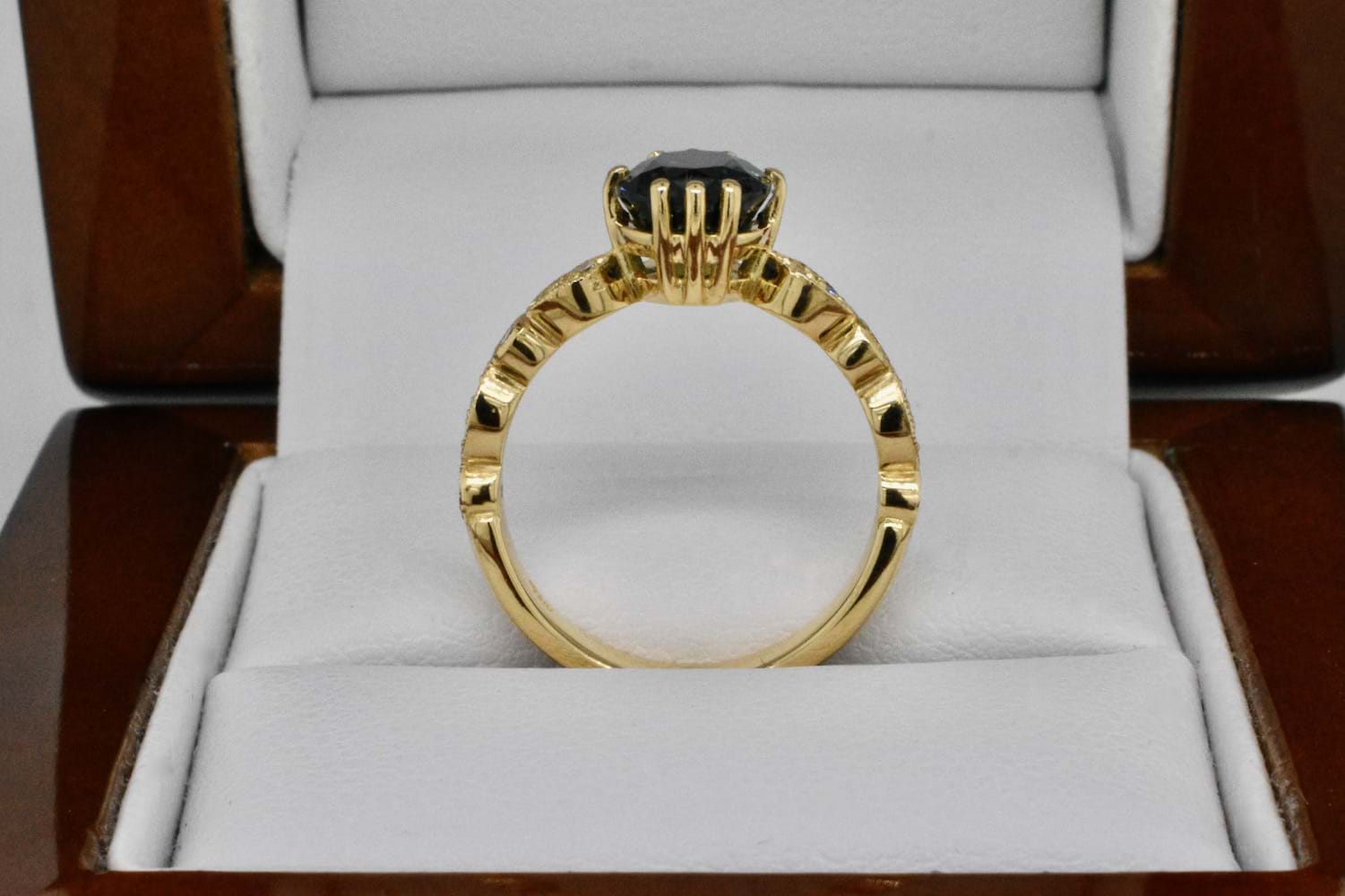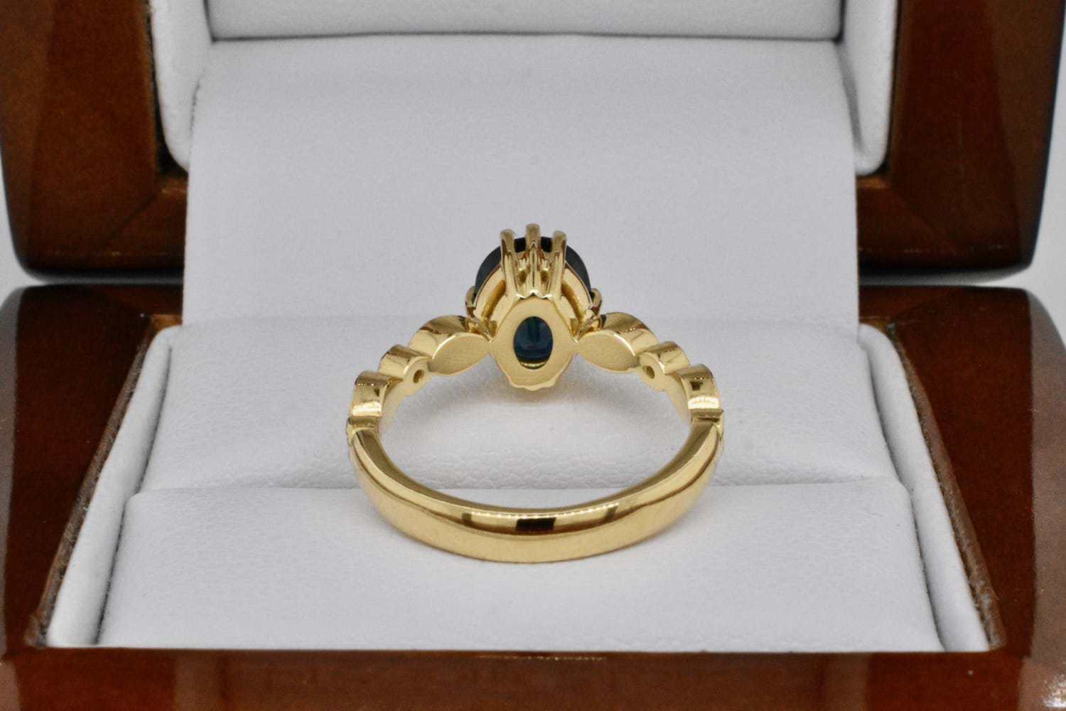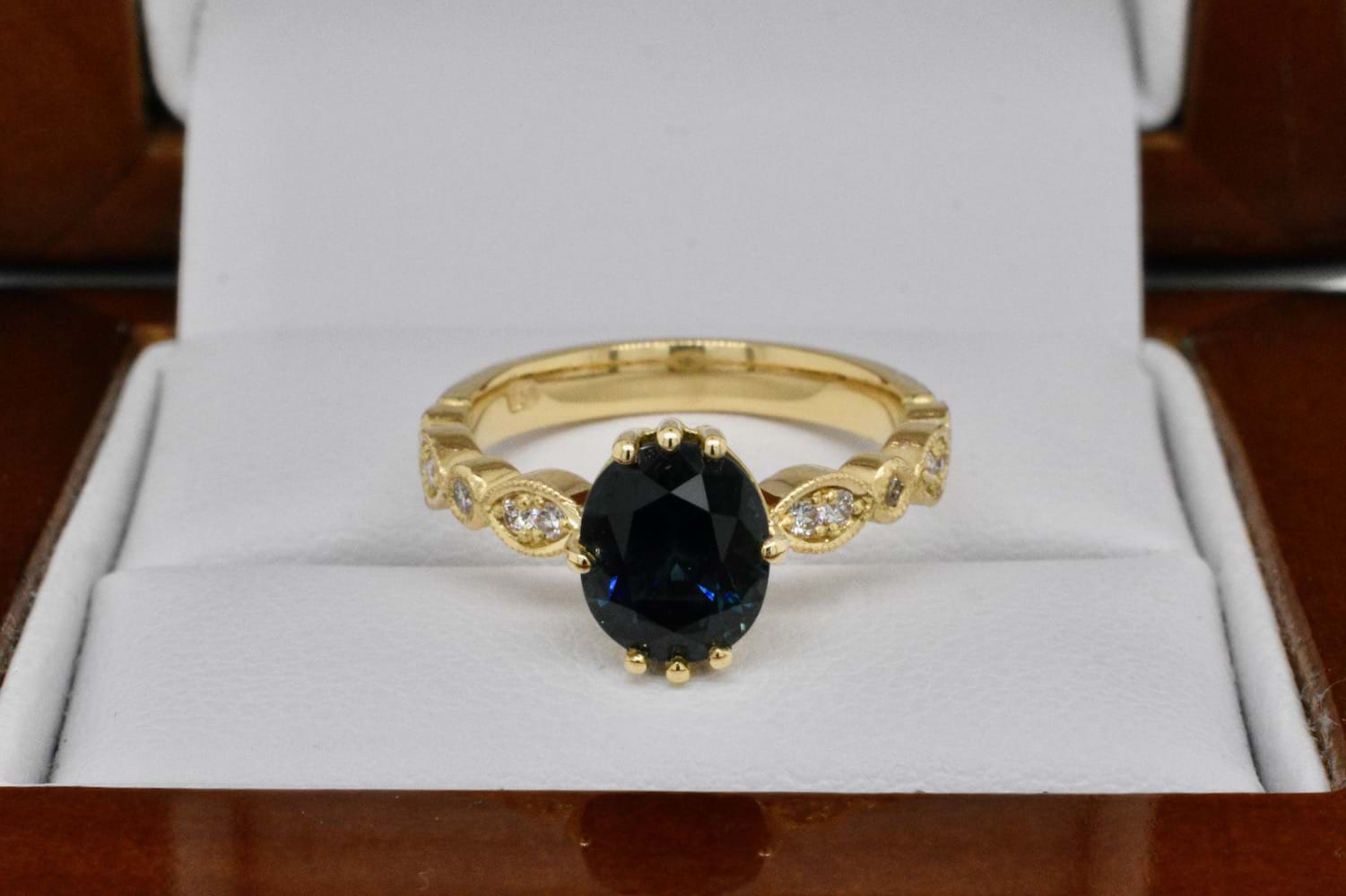 A gorgeous bespoke designed engagement ring crafted in 18ct yellow gold featuring a beautiful teal 1.70ct Australian sapphire chosen in store by our clients. The ring was also designed in store with our clients to meet all their design criteria, the sapphire is set with eight claws and the band has alternate shapes with shimmering round diamonds set into each mill grain bezel. Independent Valuation Supplied.
