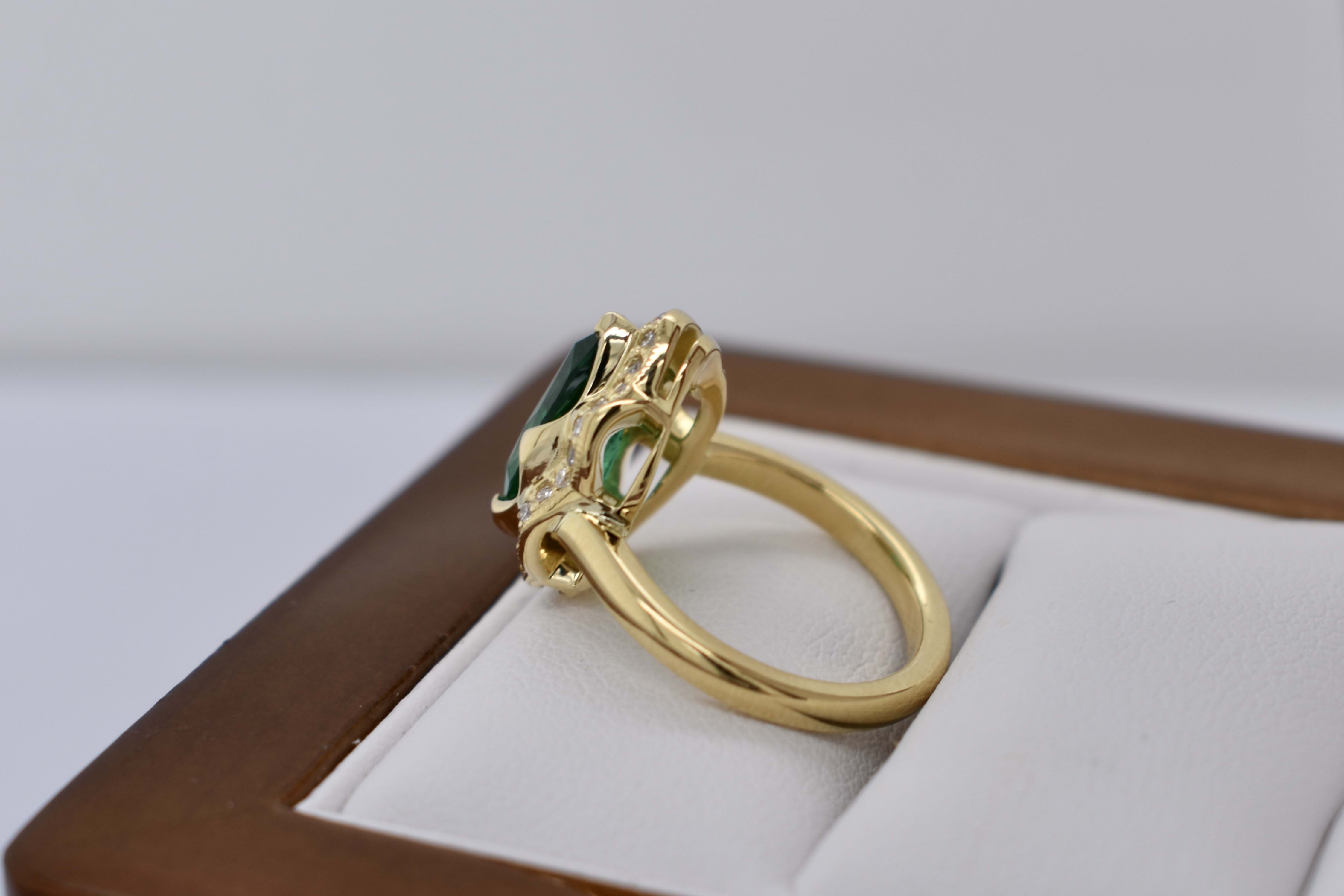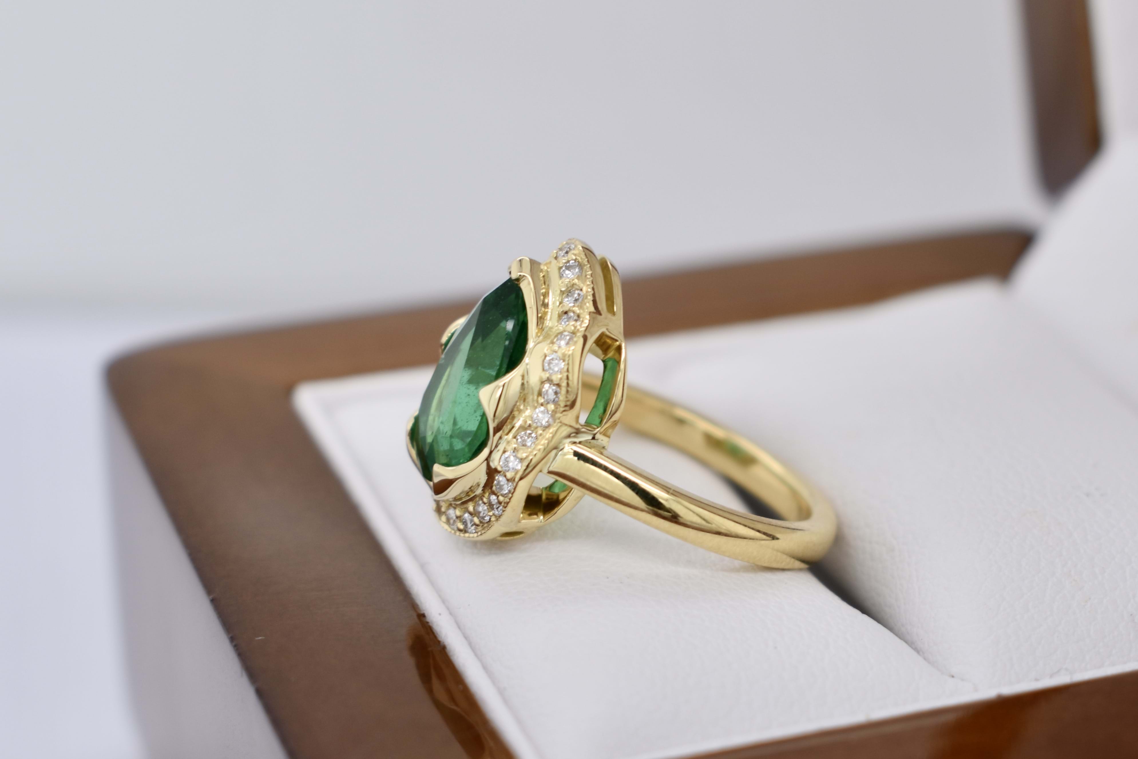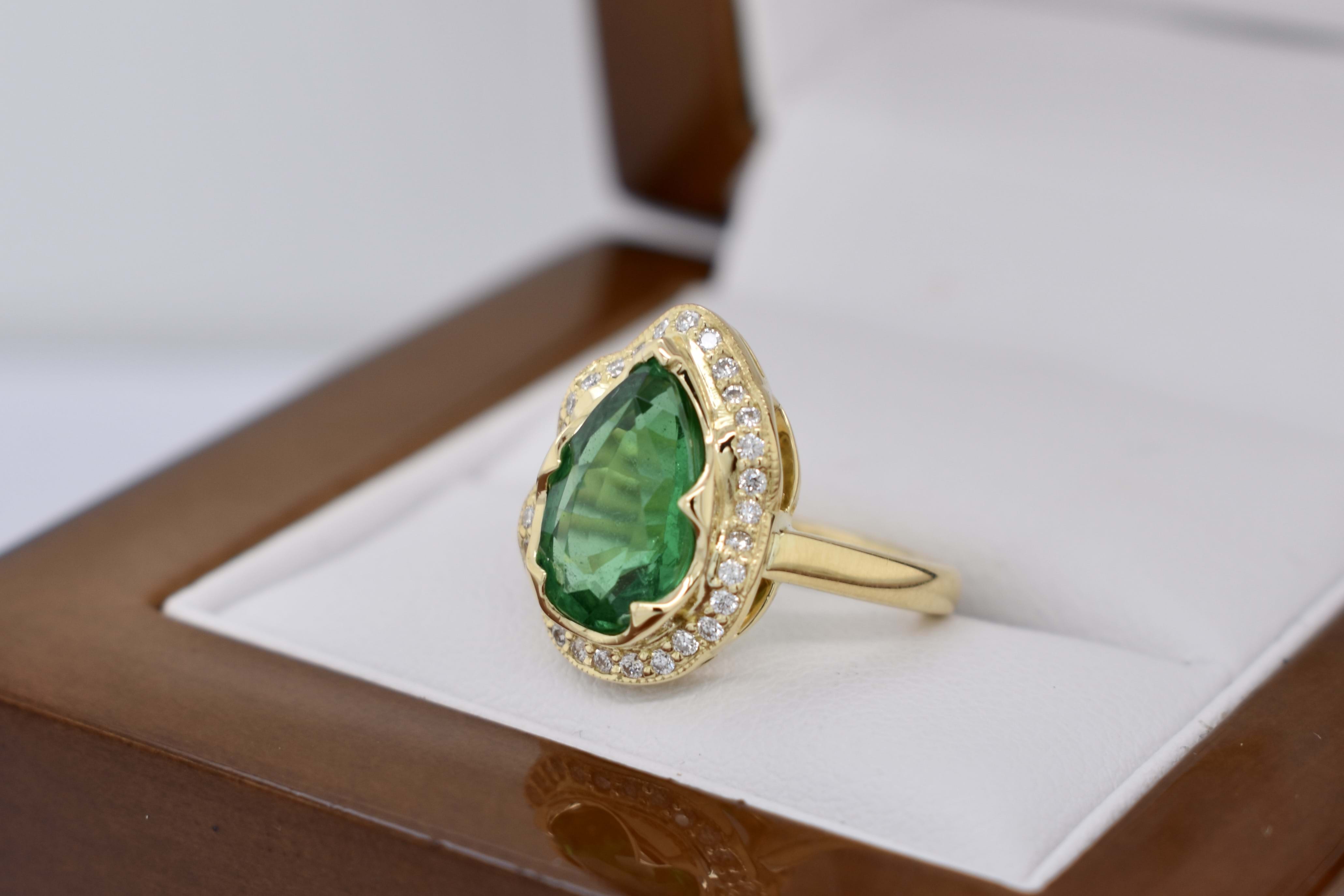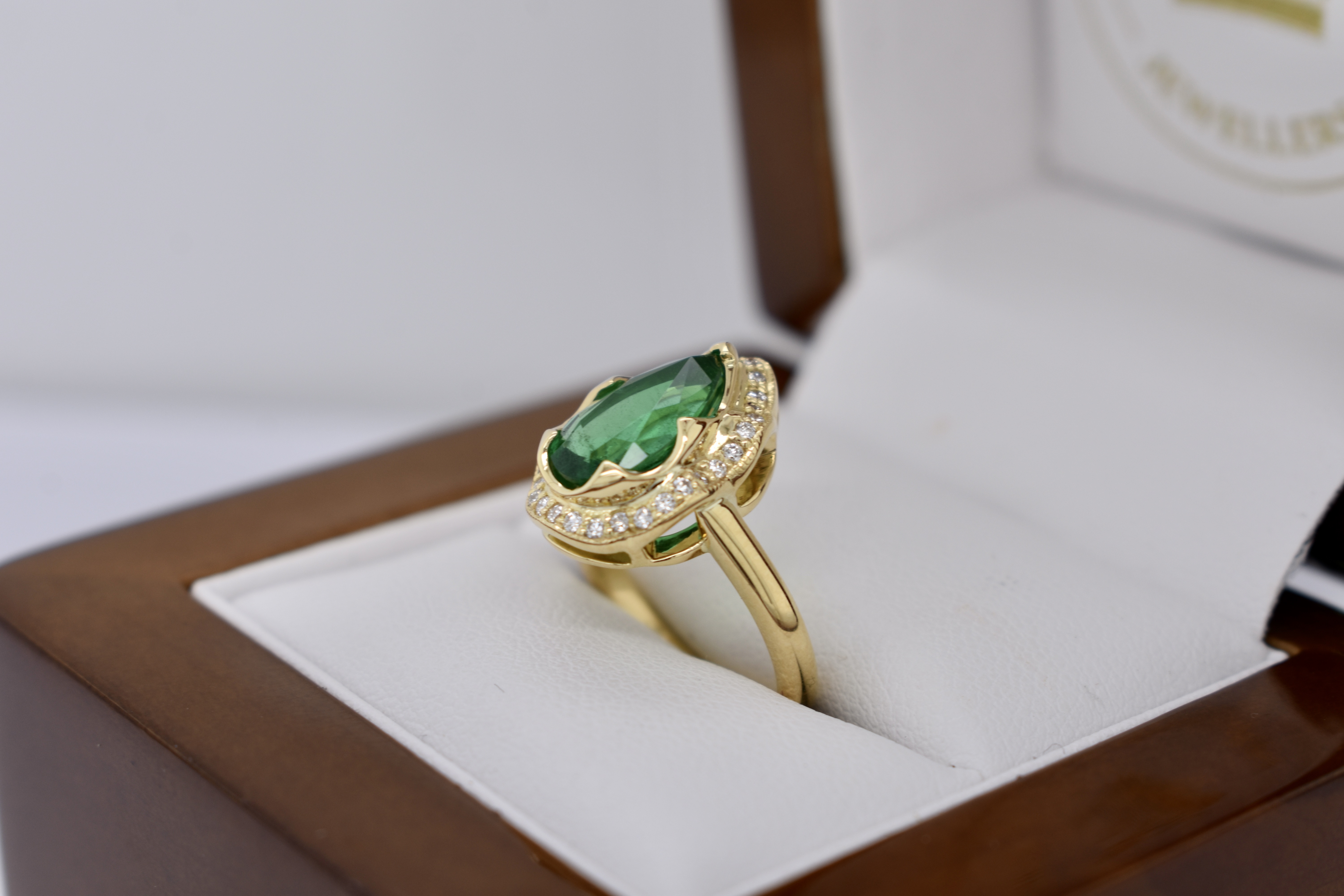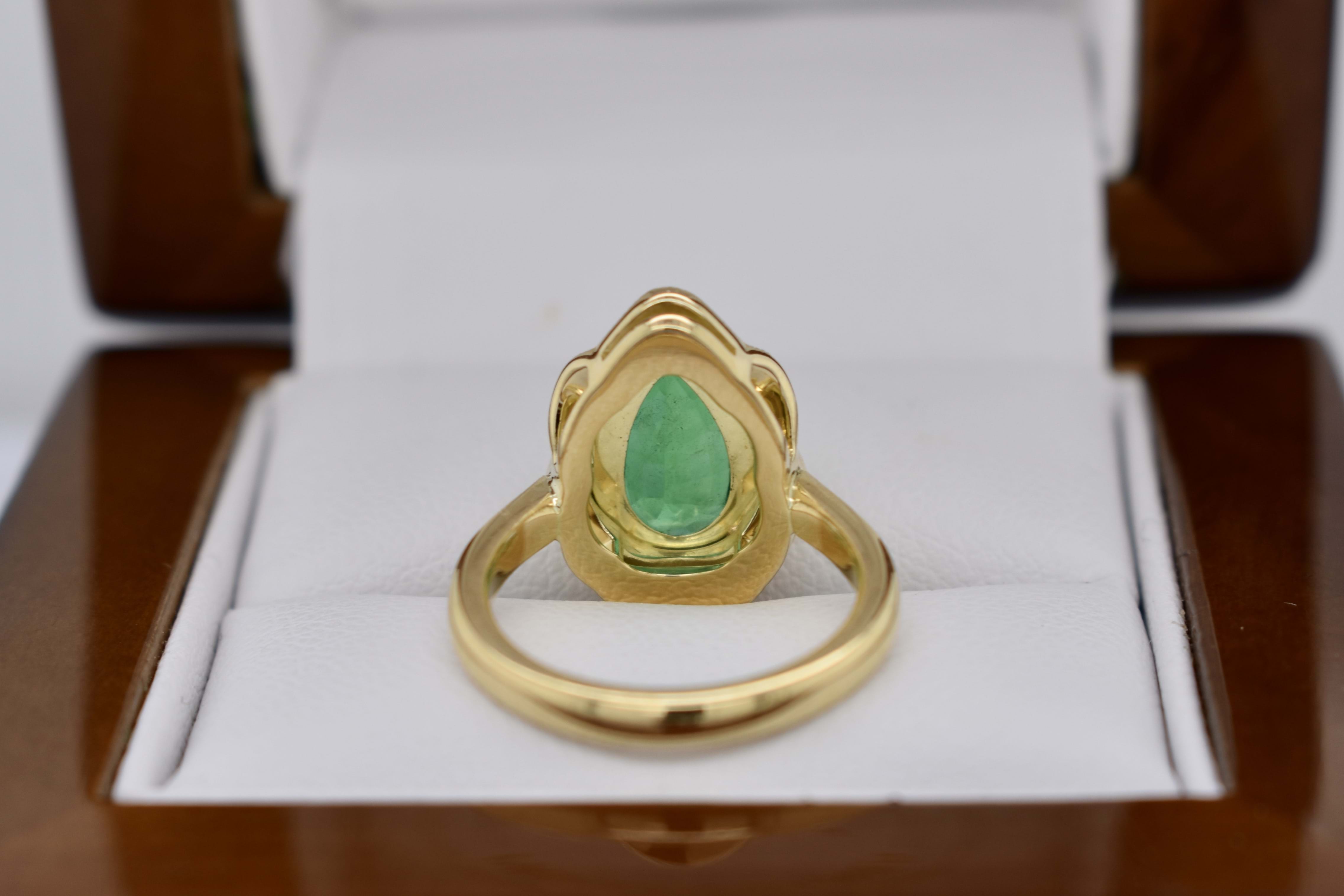 A spectacular and rare, bright mid-dark green, pearshape emerald of 1.76cts sourced for our client as the feature of their custom engagement ring. This beautiful piece was expertly crafted in our workshop in 18ct yellow gold and has a stunning flowing, sculpted halo of shimmering round brilliant cut diamonds totalling 0.17cts with a classic plain band. Independent Valuation Supplied.