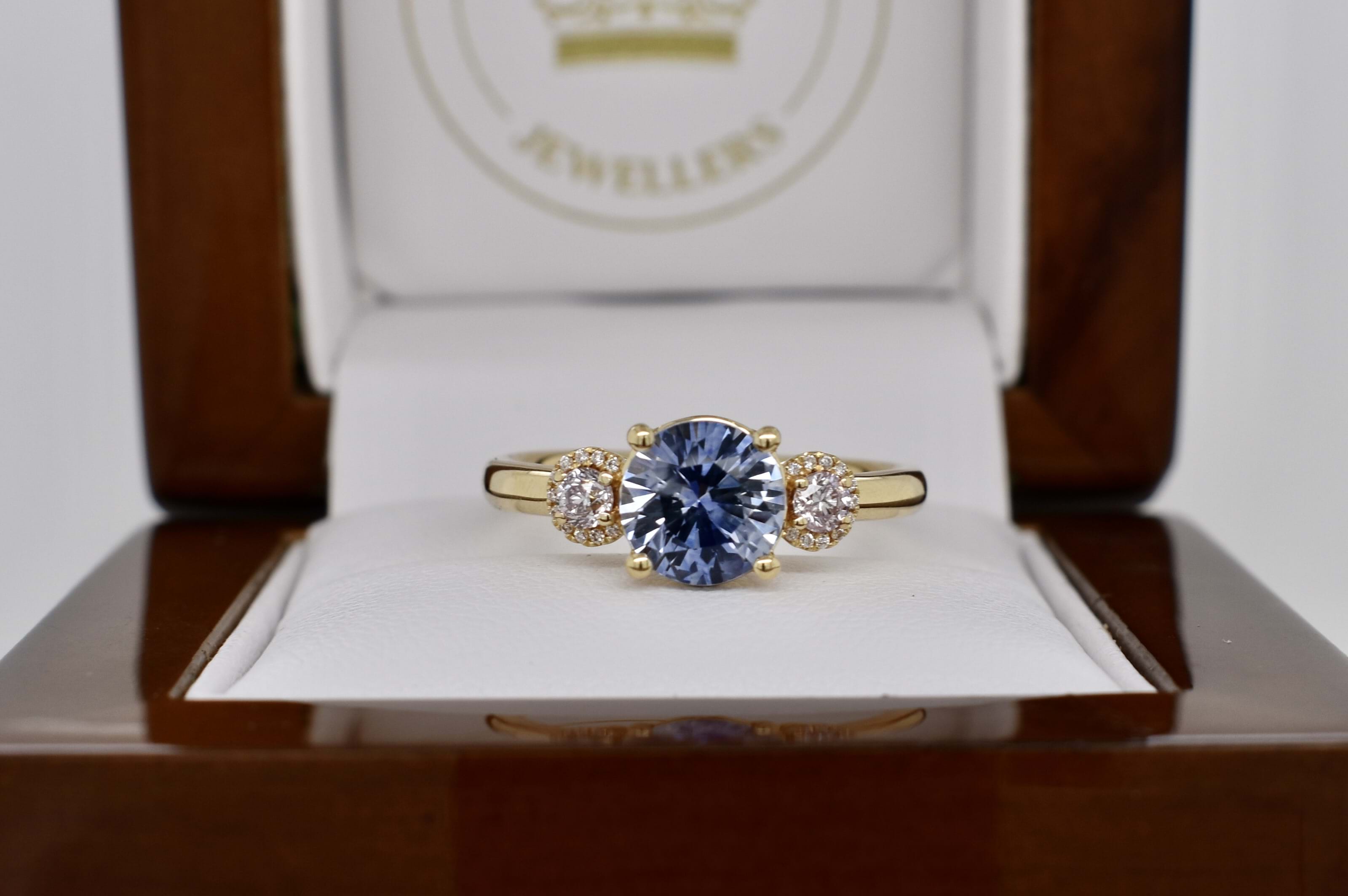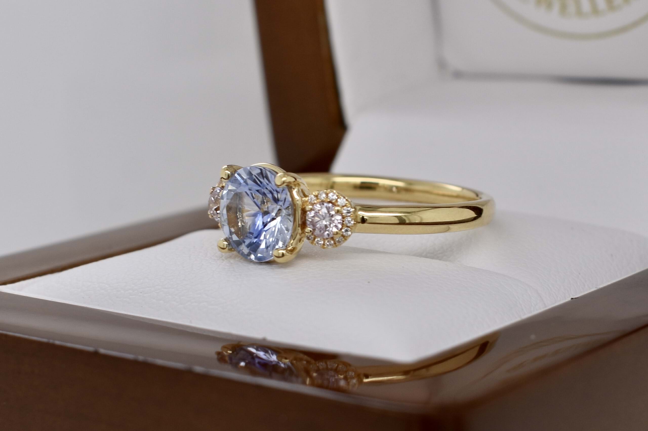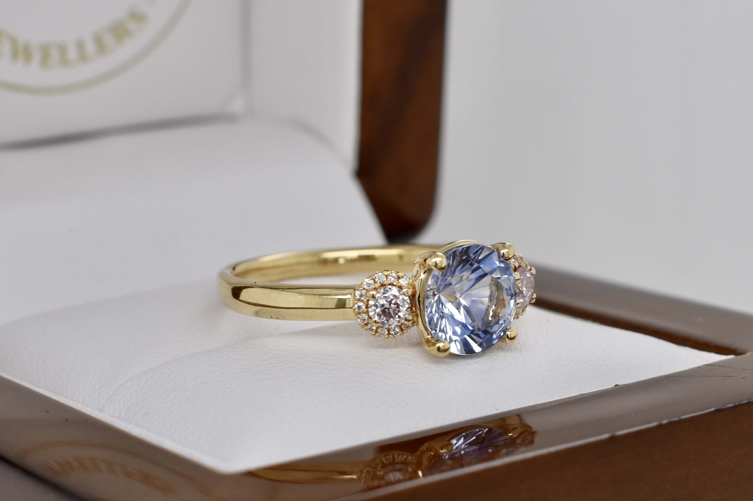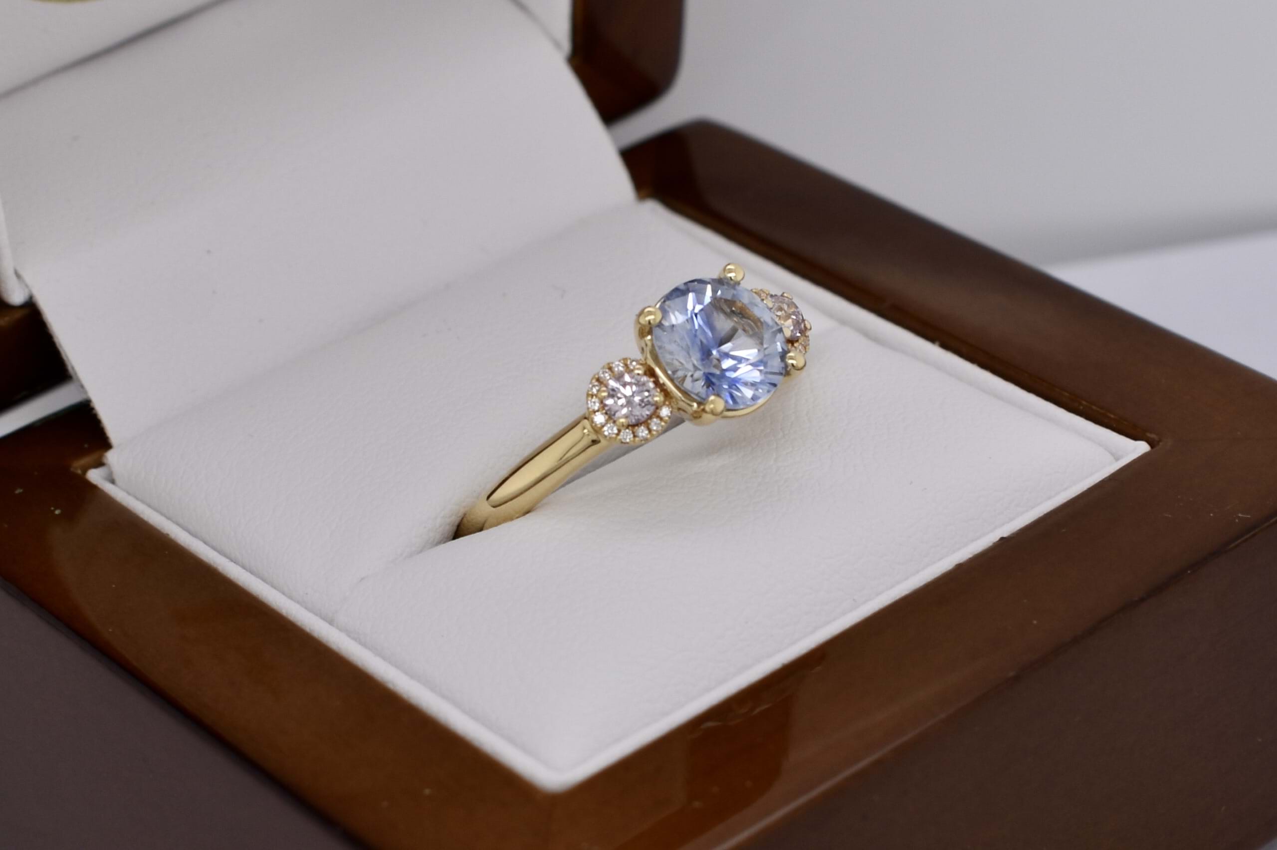 Featuring a 1.89ct light blue sapphire four claw set into this 18ct yellow gold ring with a shimmering pink diamond set on each side totaling 0.21ct in a halo of white diamonds totaling 0.06cts and a plain band. Independent Valuation Supplied.