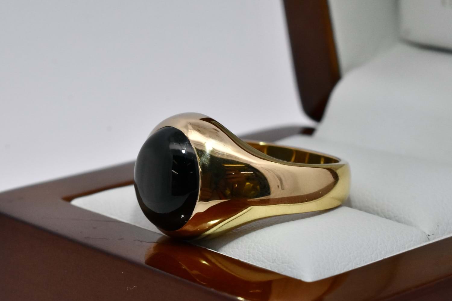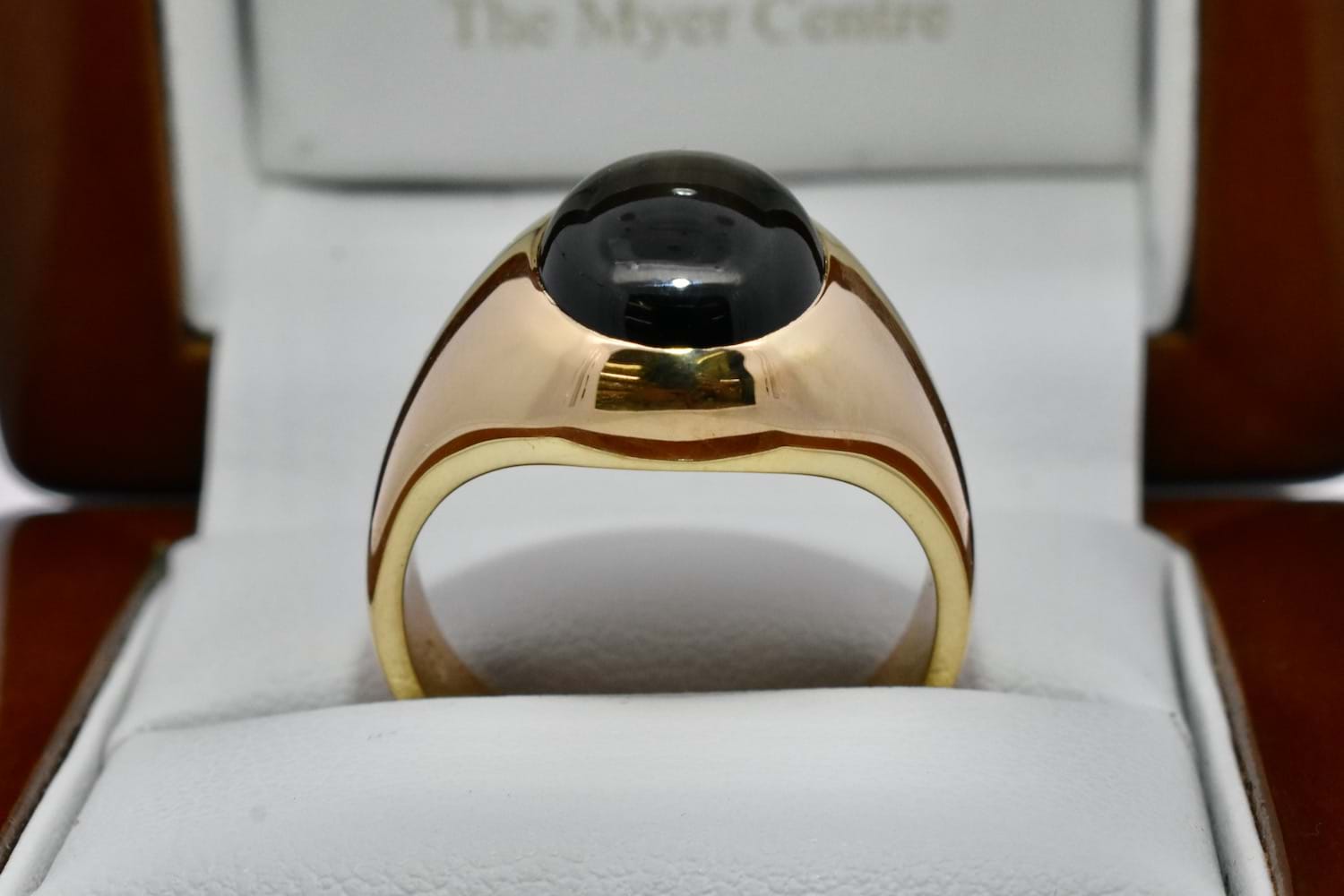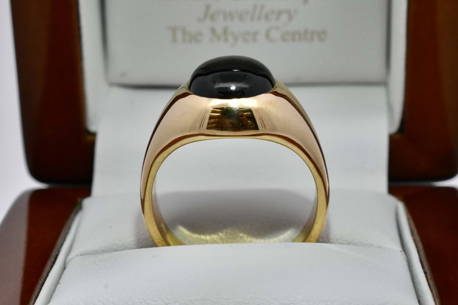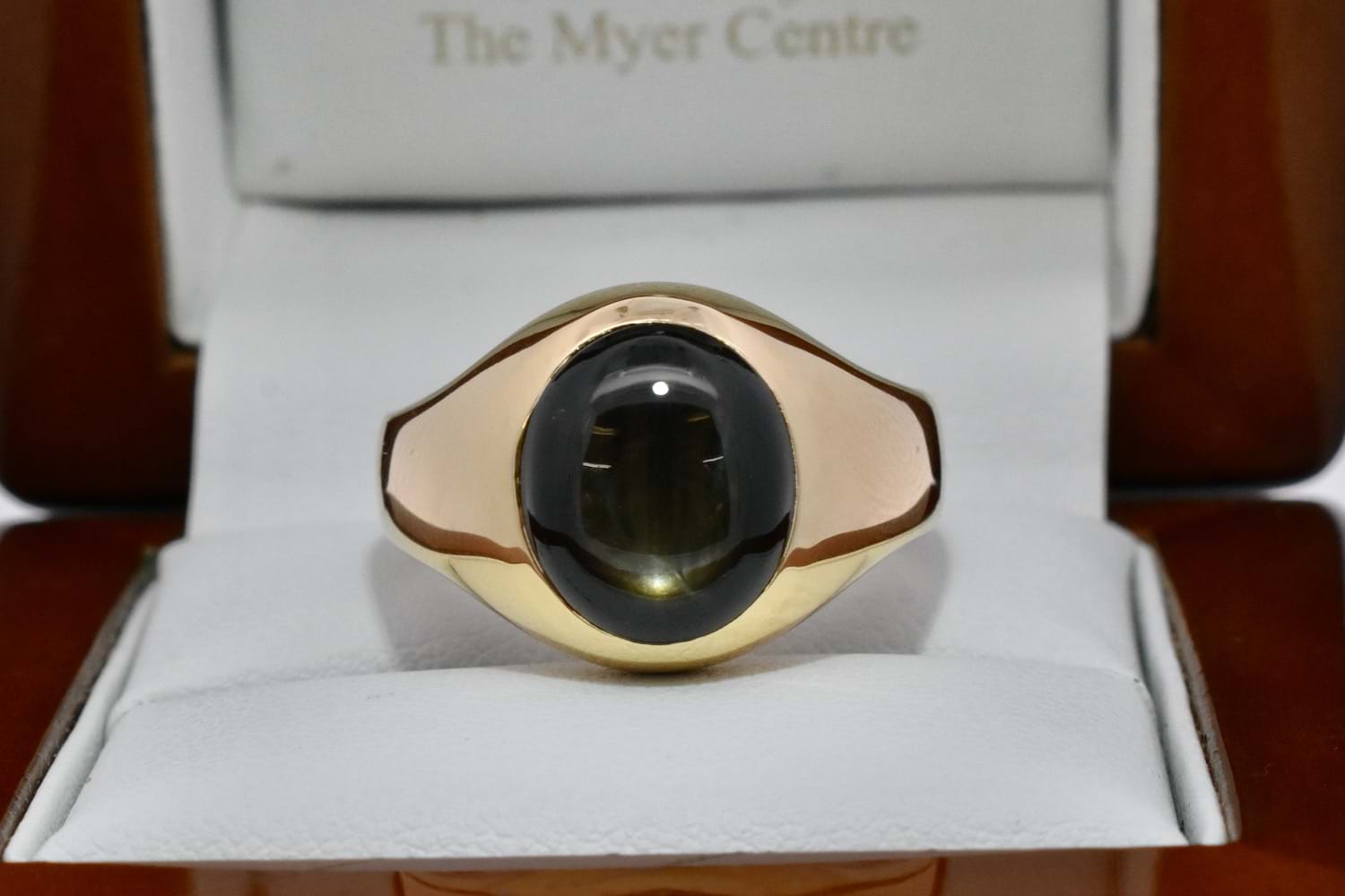 A rare and exciting specimen sourced, after many years of searching, especially for our client! This 10.82ct cabochon sapphire features an impressive and incredibly rare 12 ray star. The sapphire has been set into this bespoke men's rings, expertly crafted in our workshop in 18ct yellow gold.