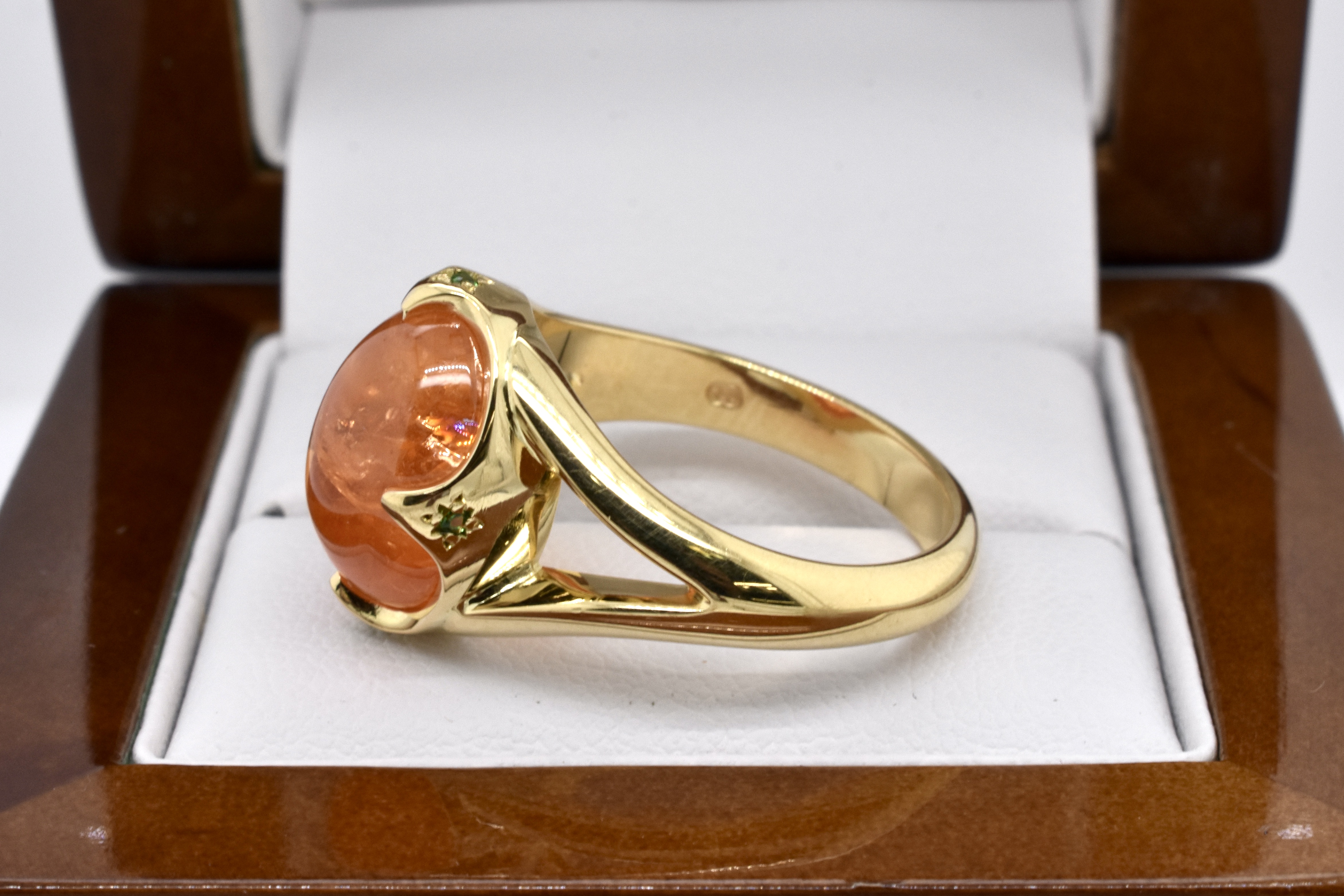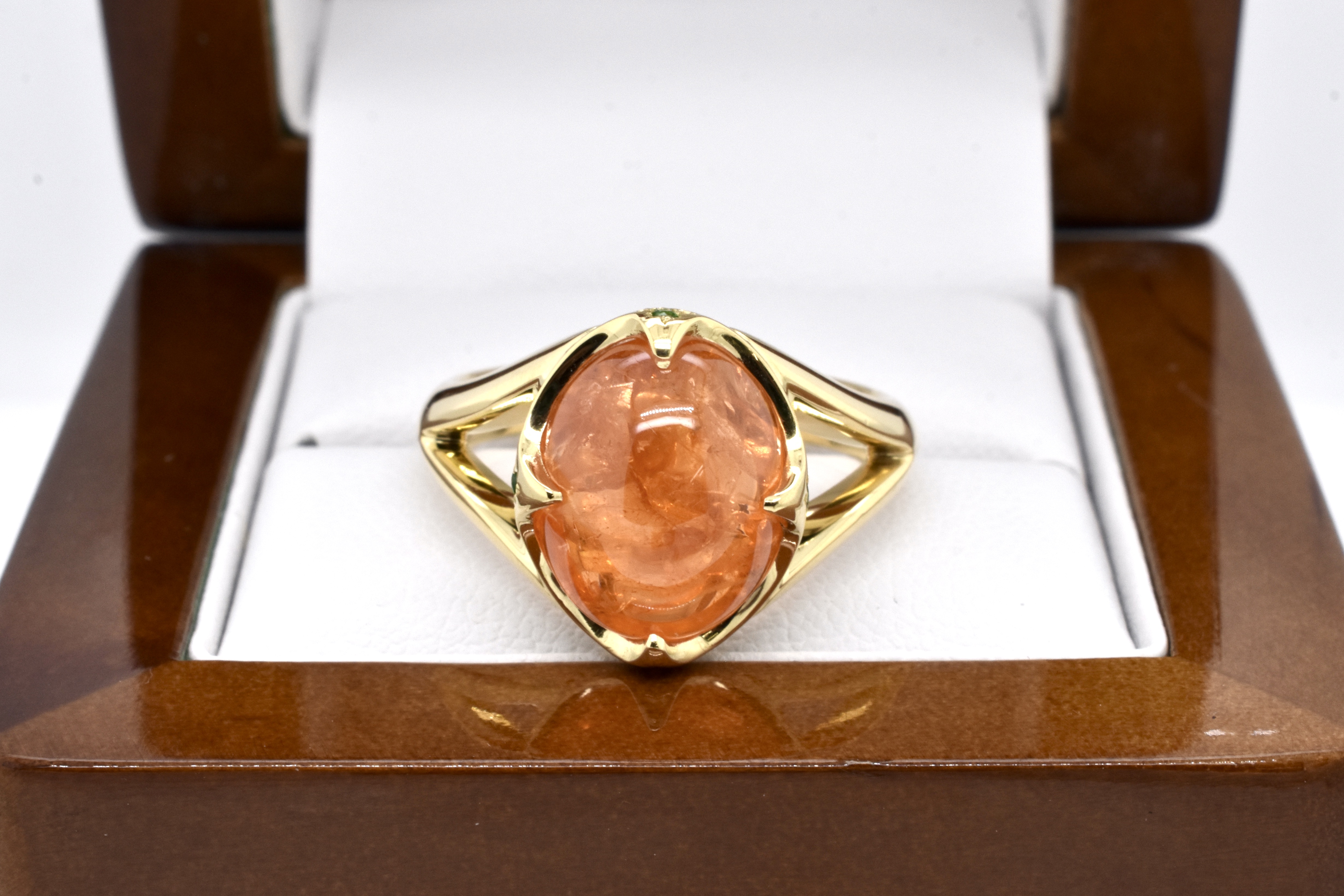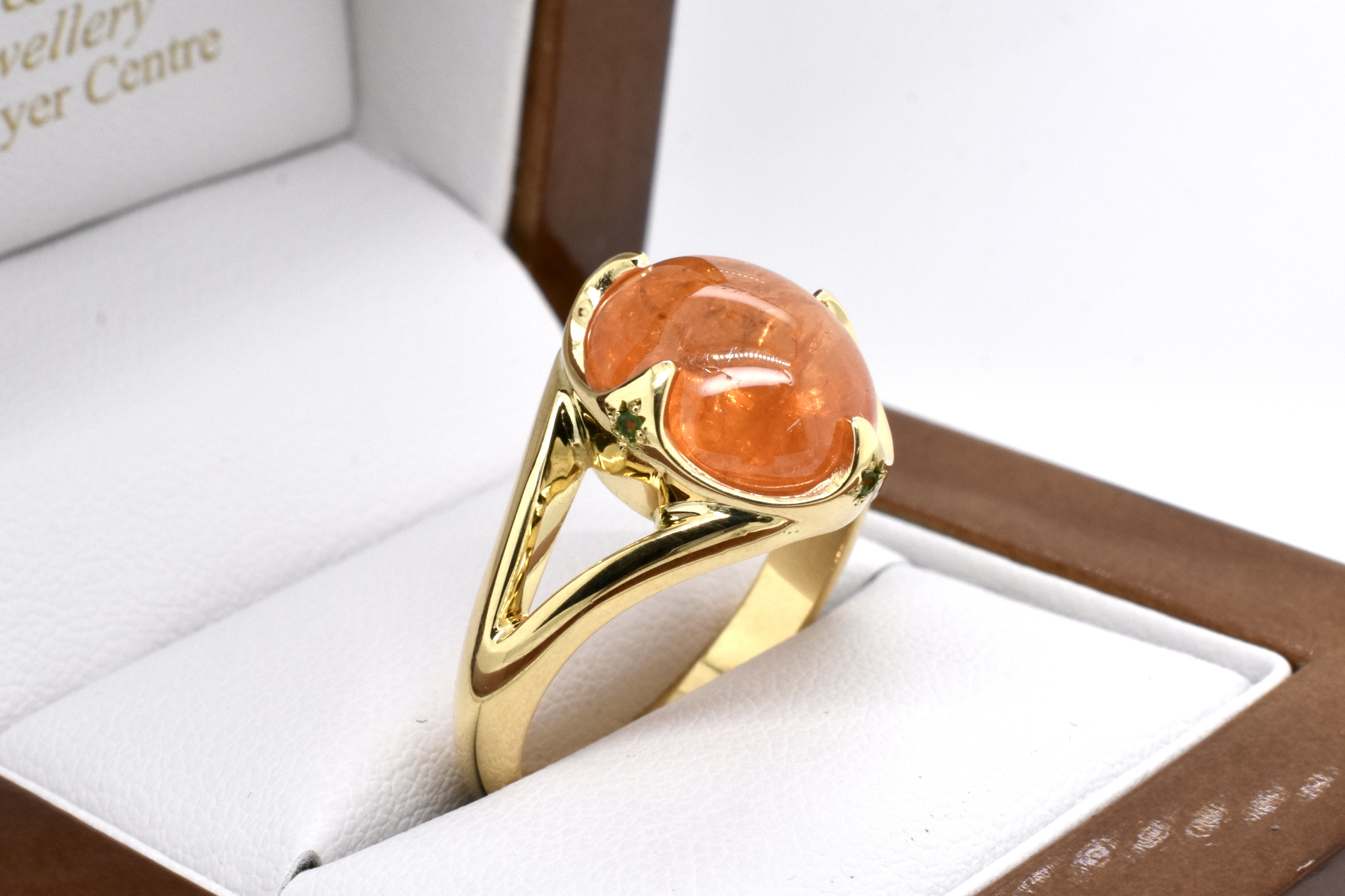 A spectacular 11.81ct cabochon oval bright mid orange mandarin garnet is the feature of this ring, hand crafted in 18ct yellow gold with striking pointed four claw detail and accented with four hammer set round Tsavorite garnets underneath each point, with split shoulders and a solid plain band
