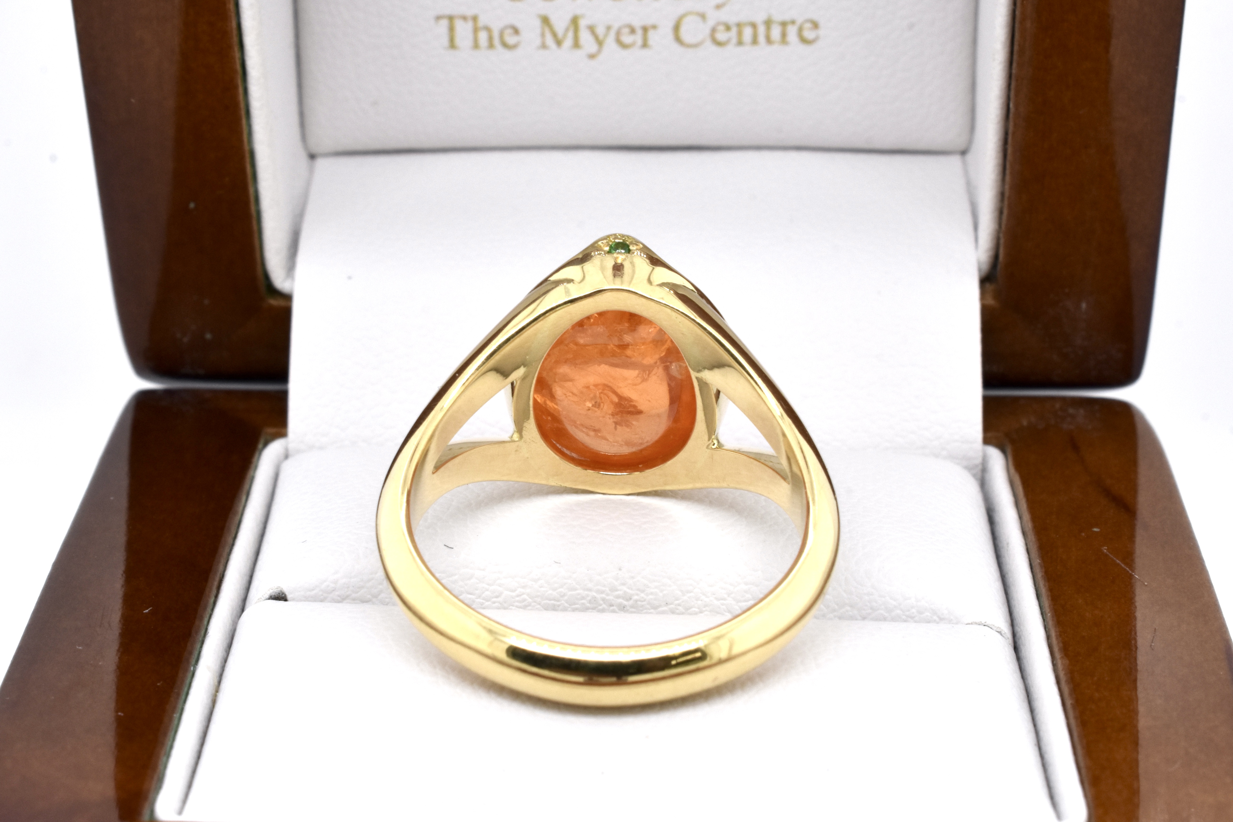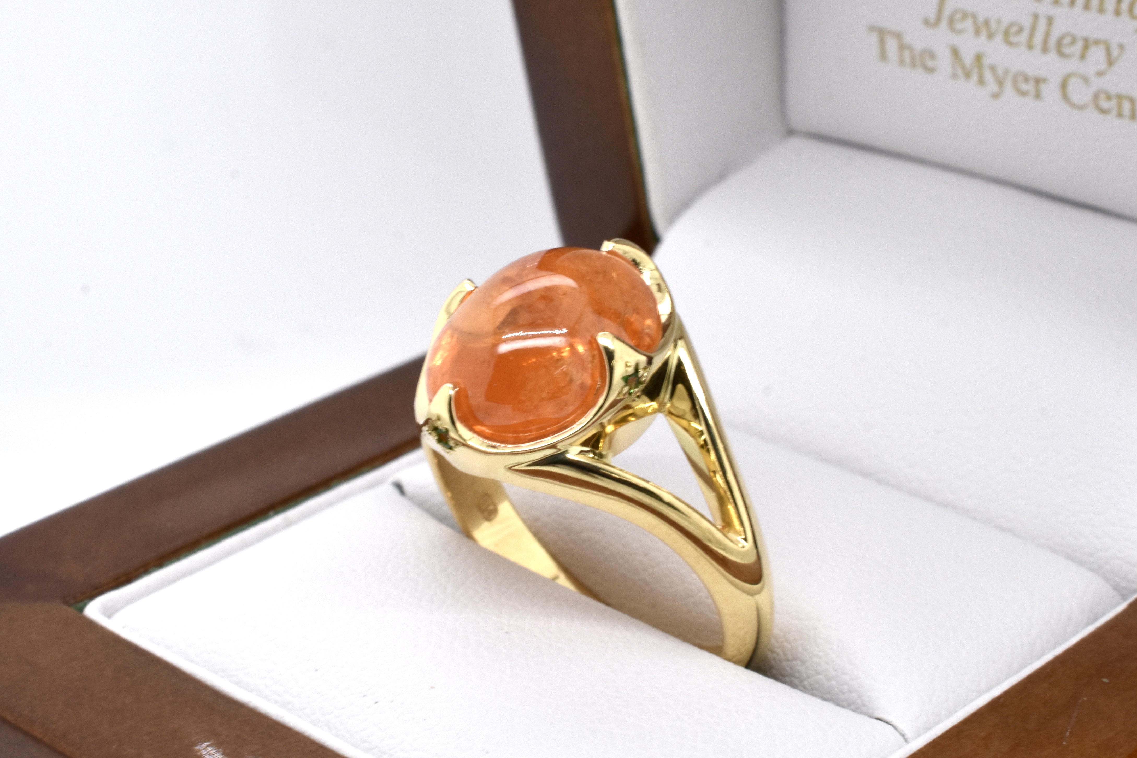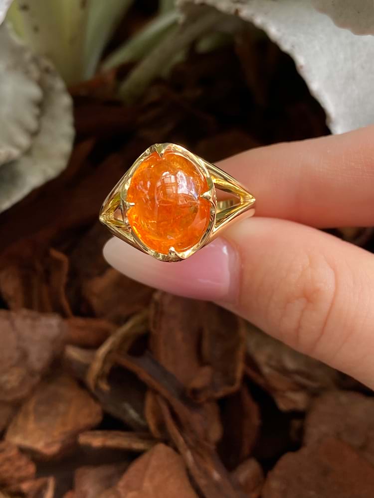 A spectacular 11.81ct cabochon oval bright mid orange mandarin garnet is the feature of this ring, hand crafted in 18ct yellow gold with striking pointed four claw detail and accented with four hammer set round Tsavorite garnets underneath each point, with split shoulders and a solid plain band