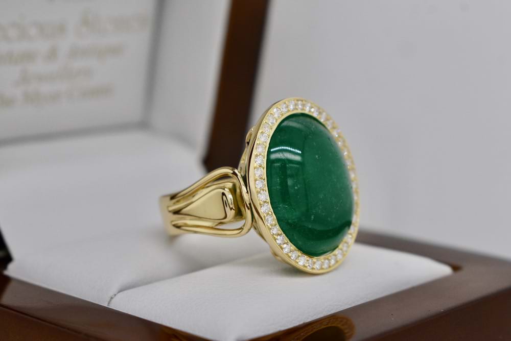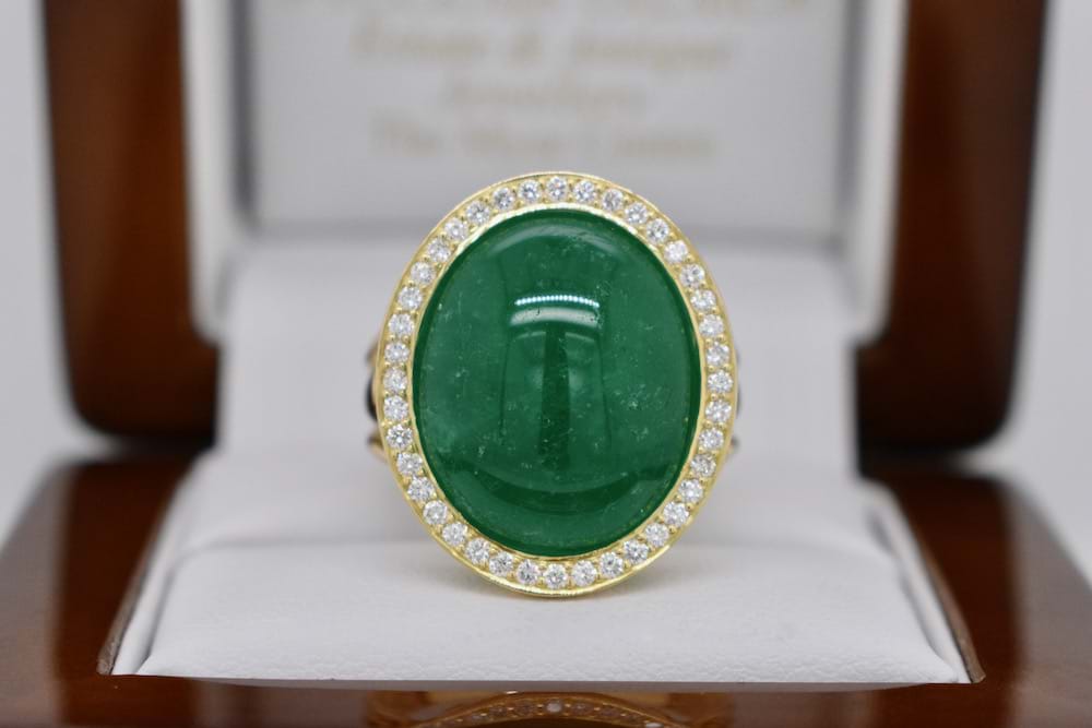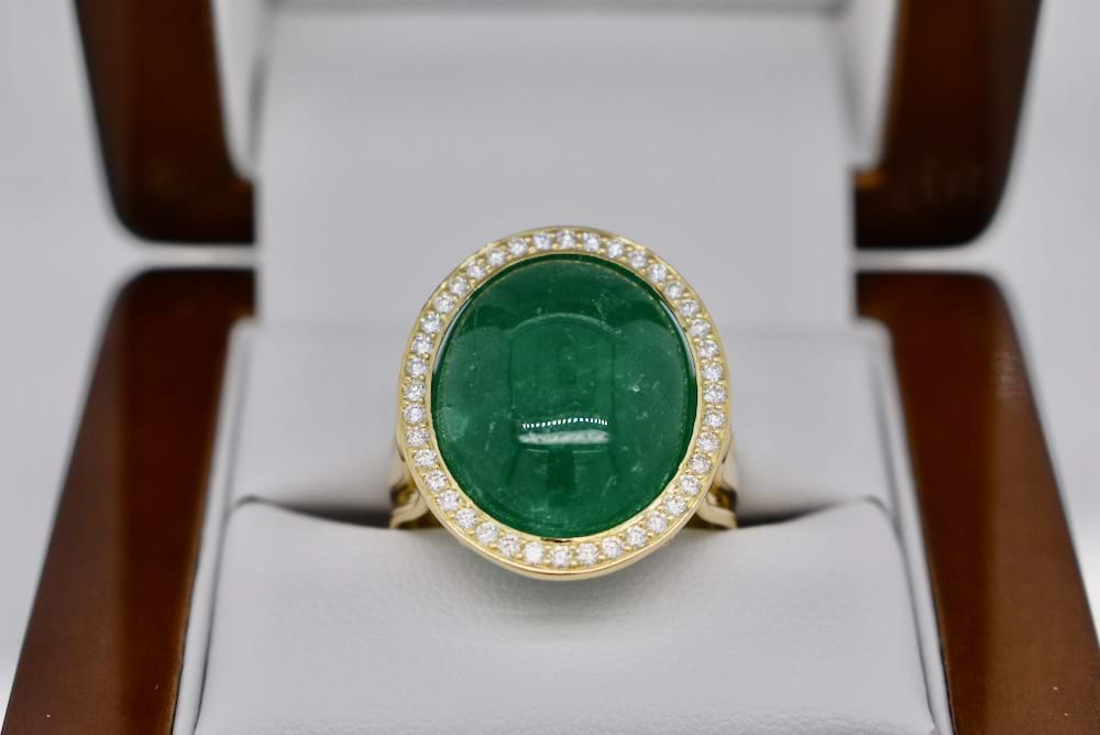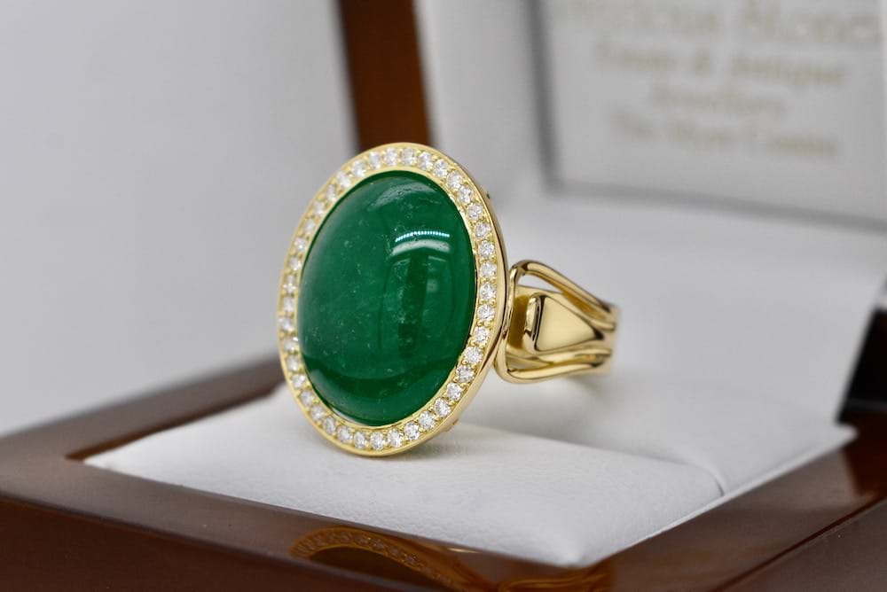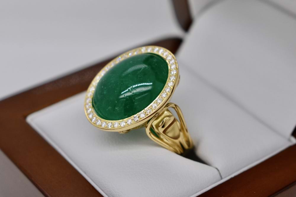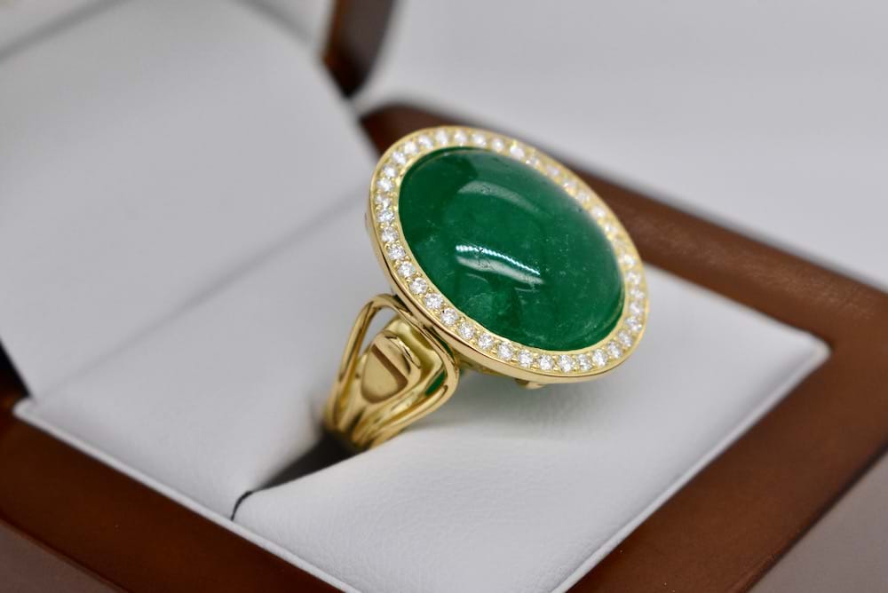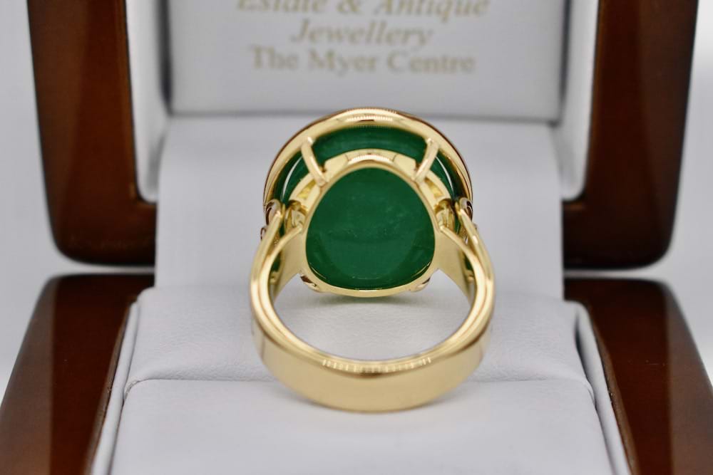 A fabulous European inspired ring expertly crafted in our workshop in 18ct yellow gold to showcase this magnificent 16.00ct natural cabochon emerald. The emerald is surrounded by a grain set halo of shimmering white round brilliant cut diamonds totalling 0.37cts (D-F/VS) and the ring has a fancy curvaceous shoulder design with a solid 5.25mm band giving it an old school luxury feel. Independent Valuation Supplied.