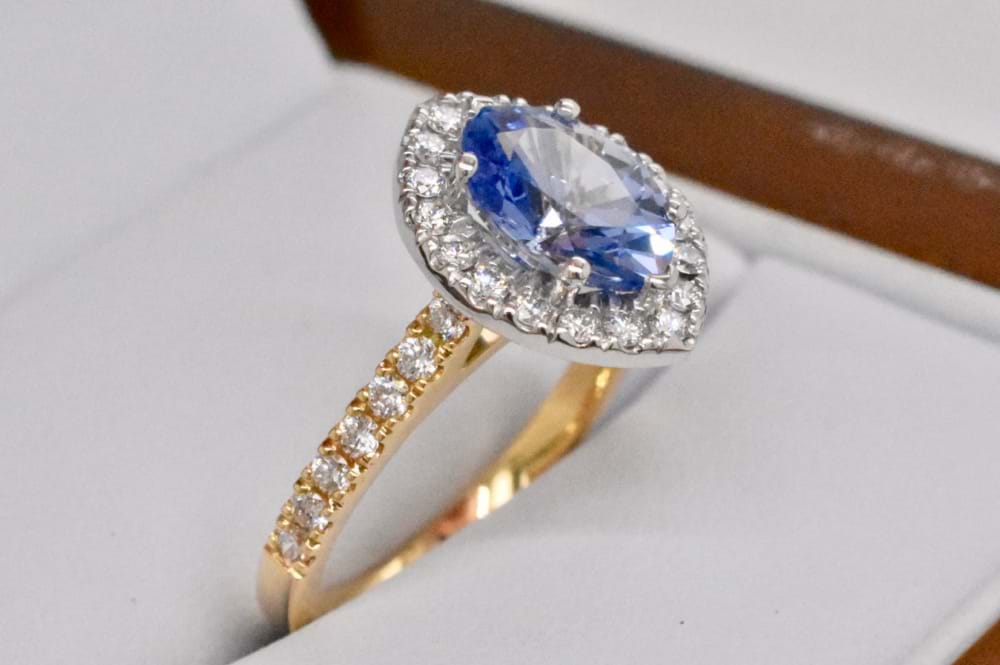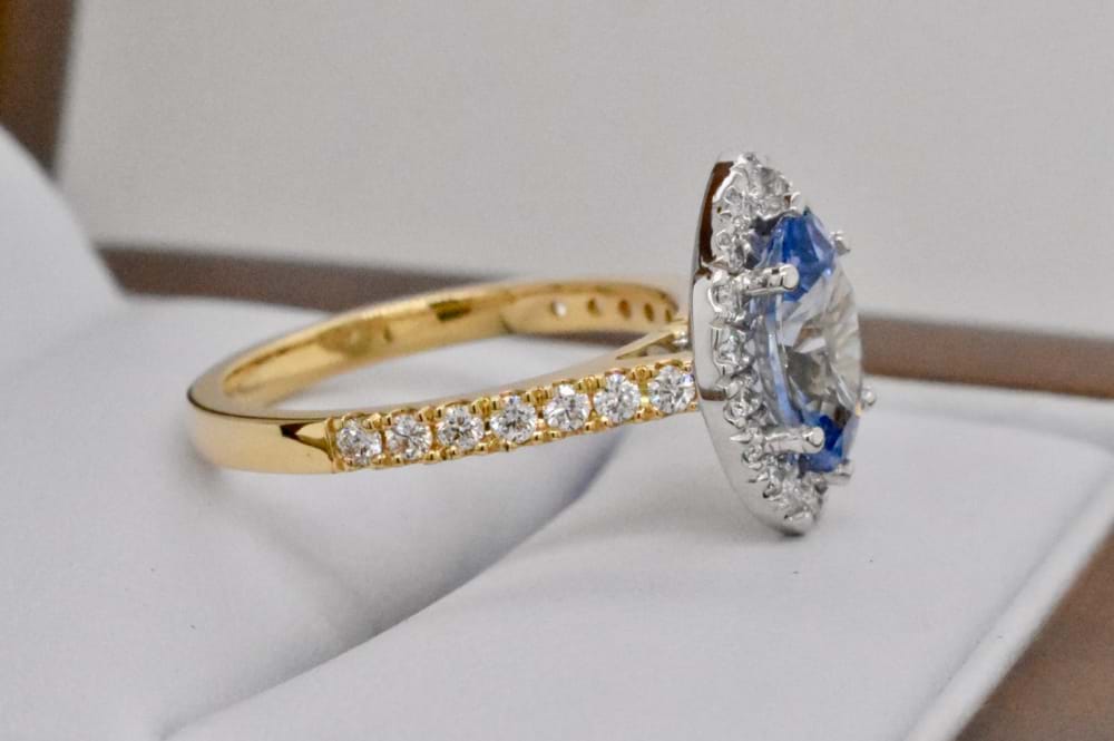 Featuring a gorgeous cornflower blue Ceylon sapphire cut into a fabulous marquise of 2.04cts and crafted into an 18ct yellow gold diamond halo ring with diamonds both surrounding the sapphire and down the shoulders. This ring makes a fantastic stand alone piece or flanked by diamond bands. Independent Valuation Supplied.