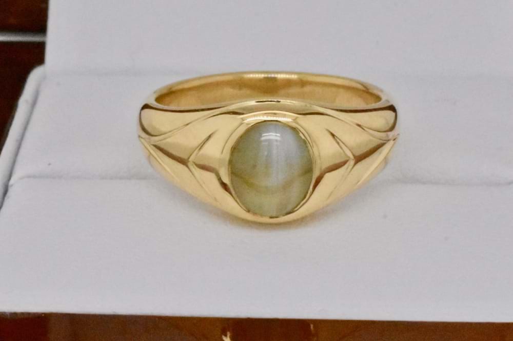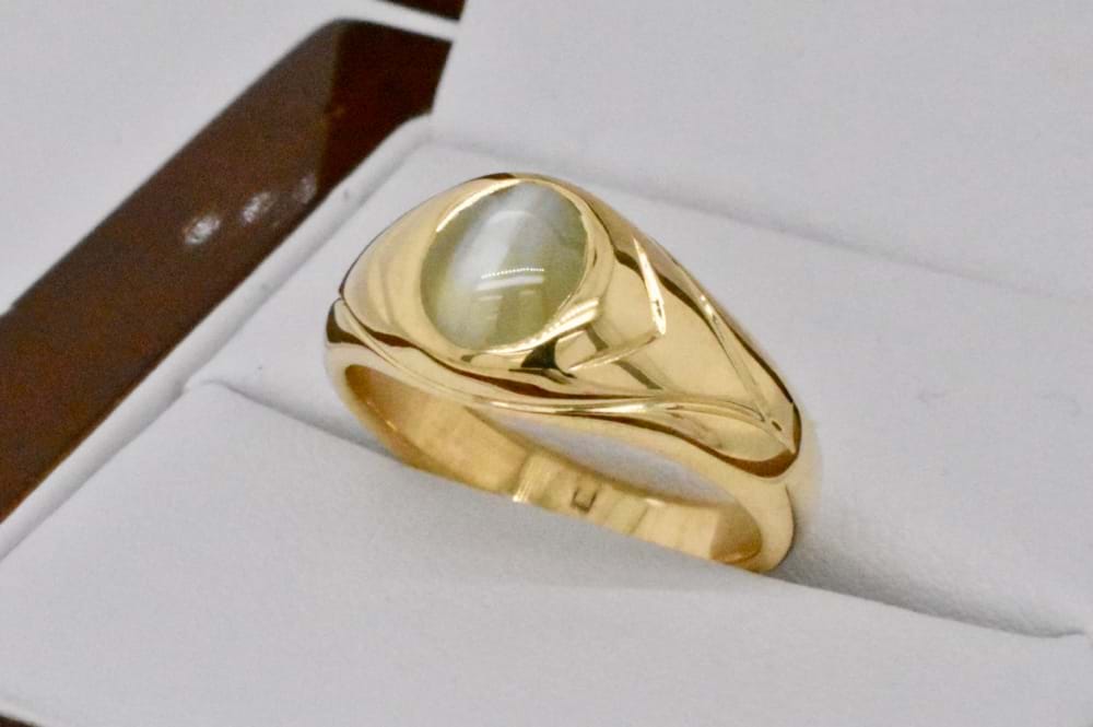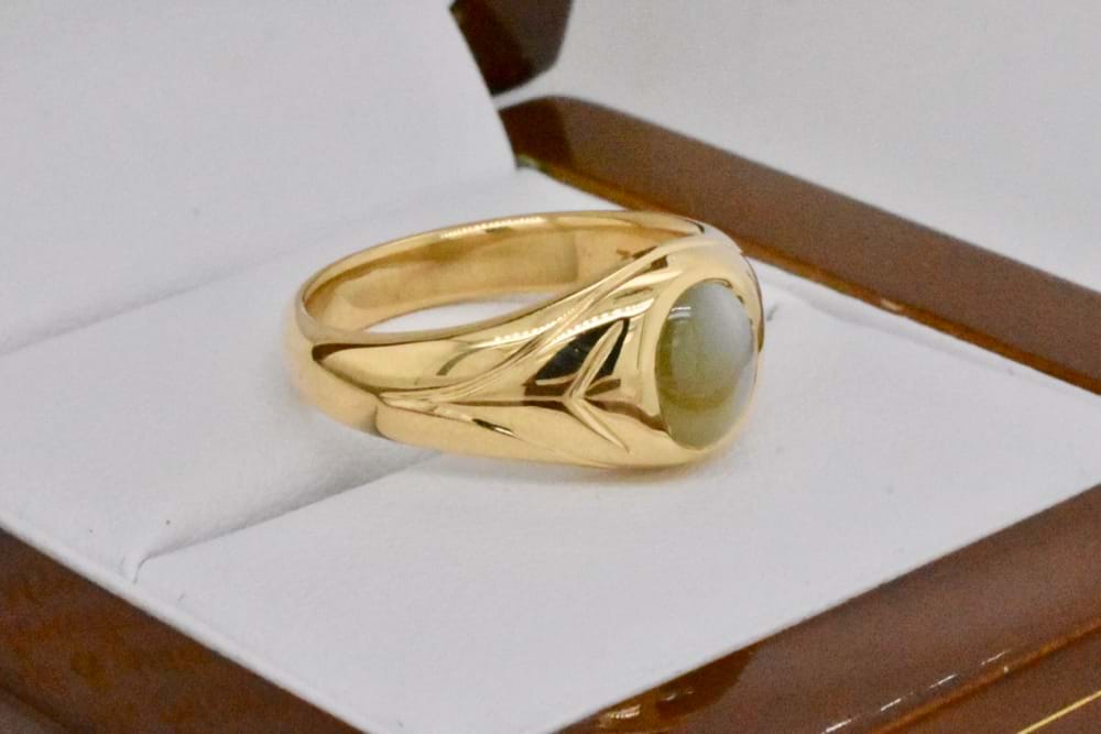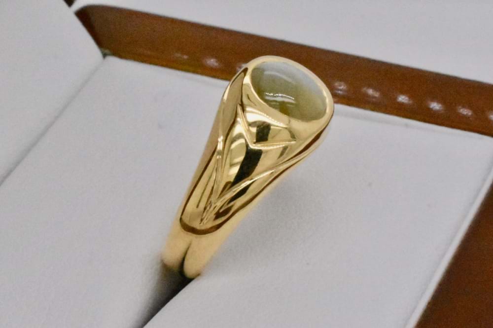 This 2.11ct cats eye chrysoberyl is both incredibly rare and highly collectable. Sought after for many years, we were finally able to source our gem connoisseur client this special specimen. Technically referred to as a chatoyancy effect this cats eye illusion paired with the ‘milk & honey’ effect of golden chrysoberyl makes this find particularly exciting. The ring was designed alongside its’ owner and has been crafted in 18ct yellow gold. Independent Valuation Supplied. If you are inspired by this archived design contact us today to discuss how we can create something incredible for you or your loved one.