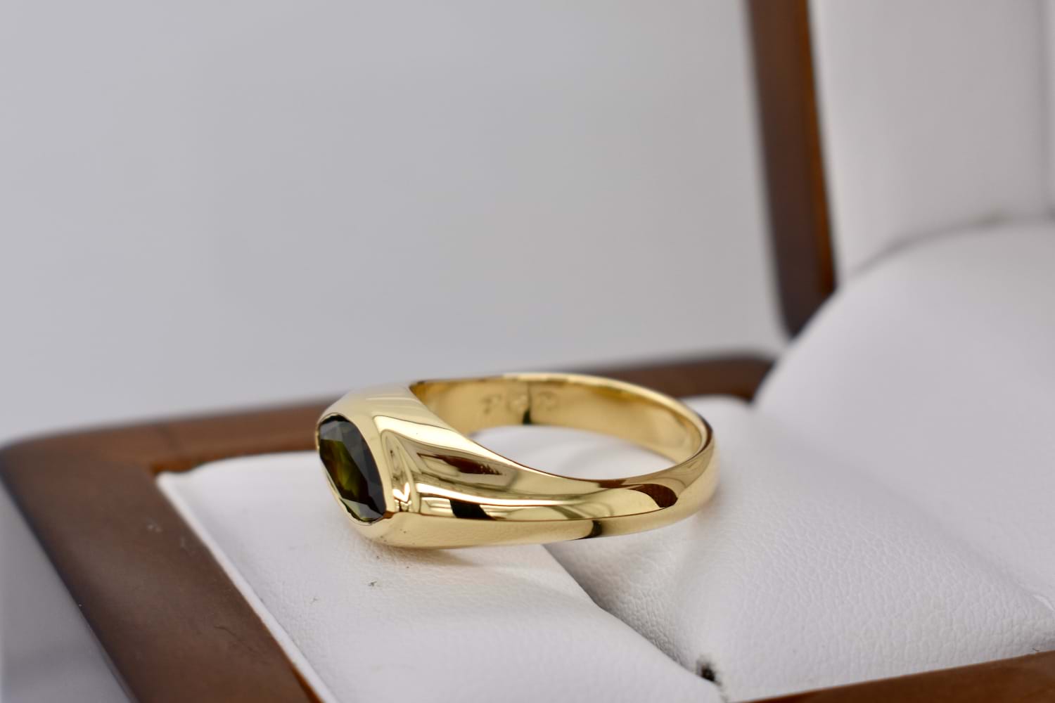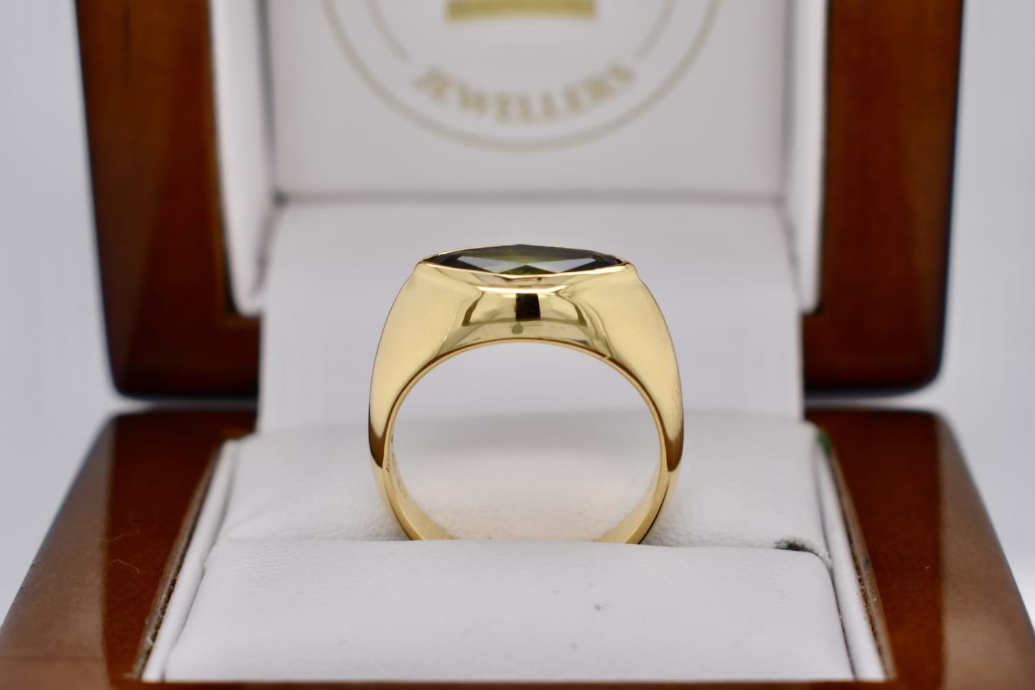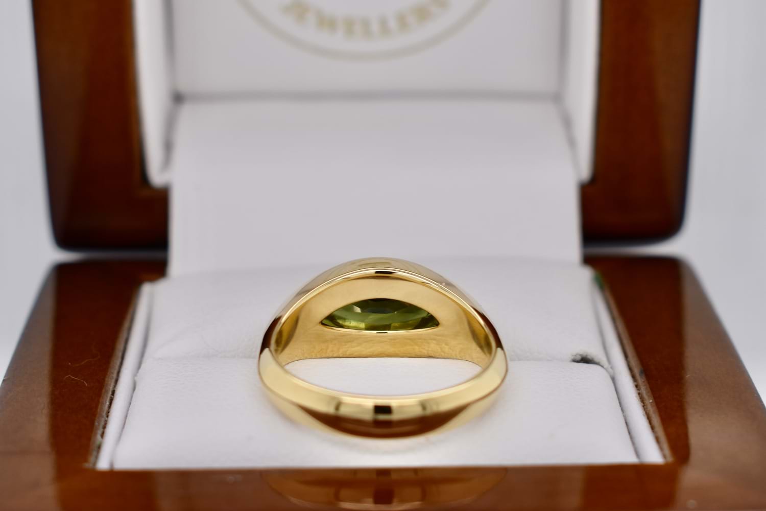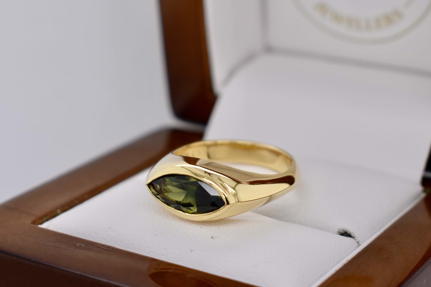 Stunning bespoke engagement ring featuring a beautiful 2.16ct green sapphire hand selected in store by our client to be the feature of this east/west design. The marquise shape sapphire has been bezel set into a tapering high dome band with a knife edge in 18ct yellow gold, to create a sleek and timeless design.