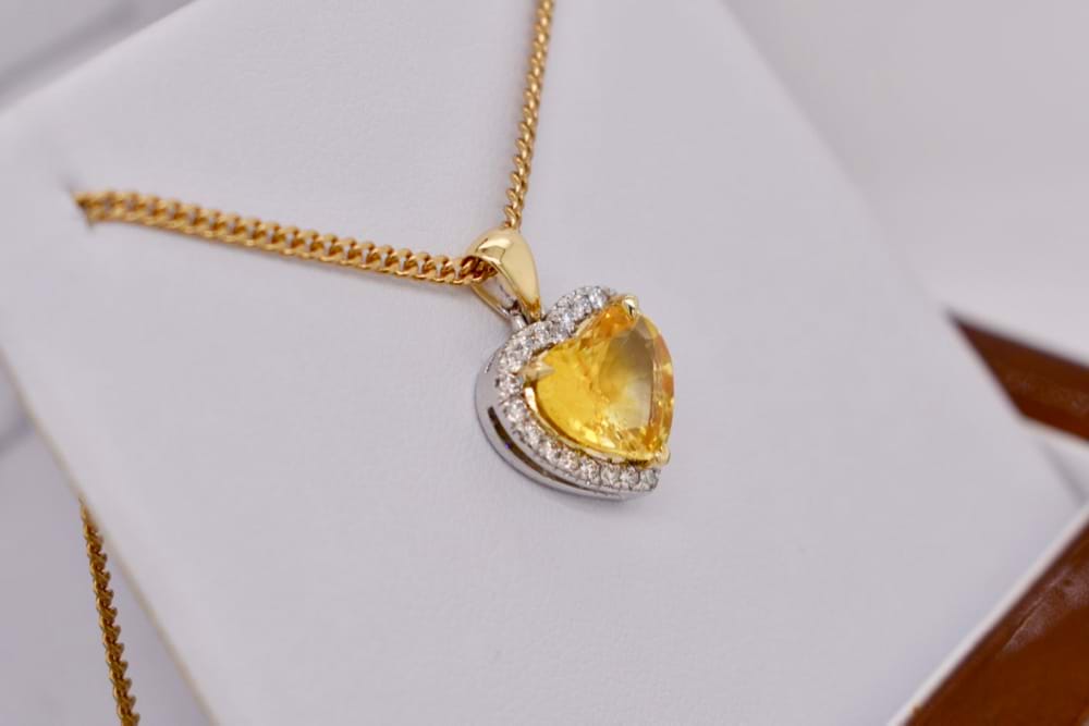 A rare and beautiful 3.01ct heart shaped yellow sapphire originating from Ceylon chosen to be the feature of this gorgeous anniversary pendant. Crafted in 18ct yellow and white gold it features a single fine halo of shimmering diamonds totalling 0.24cts. Independent Valuation Supplied. If you are inspired by this archived design contact us today to discuss how we can create something incredible for you or your loved one.