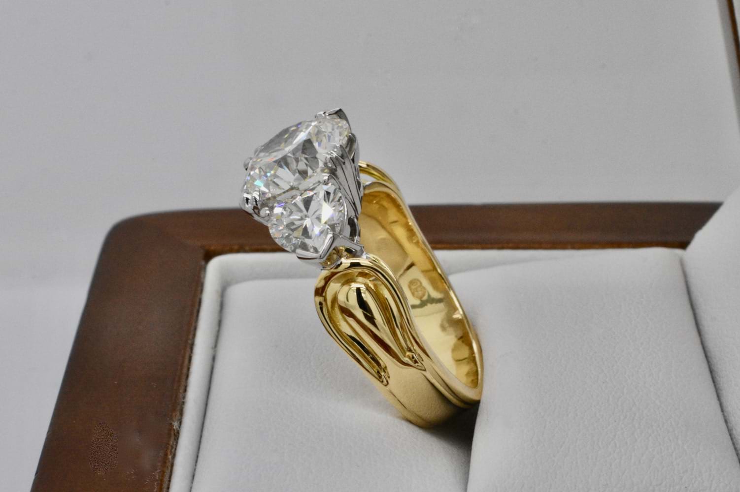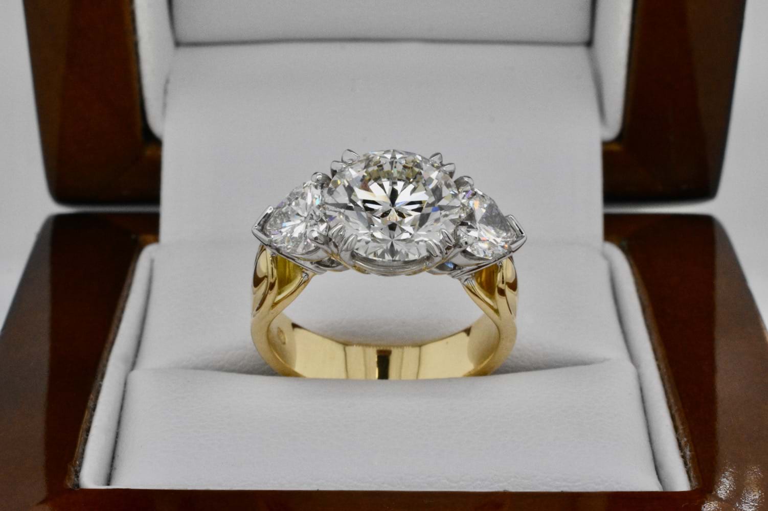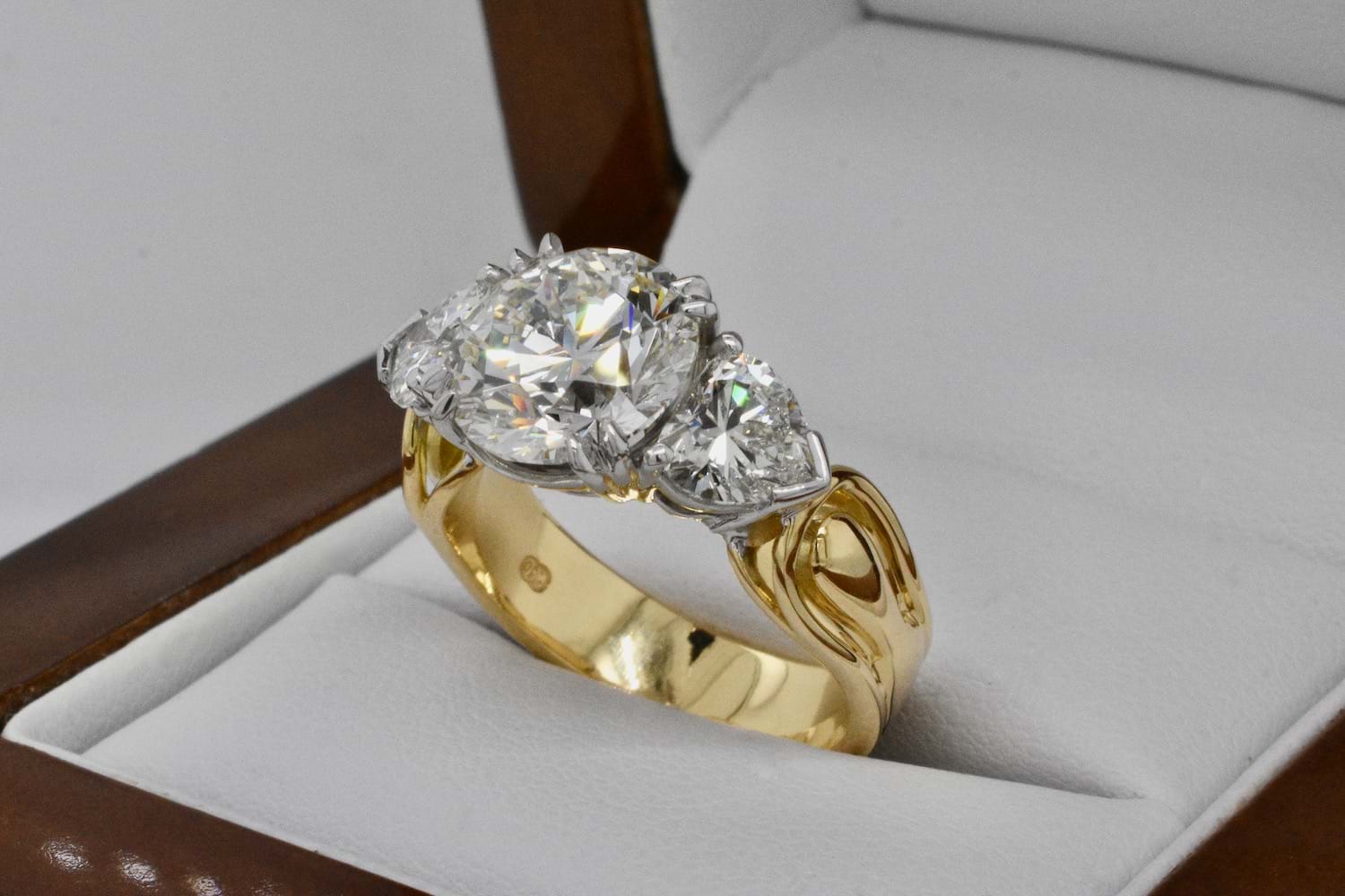 Absolutely breathtaking! This totally scintillating 3.22ct round brilliant cut diamond was chosen by one of our design consultants to be the focal point of this epic dress ring. The heart shape diamonds on each side were especially cut to perfectly compliment the centre diamond and they have a combined total weight of 1.30cts. Expertly crafted in 18ct yellow gold with a wide fancy band, and 18ct white gold settings, this ring will sit flush on the hand and make for an ideal right hand statement piece. Independent Valuation Supplied.