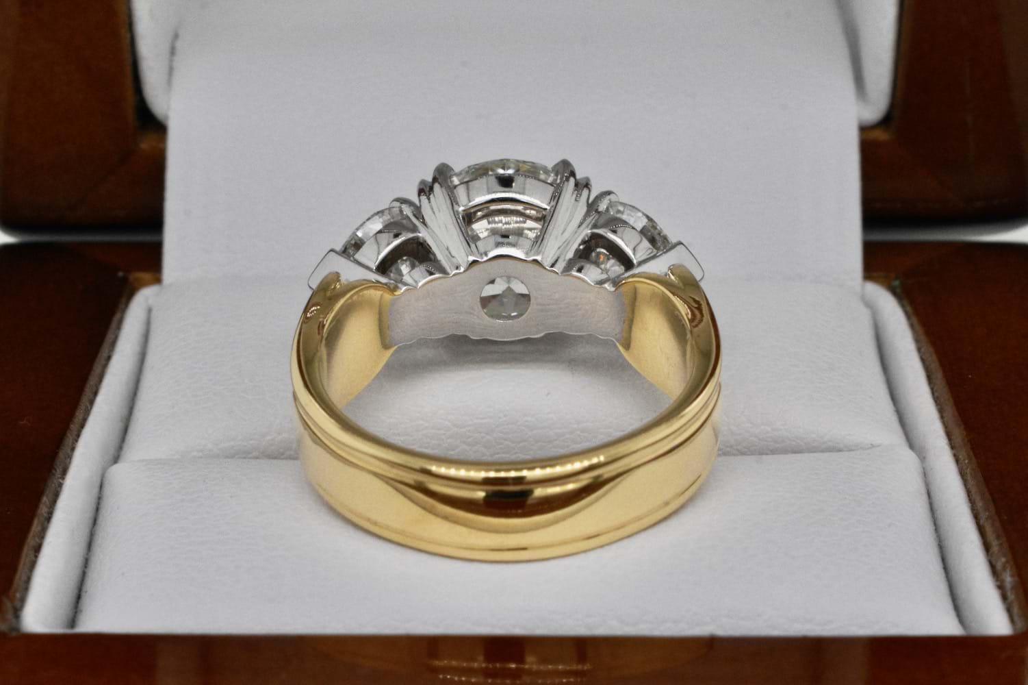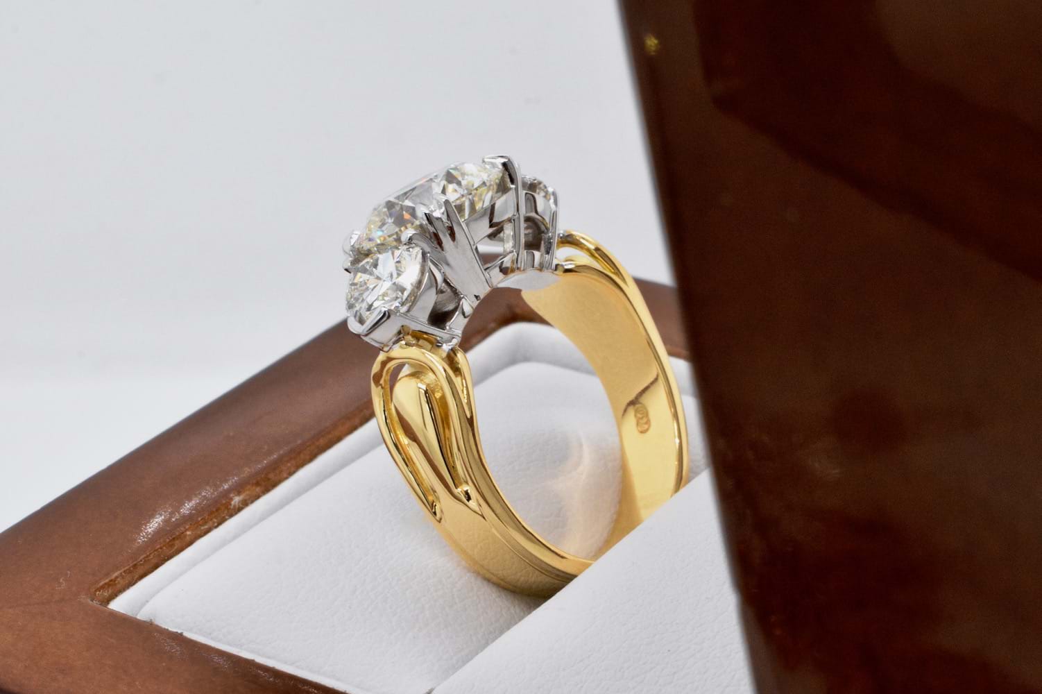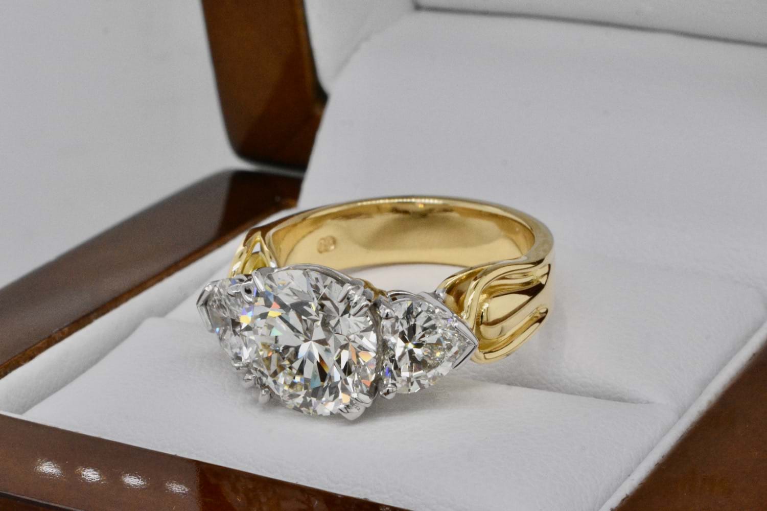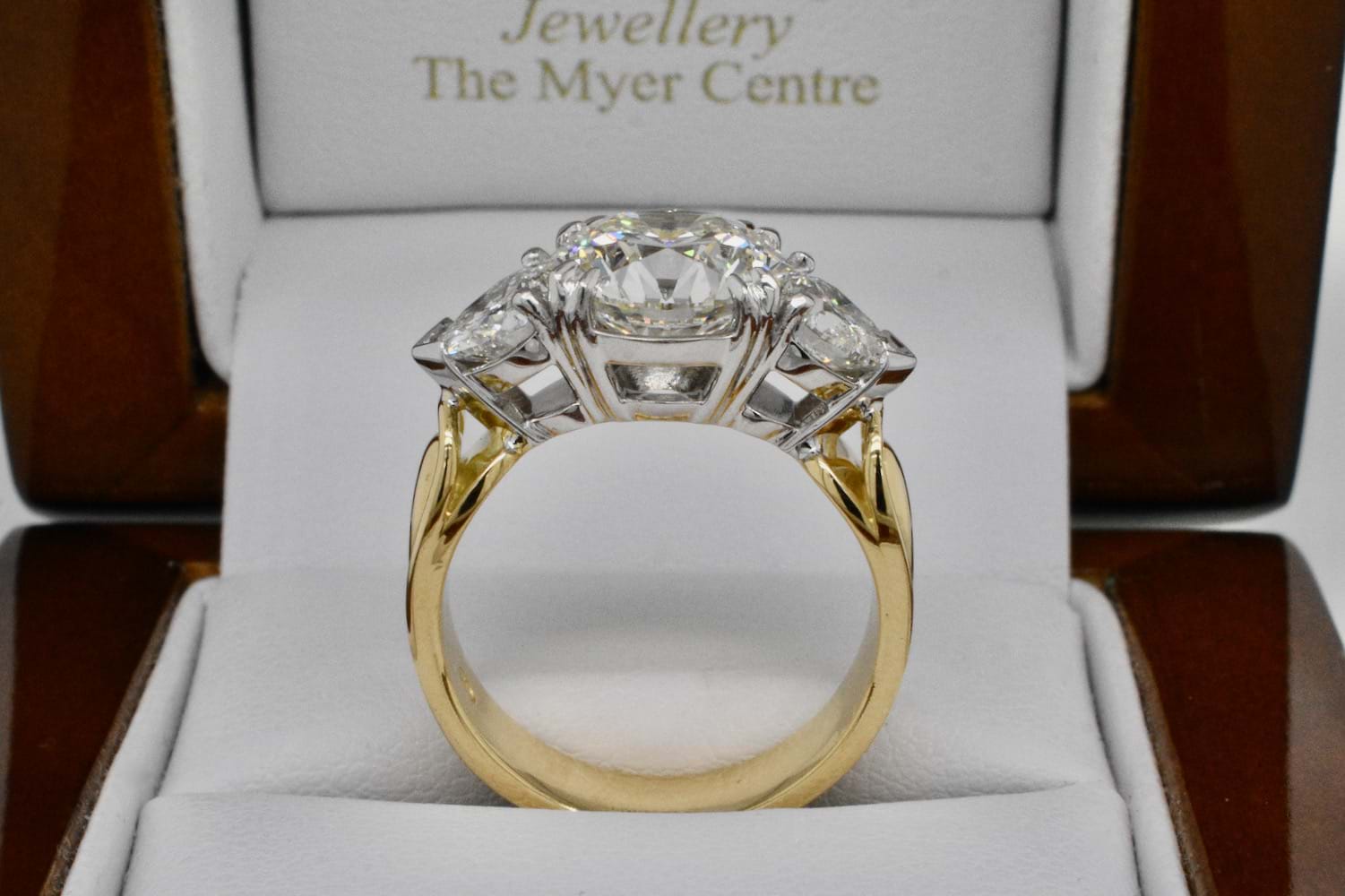 Absolutely breathtaking! This totally scintillating 3.22ct round brilliant cut diamond was chosen by one of our design consultants to be the focal point of this epic dress ring. The heart shape diamonds on each side were especially cut to perfectly compliment the centre diamond and they have a combined total weight of 1.30cts. Expertly crafted in 18ct yellow gold with a wide fancy band, and 18ct white gold settings, this ring will sit flush on the hand and make for an ideal right hand statement piece. Independent Valuation Supplied.
