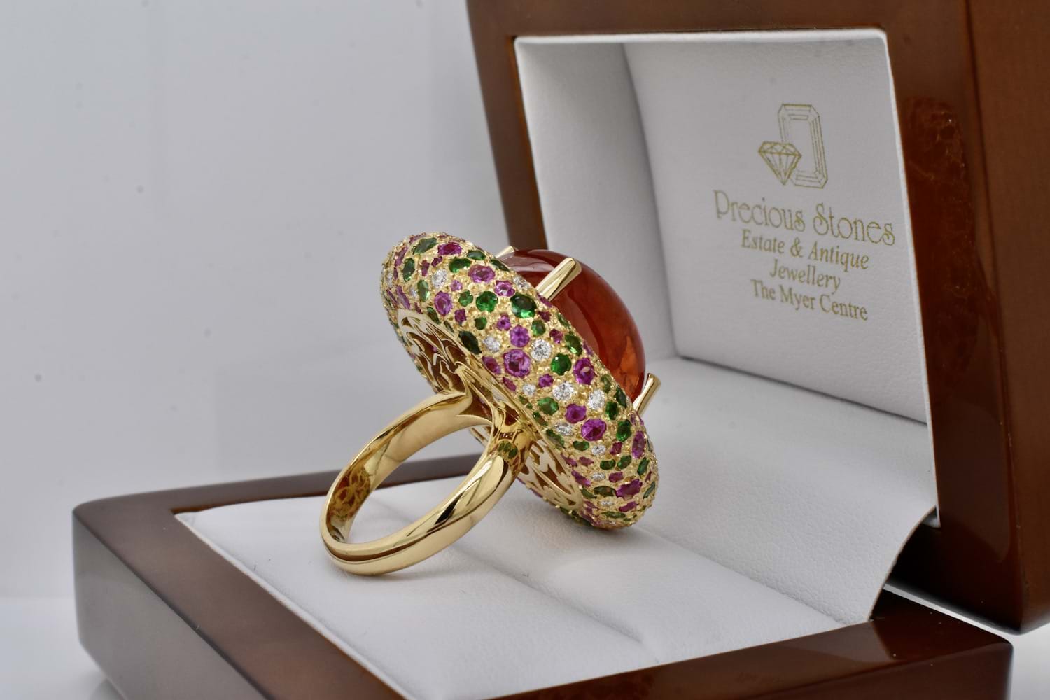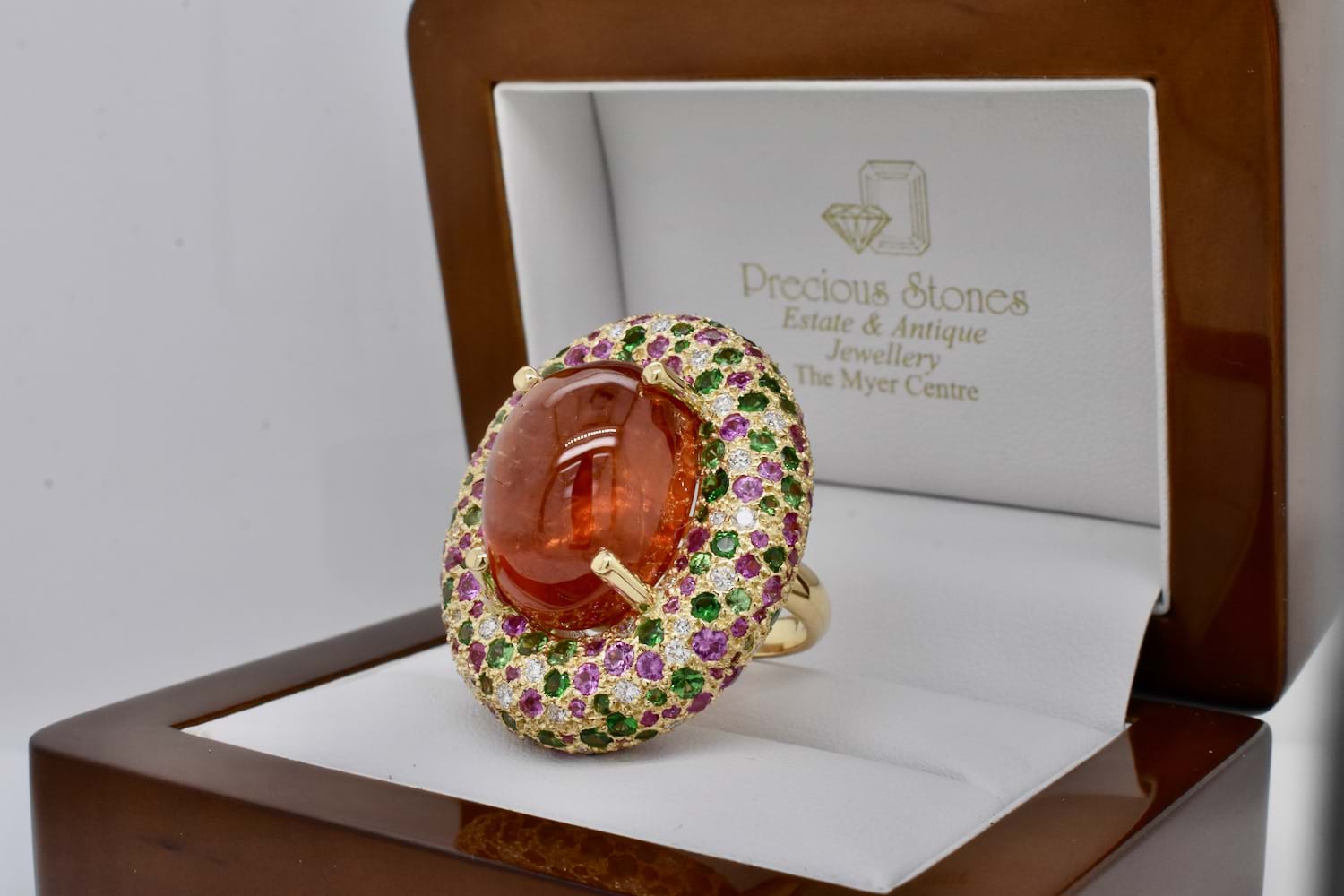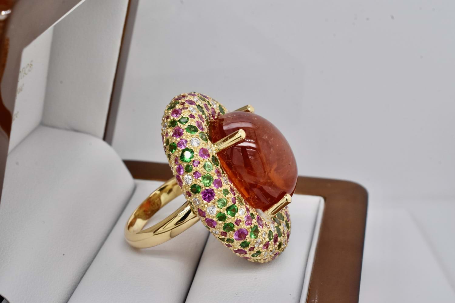 This show stopping and totally magnificent creation was designed in store alongside our equally fabulous client! The feature of this masterpiece is a 45.91ct cabochon Spessartite garnet, set with four claws and is surrounded by a doughnut of 18ct yellow gold encrusted with a mix of green Tsavorite garnets, hot pink sapphires and scintillating white diamonds. The Tsavorite garnets total 4.60cts, the pink sapphires equal 4.44cts and the diamonds 1.07ct. With no detail left untouched, the ring has a stunning artistic carved underneath and sits beautifully across two fingers on the hand. An example of exceptional workmanship and unrivalled design. Independent Valuation Supplied.