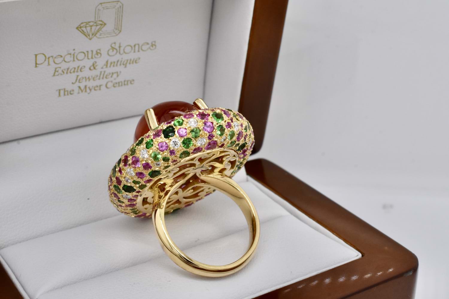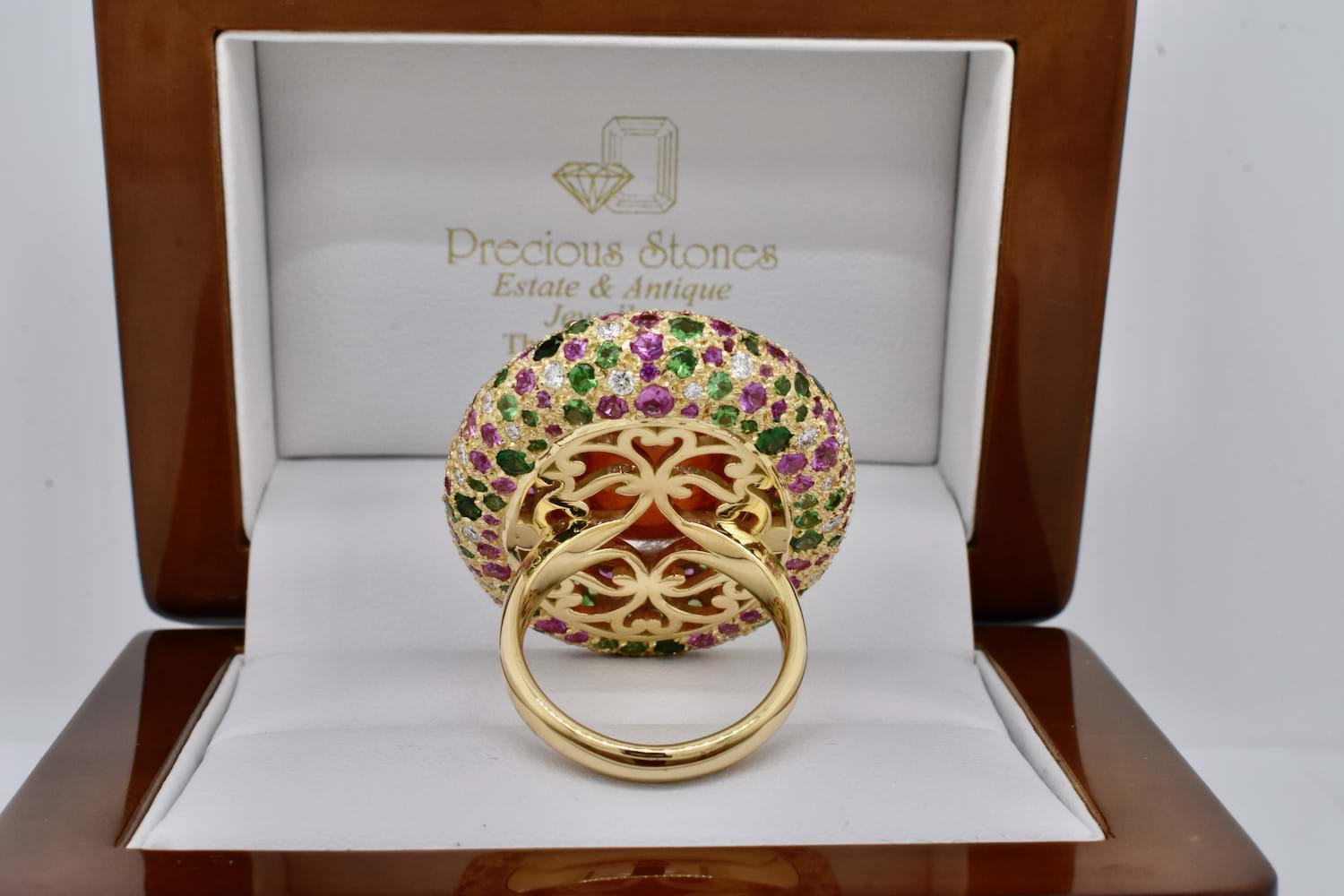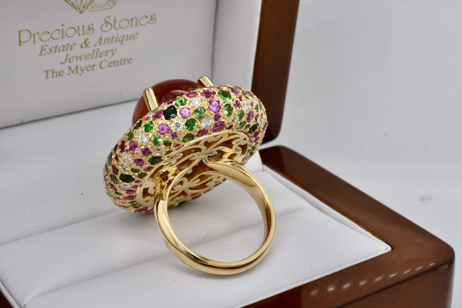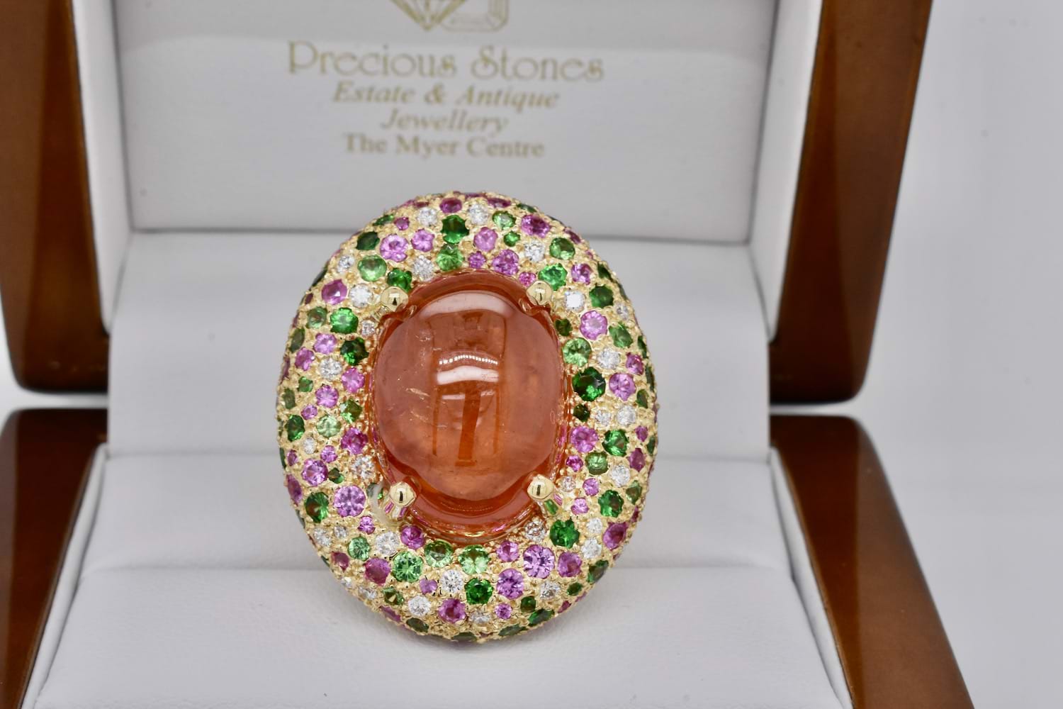 This show stopping and totally magnificent creation was designed in store alongside our equally fabulous client! The feature of this masterpiece is a 45.91ct cabochon Spessartite garnet, set with four claws and is surrounded by a doughnut of 18ct yellow gold encrusted with a mix of green Tsavorite garnets, hot pink sapphires and scintillating white diamonds. The Tsavorite garnets total 4.60cts, the pink sapphires equal 4.44cts and the diamonds 1.07ct. With no detail left untouched, the ring has a stunning artistic carved underneath and sits beautifully across two fingers on the hand. An example of exceptional workmanship and unrivalled design. Independent Valuation Supplied.