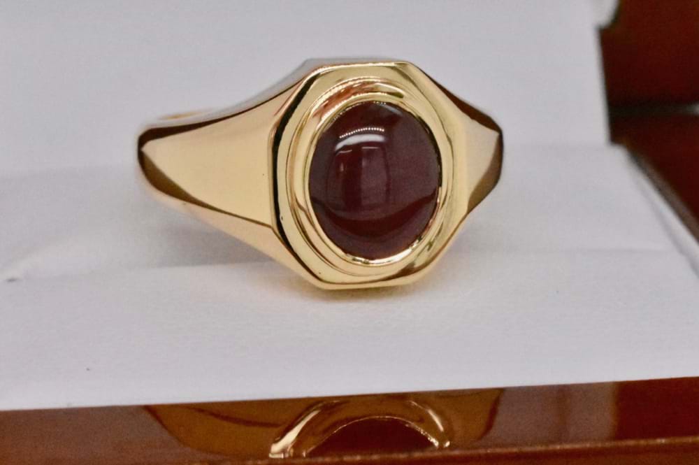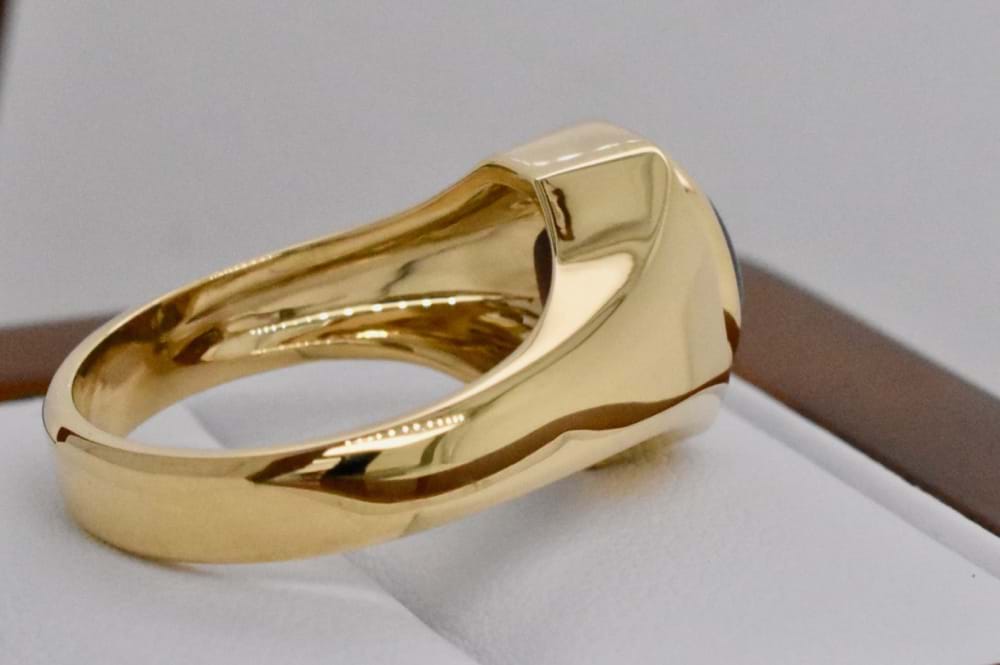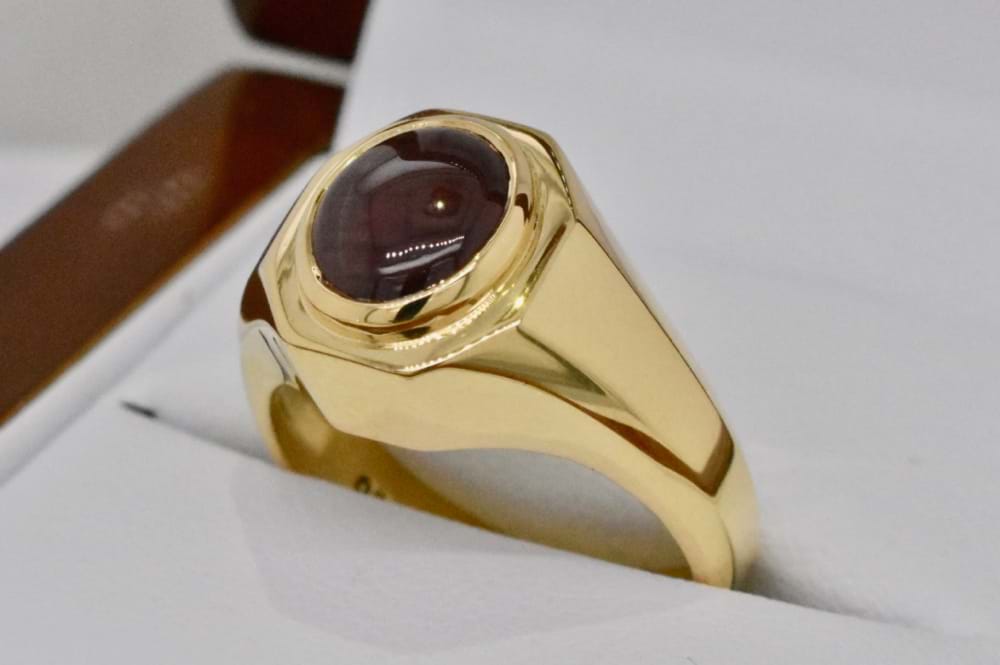 This 18ct yellow gold gents ring was designed specifically for this rare and unsusual spinel. At a glance this ring appears to be an elegant gentlemans dress piece but upon closer inspection the viewer would appreciate the difference brought to the ring by it's central gemstone. Weighing 5.40cts this cabochon red spinel exhibits an incredibly rare phenomena of chatoyancy, more commonly referred to as the 'cats eye' effect.