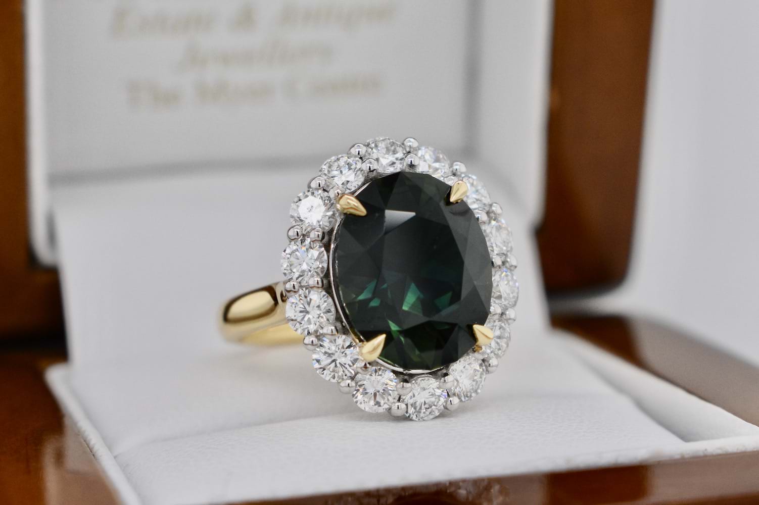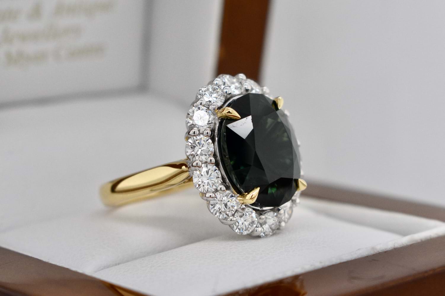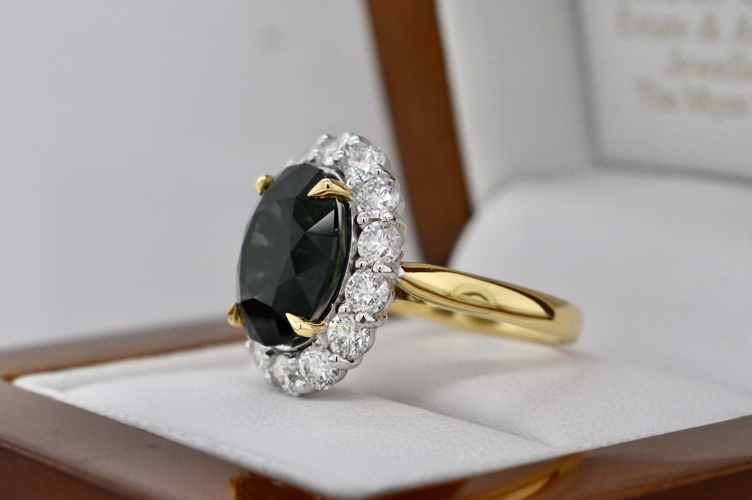 This stunning 7.15ct greenish blue (teal) Australian sapphire is fabulous and bright and has been showcased perfectly in this custom 18ct yellow and white gold diamond cluster design ring. Featuring 14 scintillating round brilliant cut diamonds totalling 1.90ct D/F VS-SI surrounding the sapphire to provide crisp white contrast and fabulous sparkle this ring is sure to turn heads.