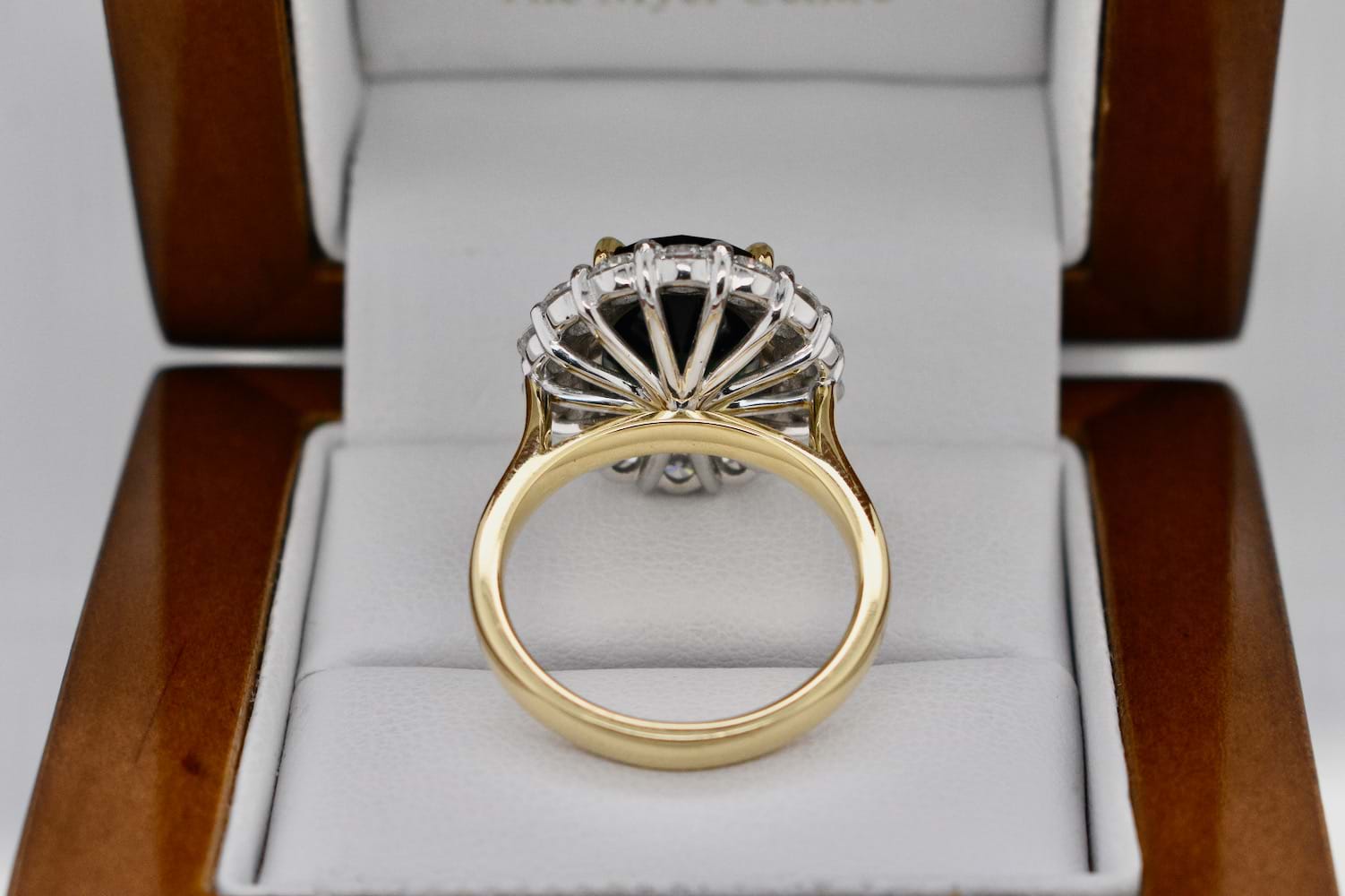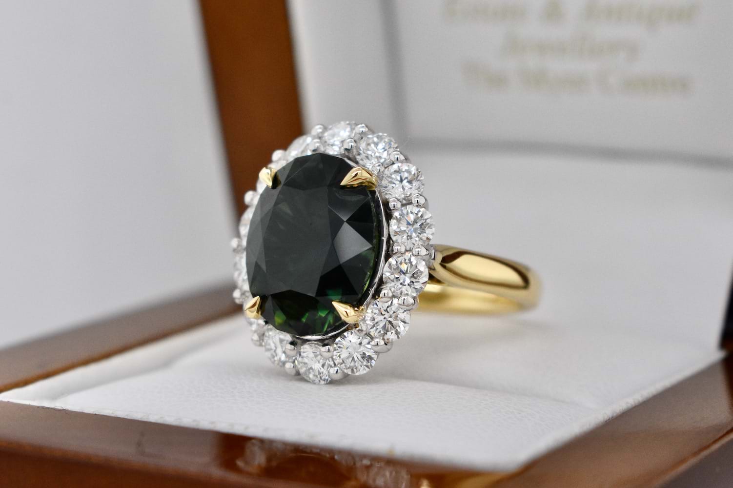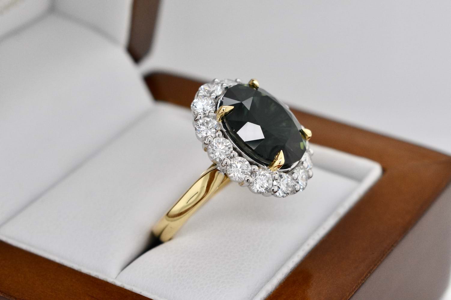 This stunning 7.15ct greenish blue (teal) Australian sapphire is fabulous and bright and has been showcased perfectly in this custom 18ct yellow and white gold diamond cluster design ring. Featuring 14 scintillating round brilliant cut diamonds totalling 1.90ct D/F VS-SI surrounding the sapphire to provide crisp white contrast and fabulous sparkle this ring is sure to turn heads.