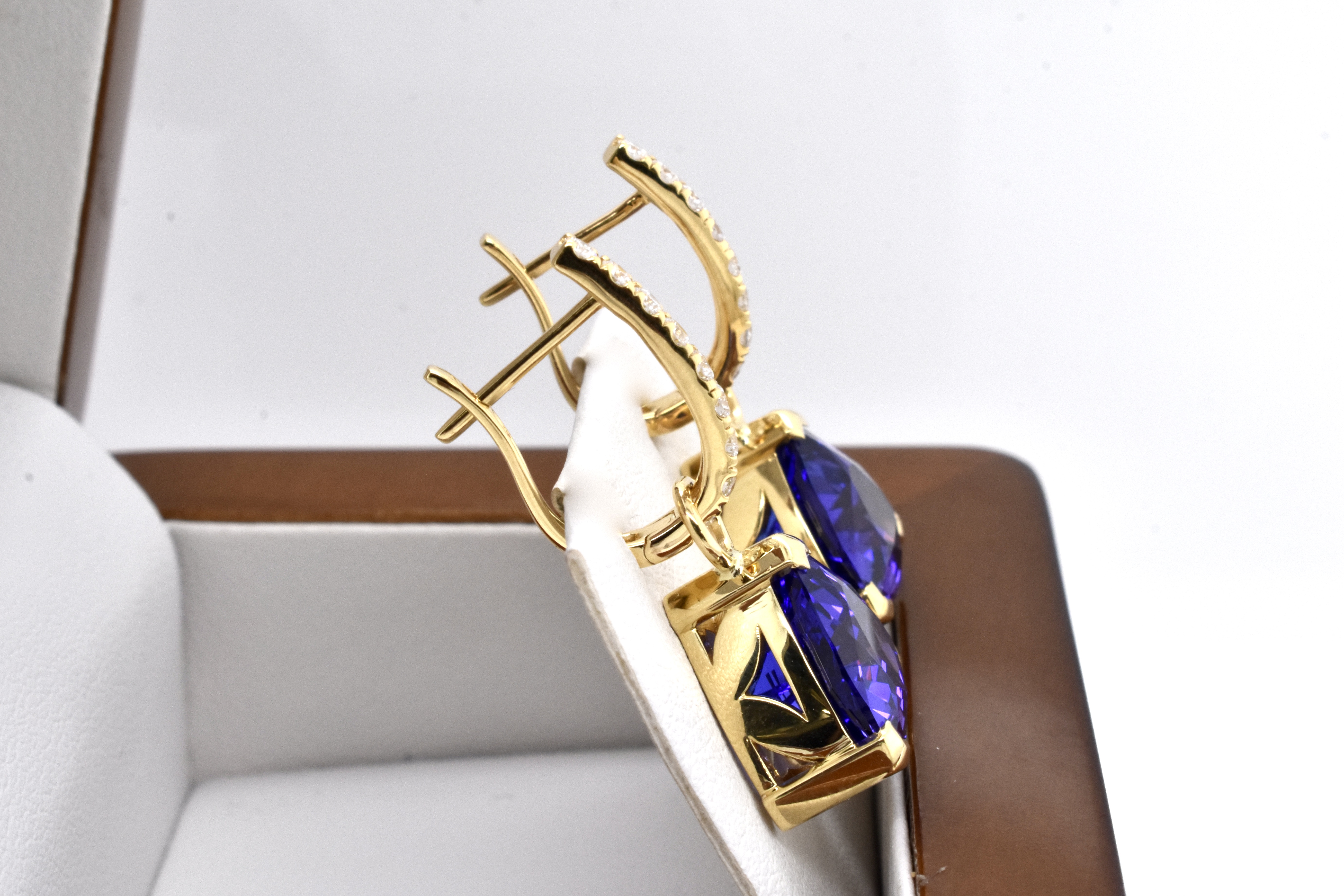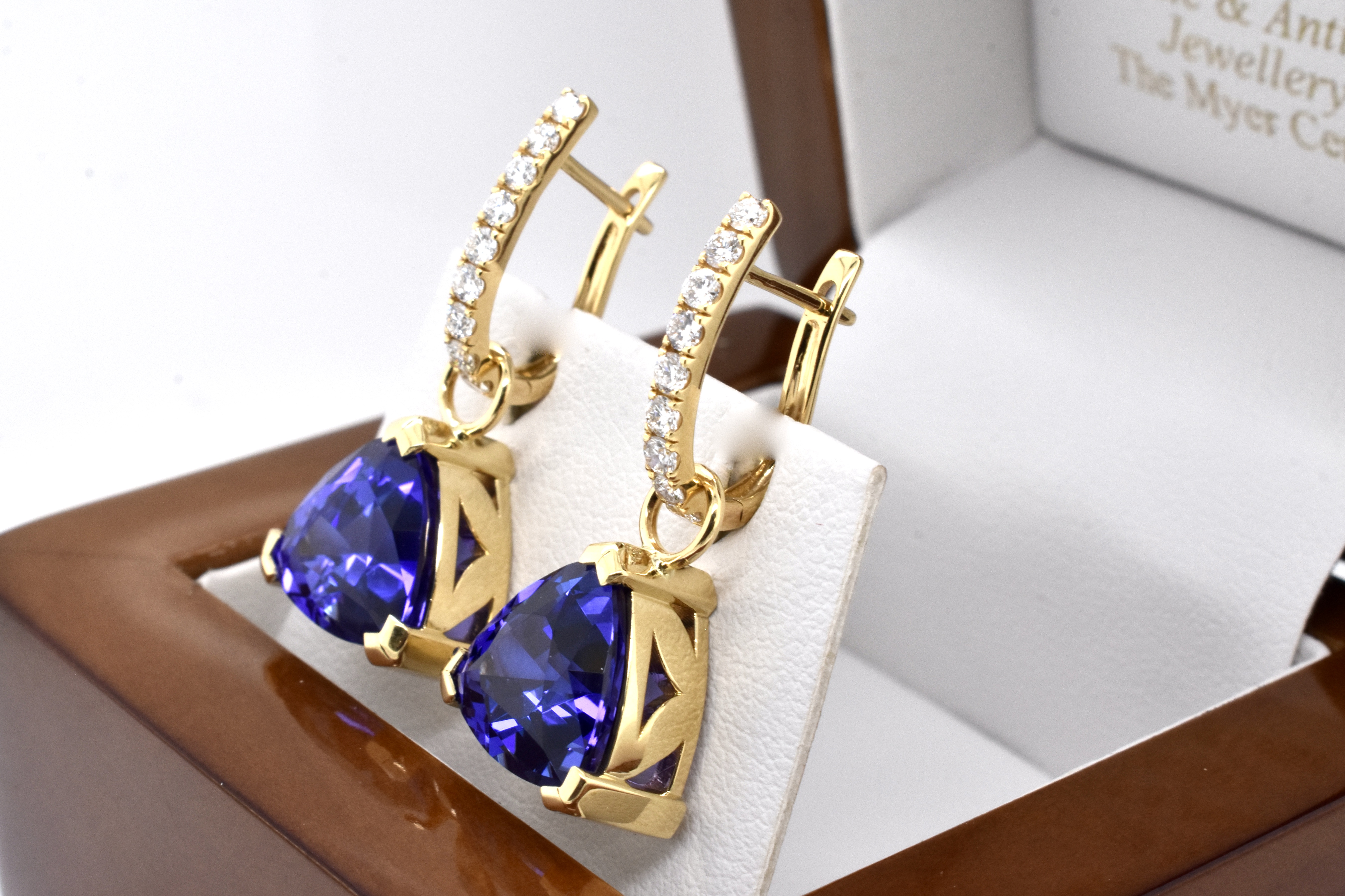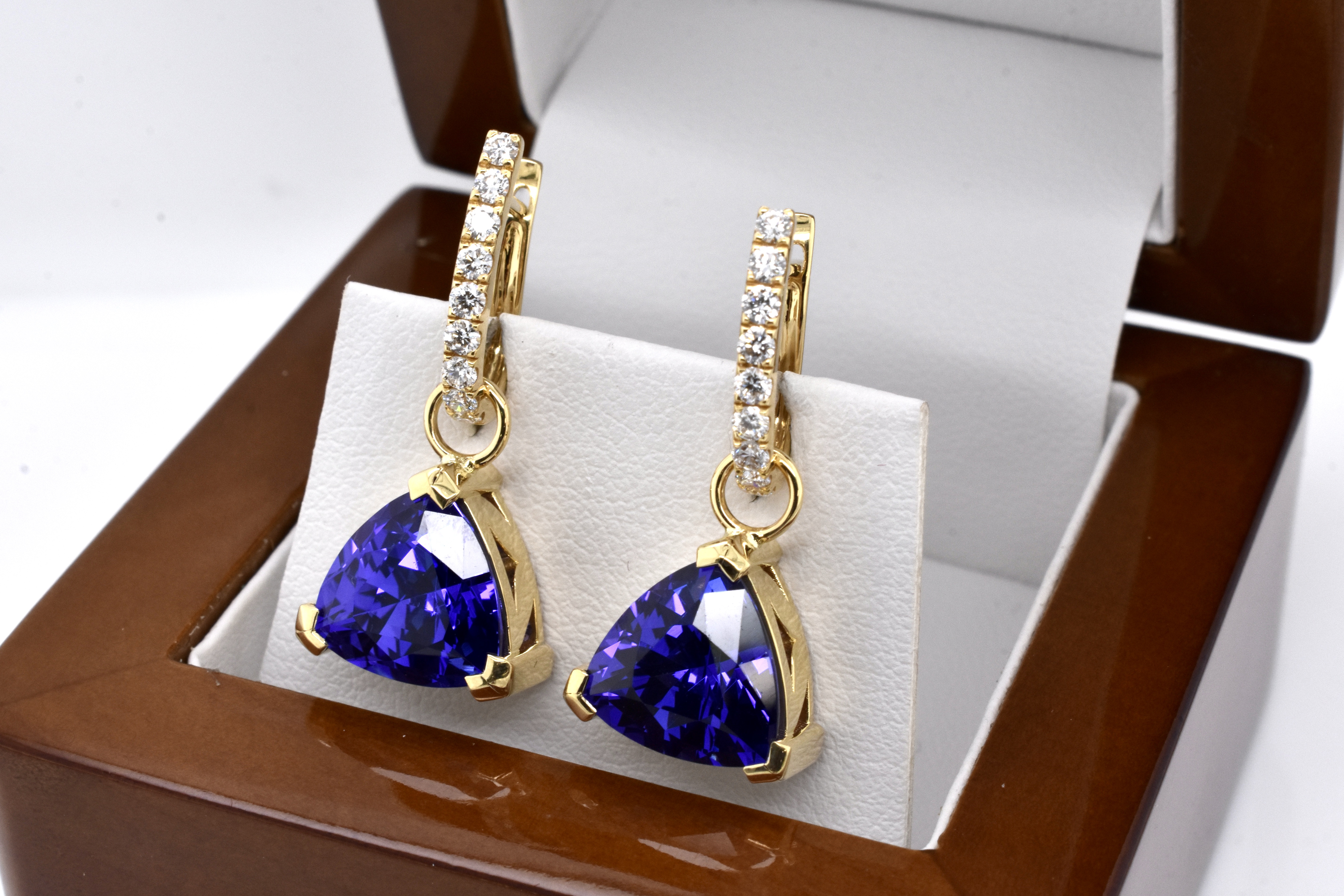 A resplendent and exquisite pair of tanzanites have been hand picked by the customer to be the feature of these earring enhancers. At a generous total of 8.93ct, these triliant cut bright dark purplish blue tanzanites have been set in 18ct yellow gold, V cap and two claw set with a beautiful matching triangular shaped cutout gallery with a plain loop. These enhancers have been specially designed as a detachable drop for diamond set huggies. Independent Valuation Supplied