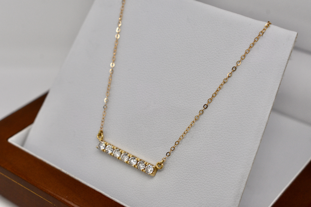 Using diamonds supplied by the customer we created this bespoke, shimmering, 18ct yellow gold diamond set bar necklace attached to a delicate diamond cut cable link. This bespoke creation is being enjoyed by its new owner, if you are inspired by this archived design contact us today to discuss how we can create something incredible for you or your loved one.