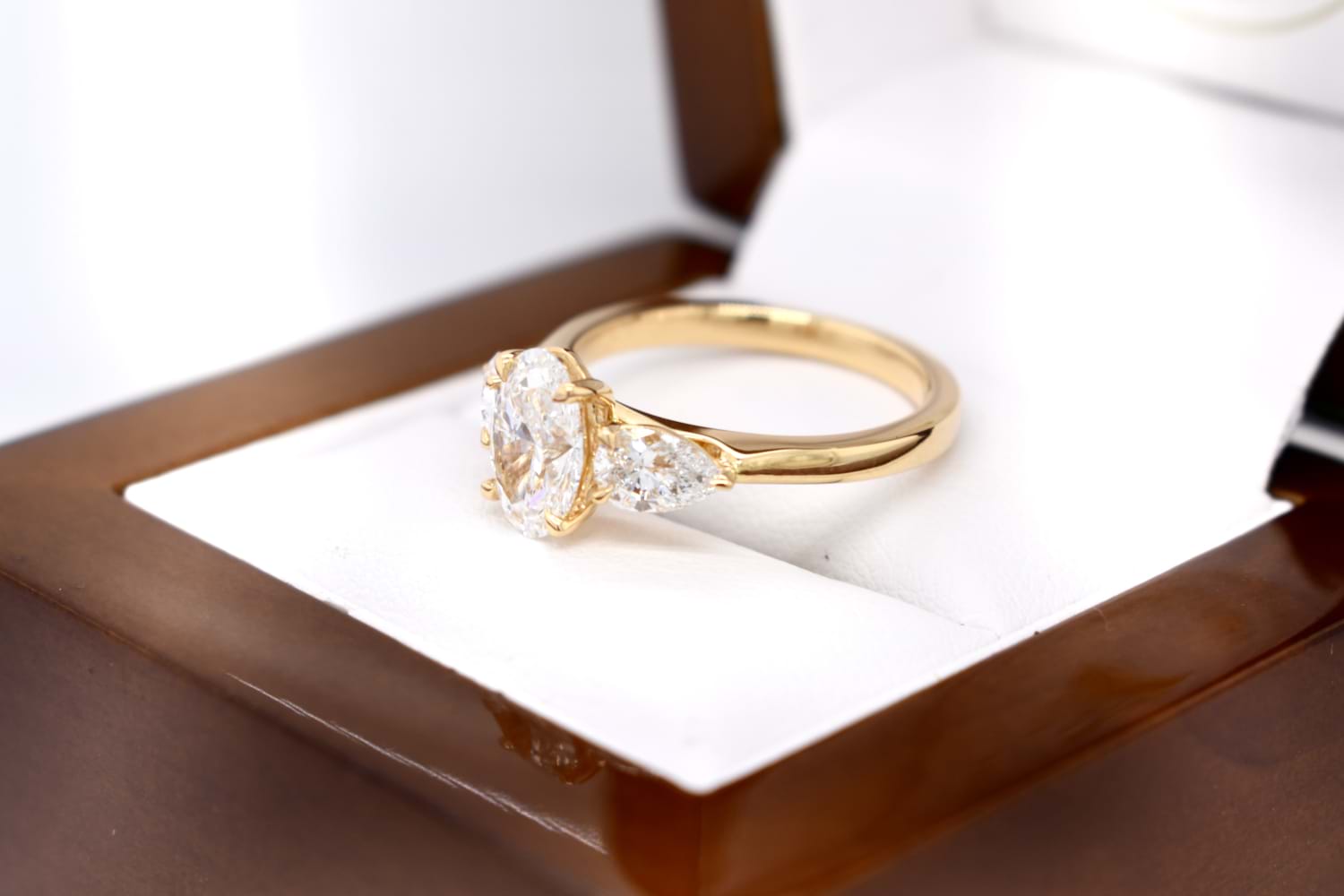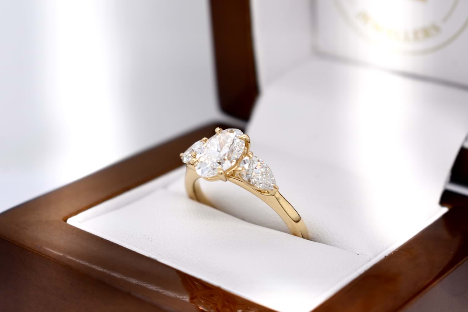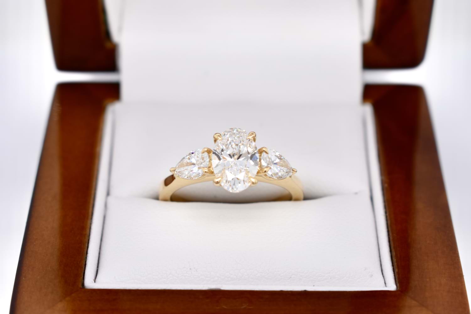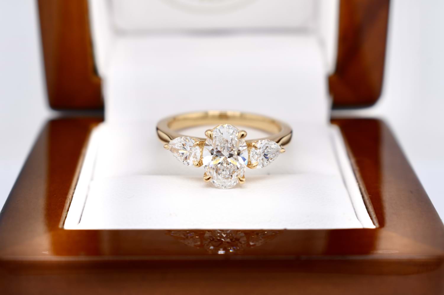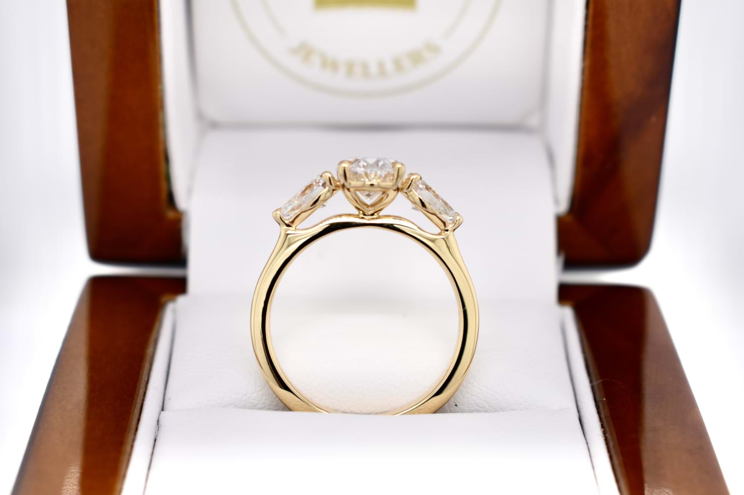 A custom made engagement ring designed especially to suit our clients needs. Crafted in 18ct yellow gold the ring features an oval centre with a pearshape laboratory grown diamond set on each side. The total diamond content is 2.36ct and the ring has been designed to sit with a wedding band of choice in future.
