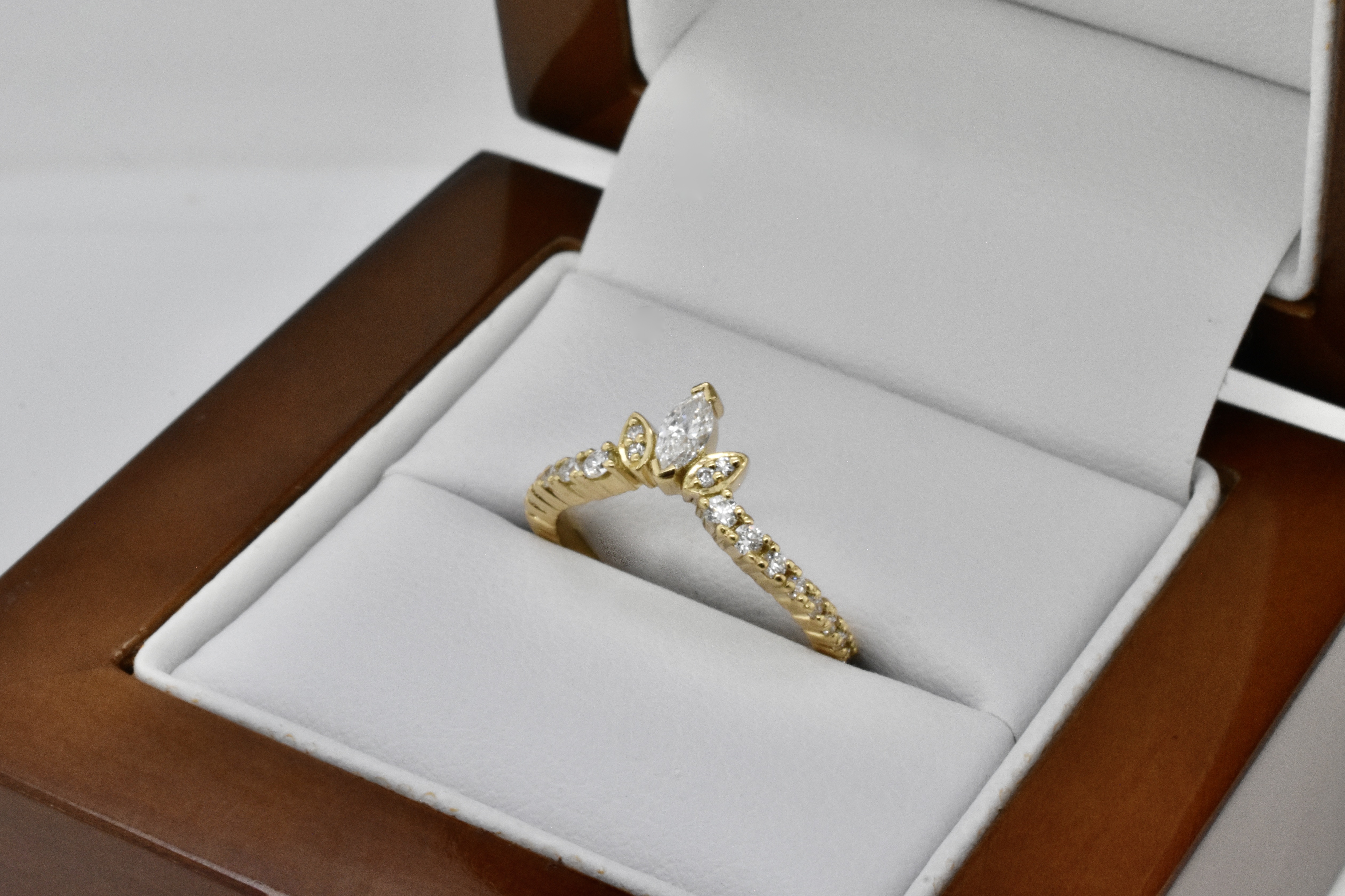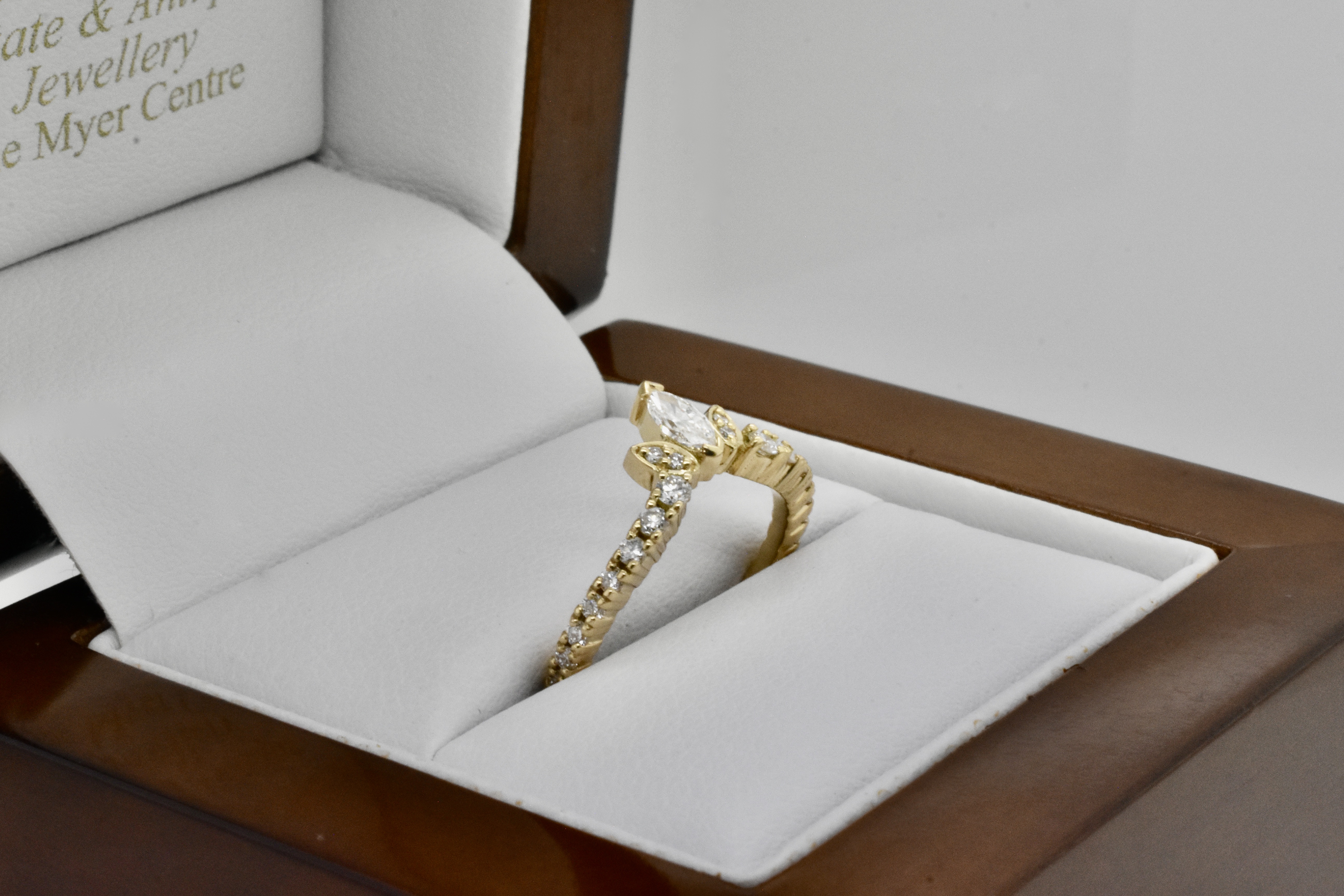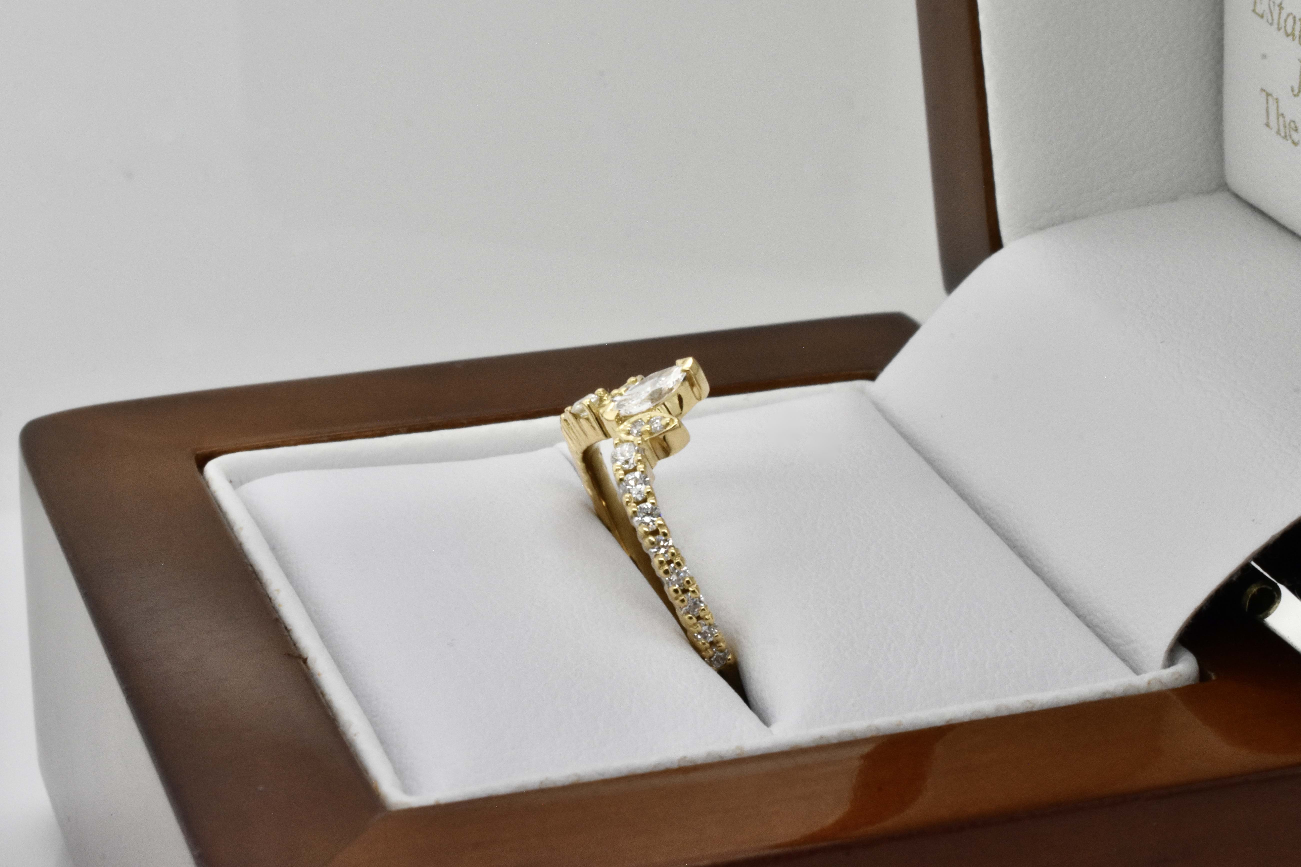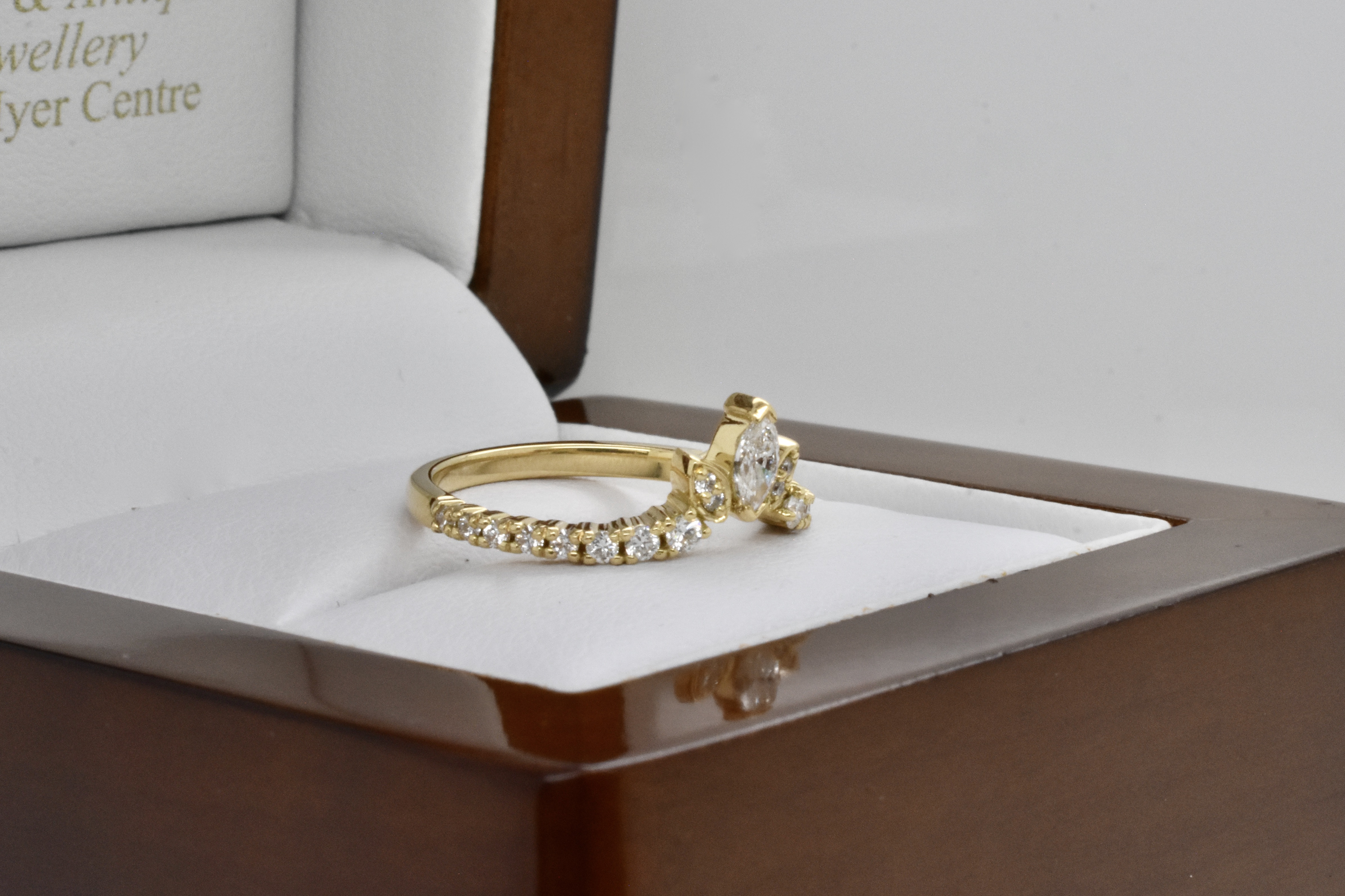 Feminine and beautiful 18ct yellow gold custom fitted wedding band, designed in store to fit our clients custom engagement ring made previously(pictured). The band features a two cap set 0.14ct marquise diamond with two round diamonds in a grain set marquise bezel on each side and graduated round brilliant cut diamonds set at a soft sweeping angle down each side. Total diamond content equals 0.37cts. Independent Valuation Supplied.