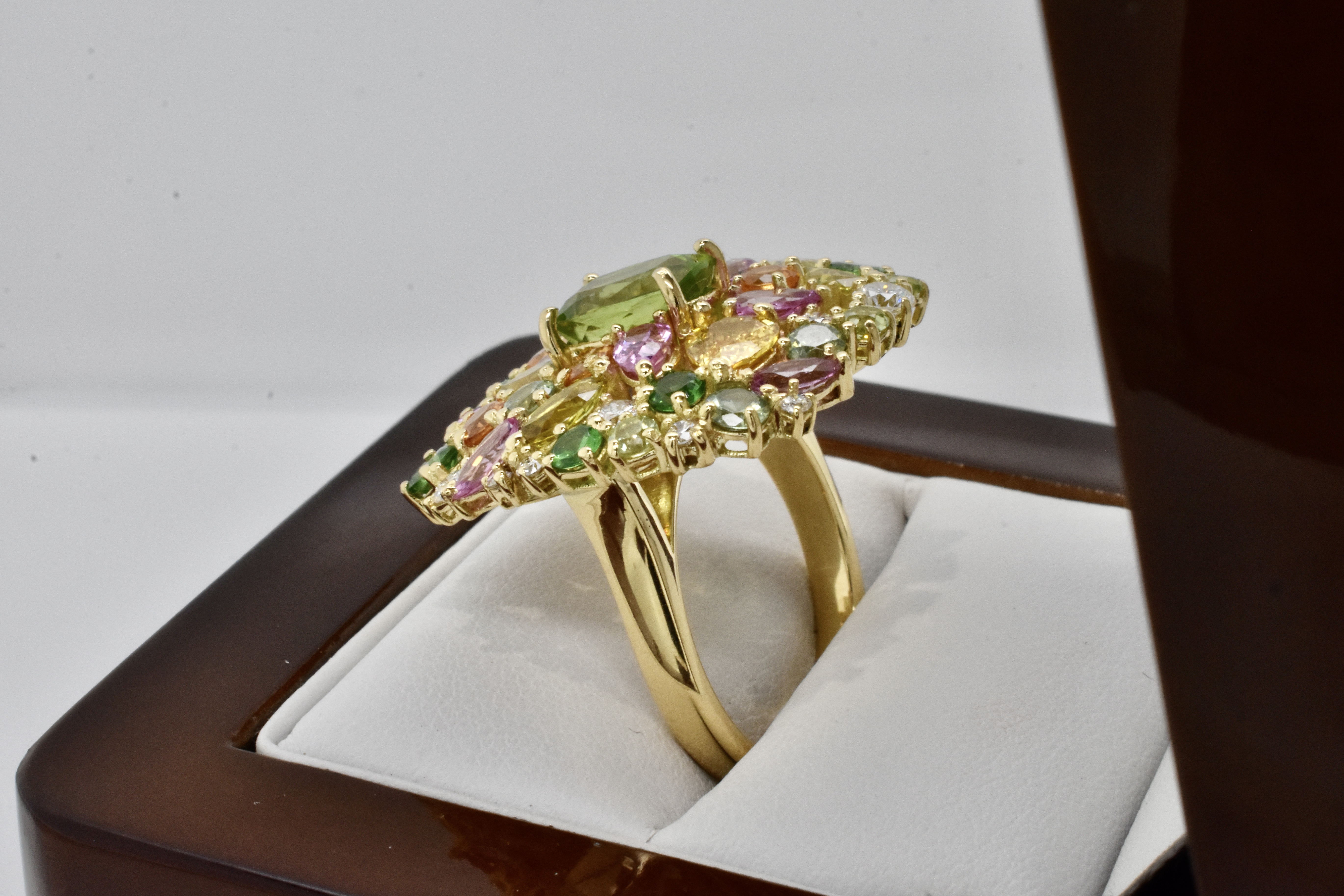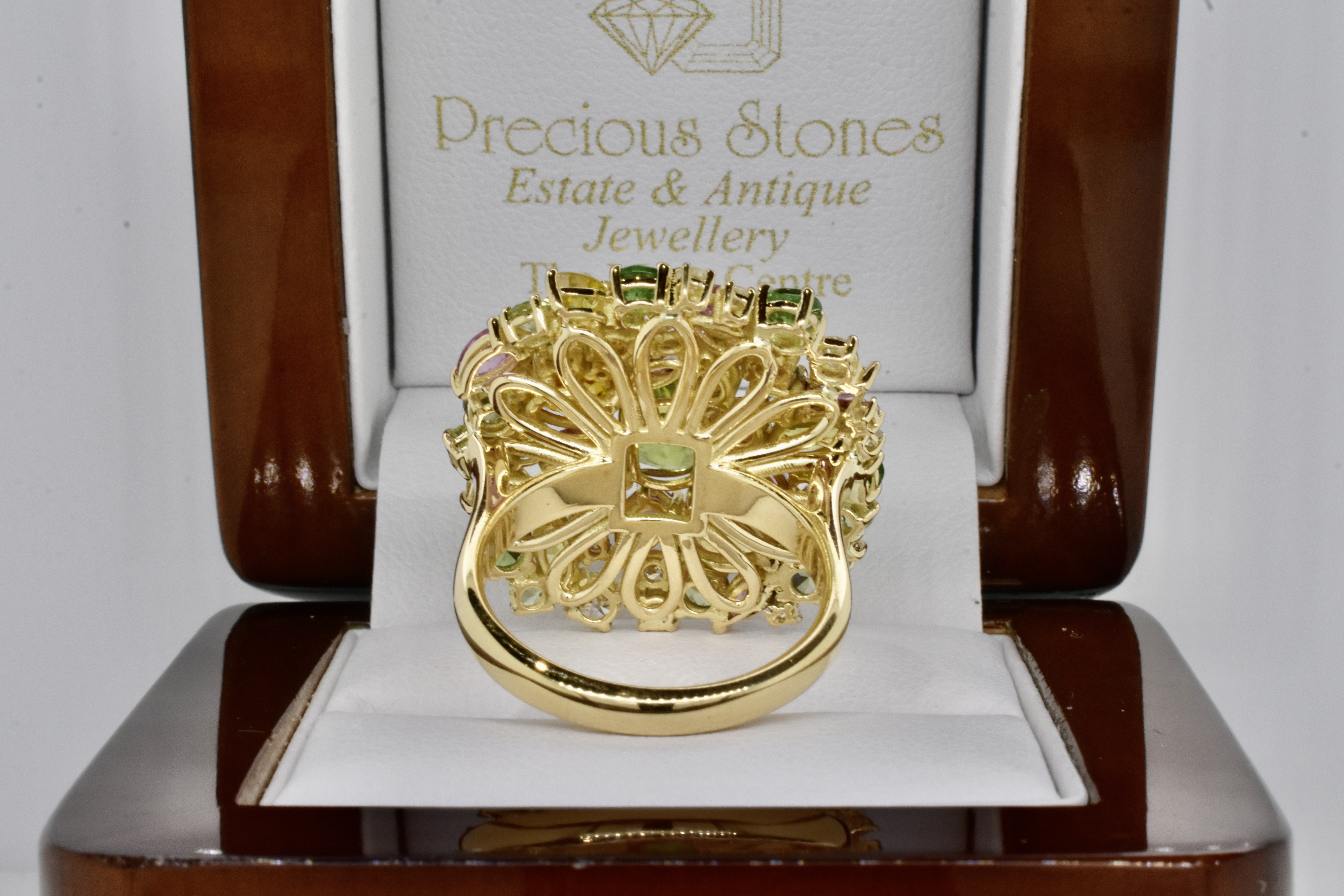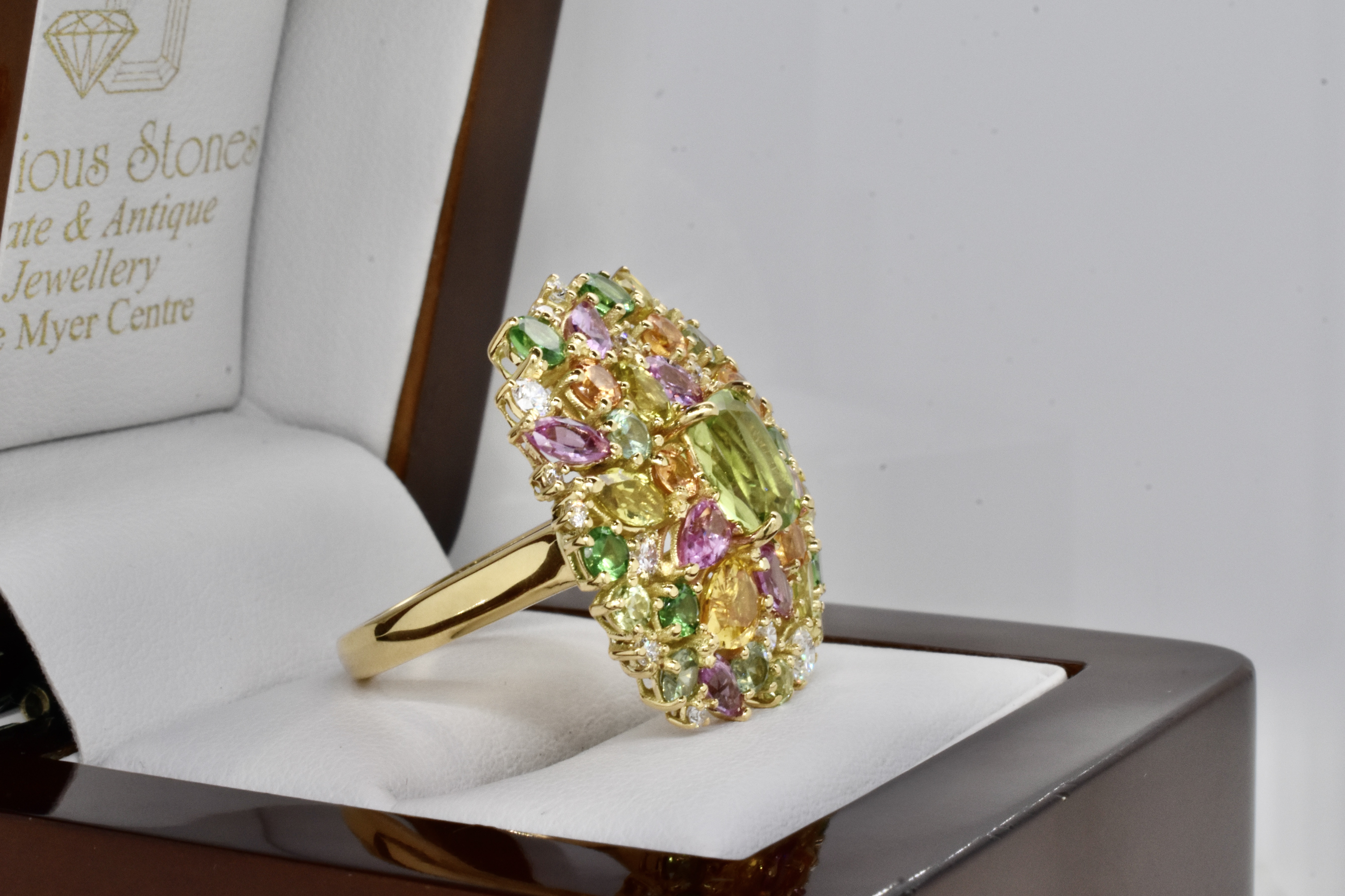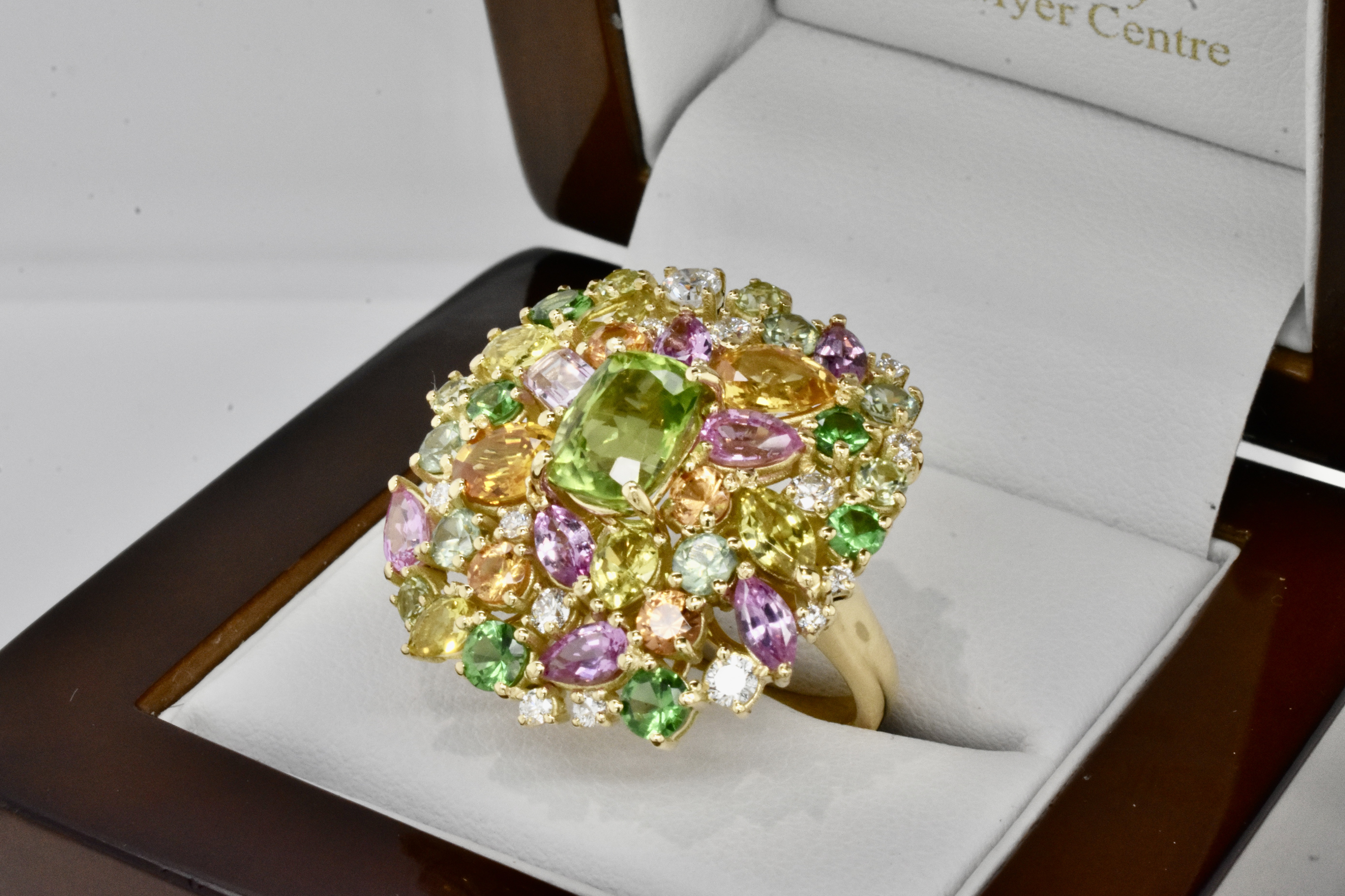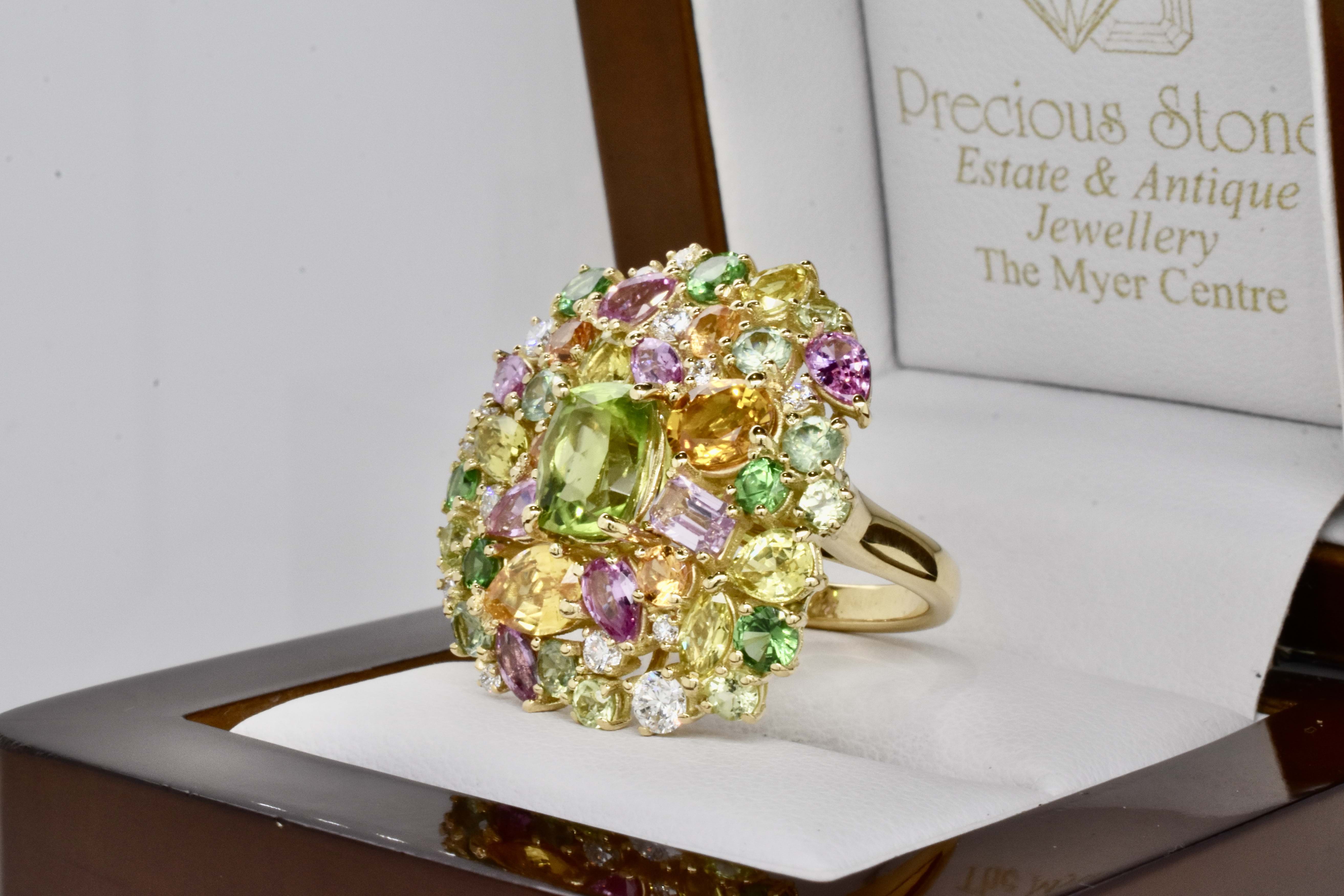 This fabulous and eye catching design features a compilation of 47 stones arranged in a beautiful and asymmetrical cluster with a stunning central cushion cut peridot. The ring has been crafted in 18ct yellow gold and contains 2.54cts of Peridots, 2.09cts of Garnets, 4.02cts of Sapphires & 0.48cts of Diamonds. Independent Valuation Supplied.