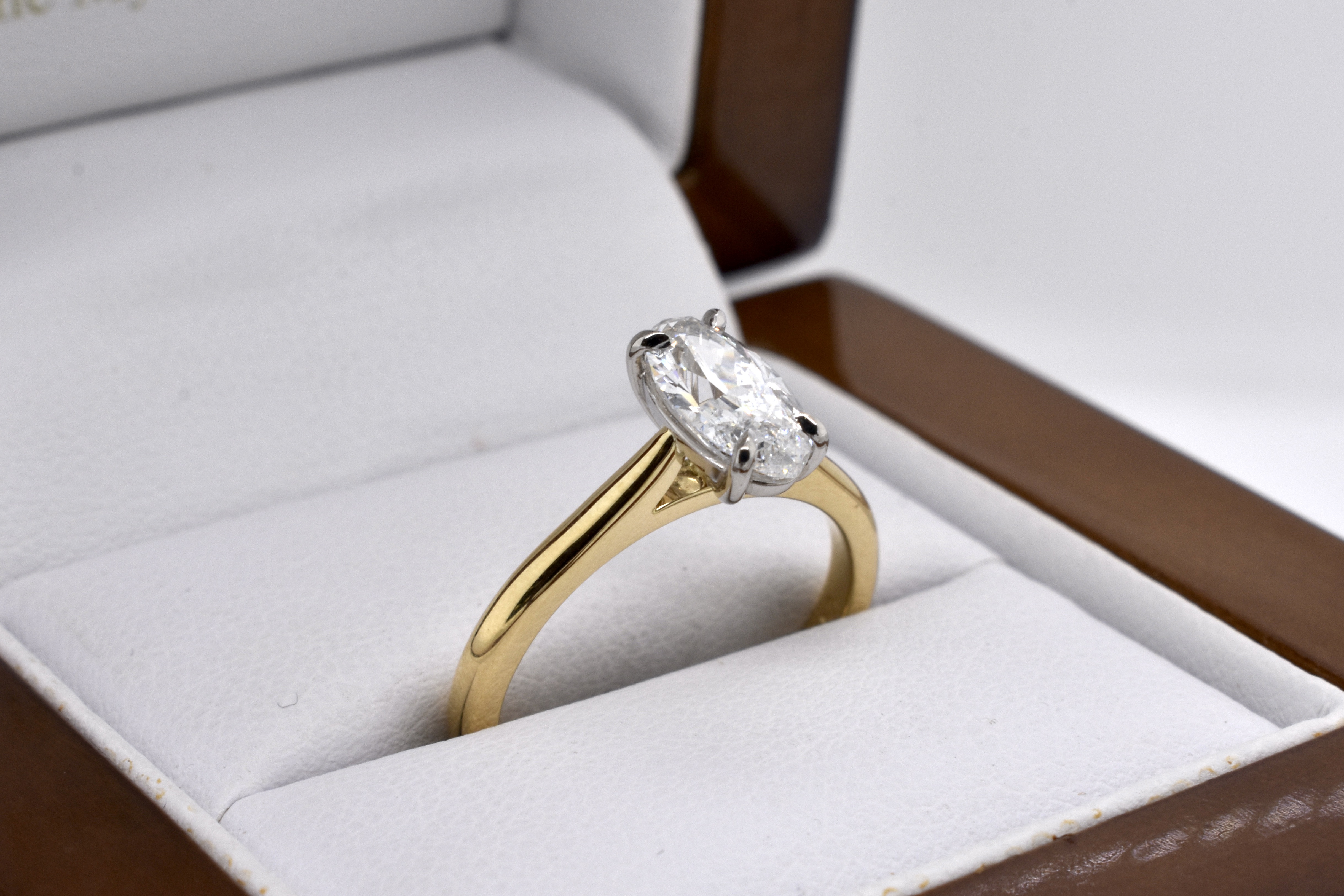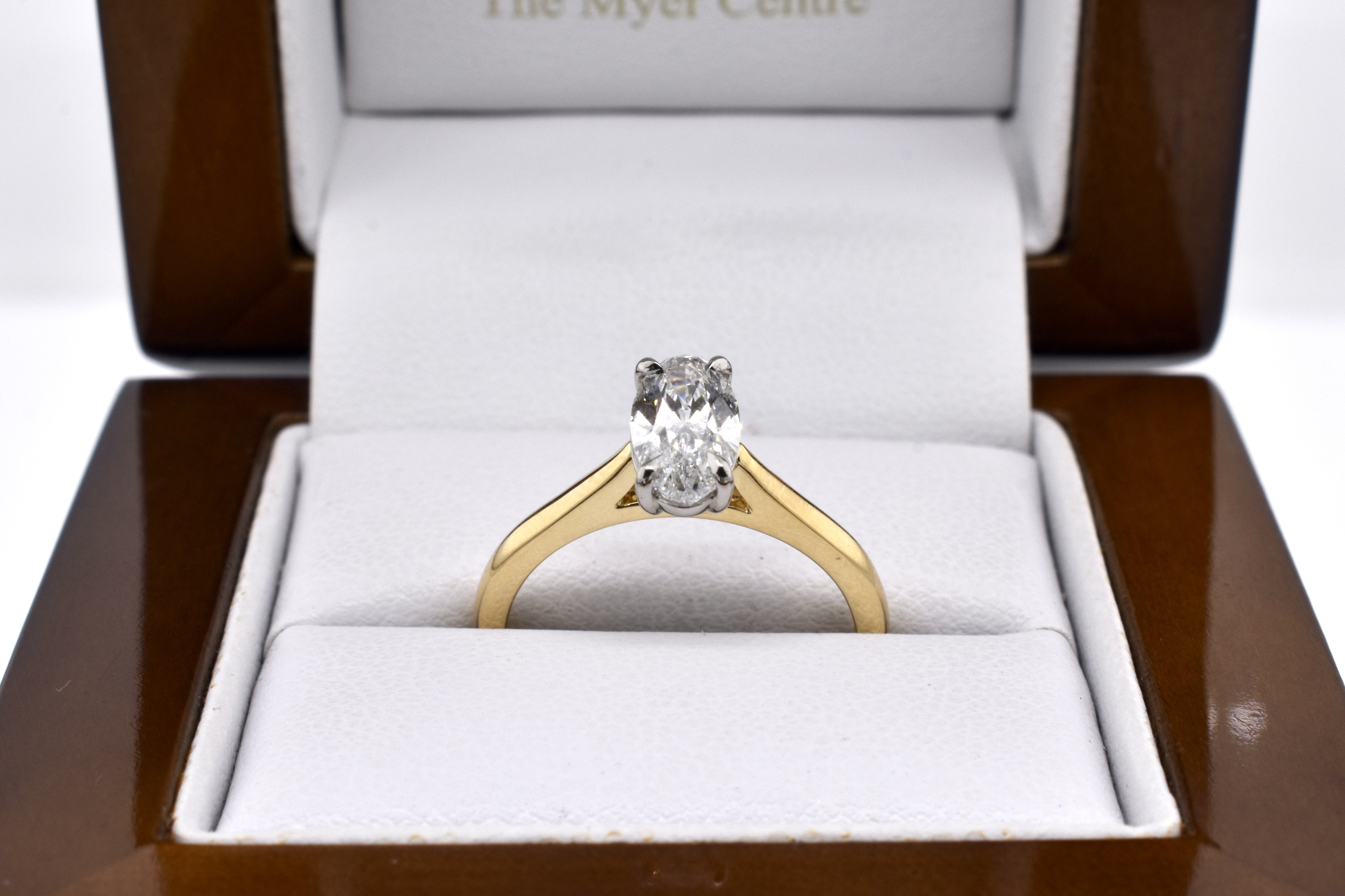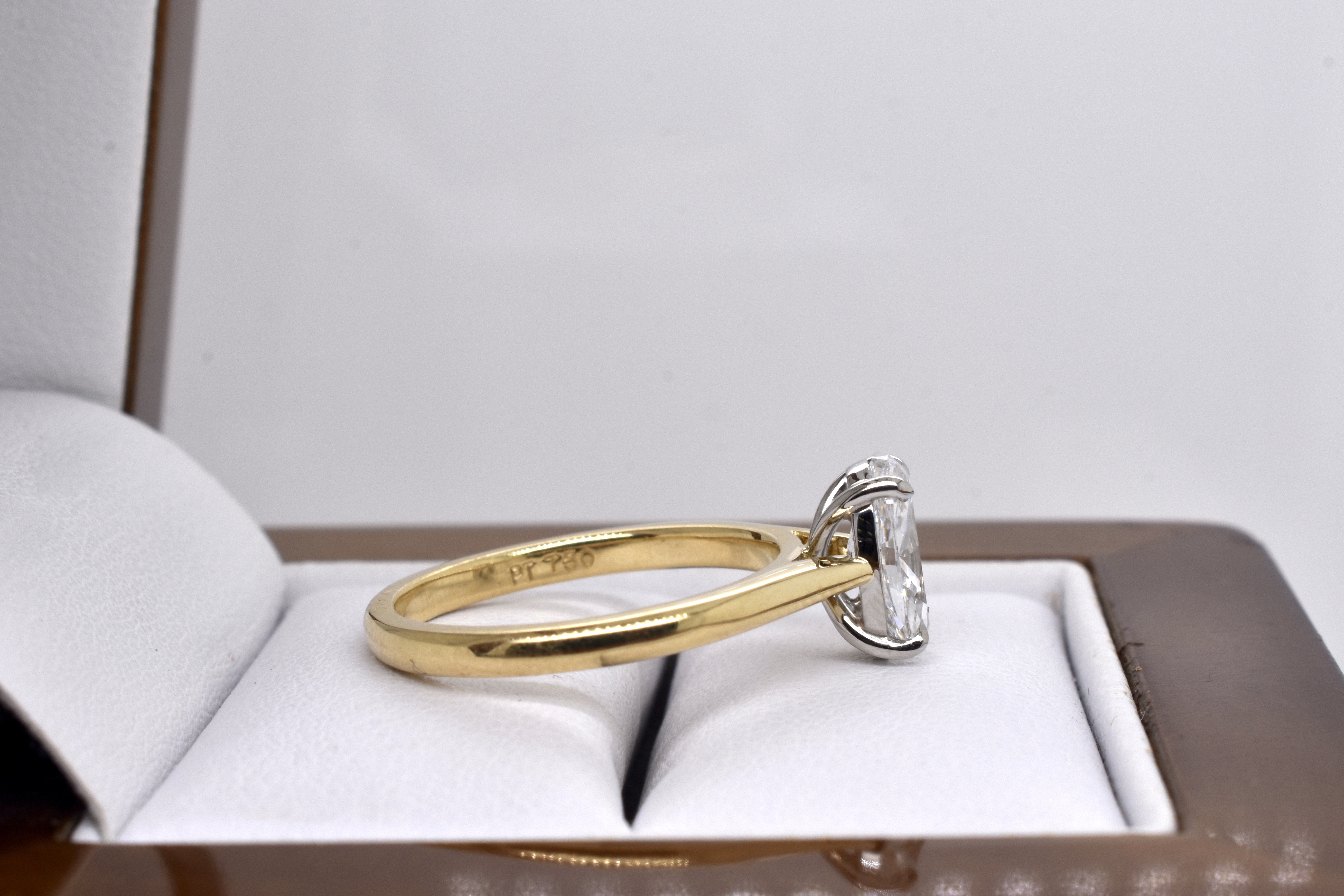 This scintillating and beautiful elongated oval cut diamond was hand chosen instore to be the focus of this contemporary and timeless engagement ring. The 1.01ct oval diamond is four claw set in platinum with a plain 18ct yellow gold band, designed to sit perfectly next to the wedding band of choice in future. GIA Certificate & Independent Valuation Supplied