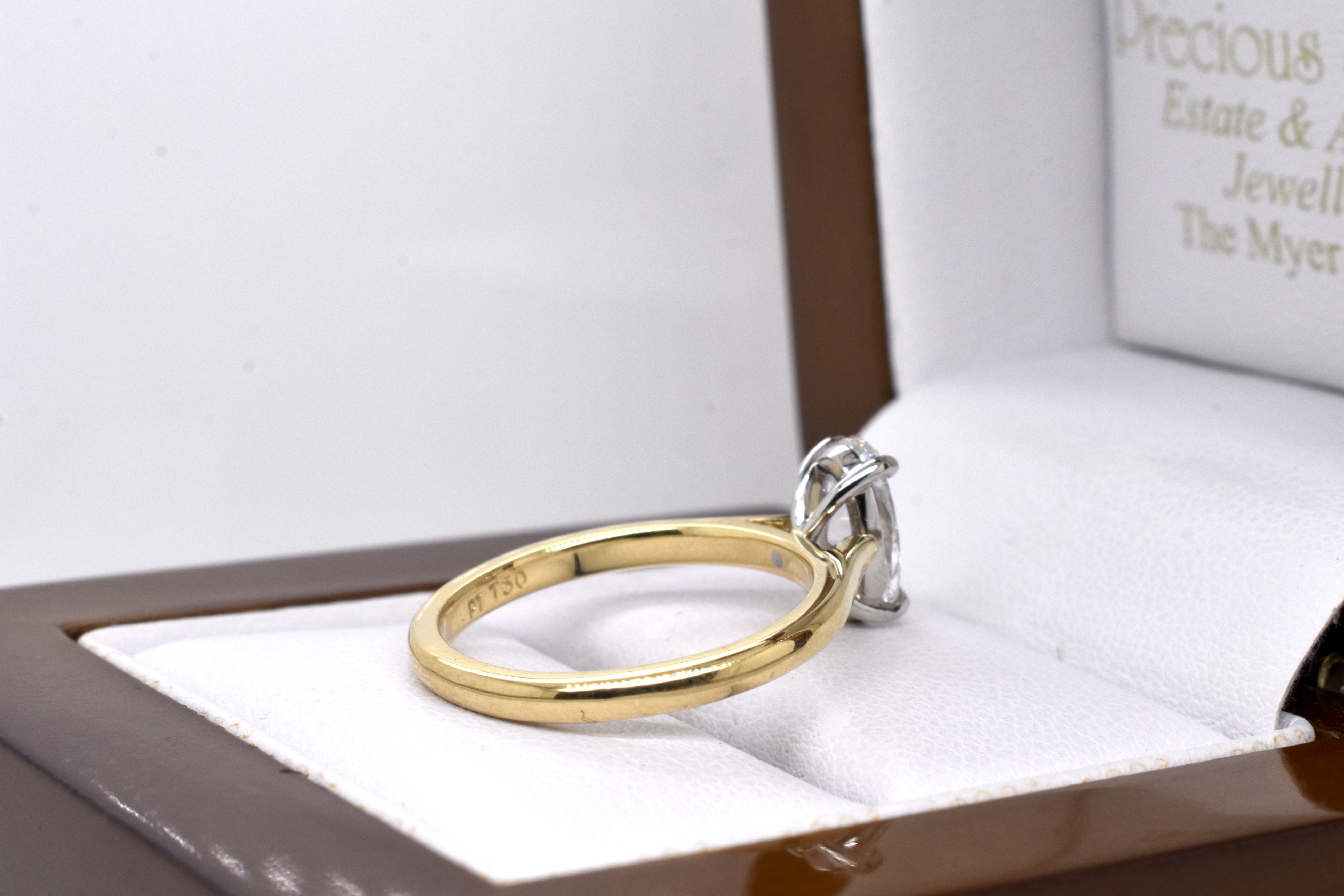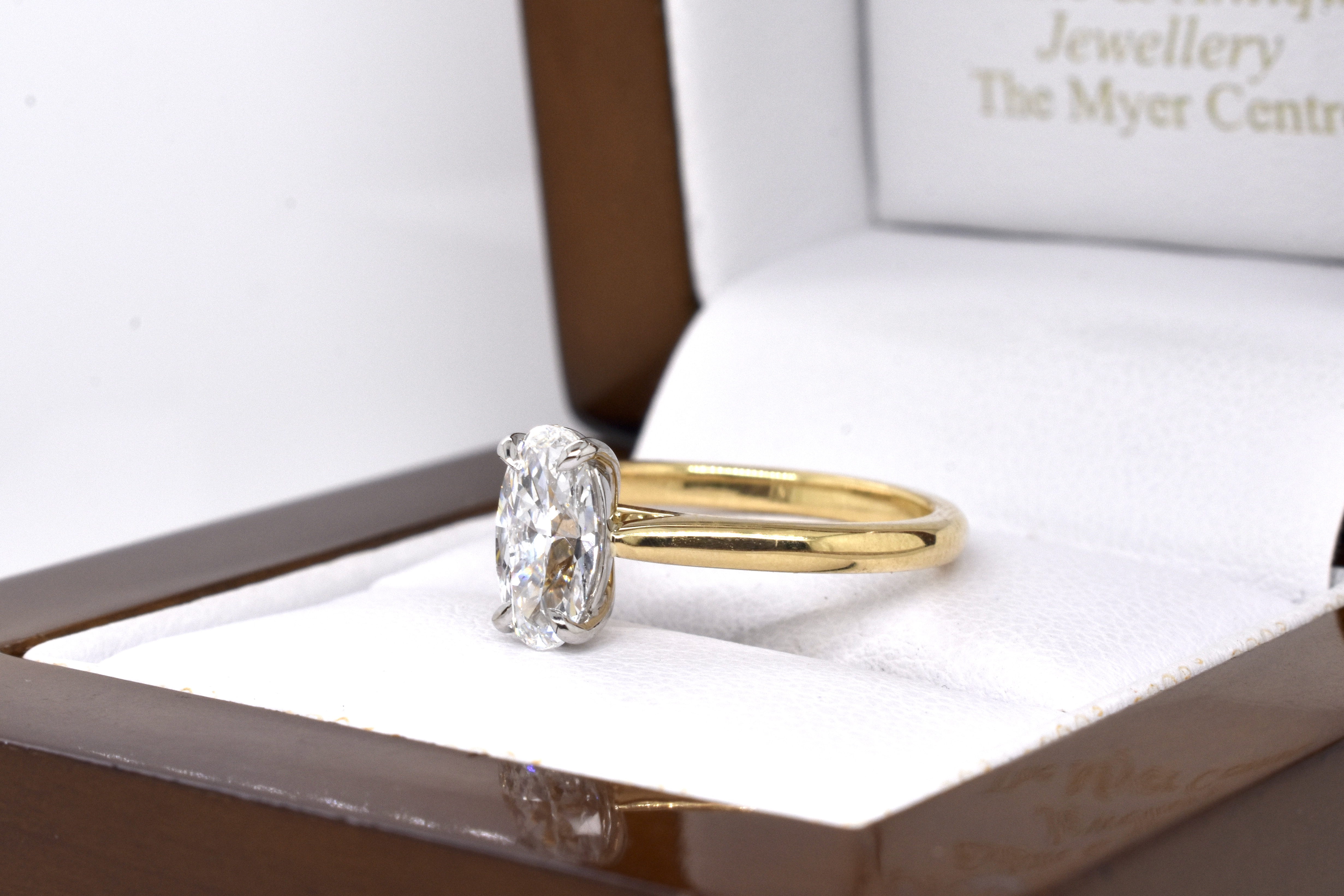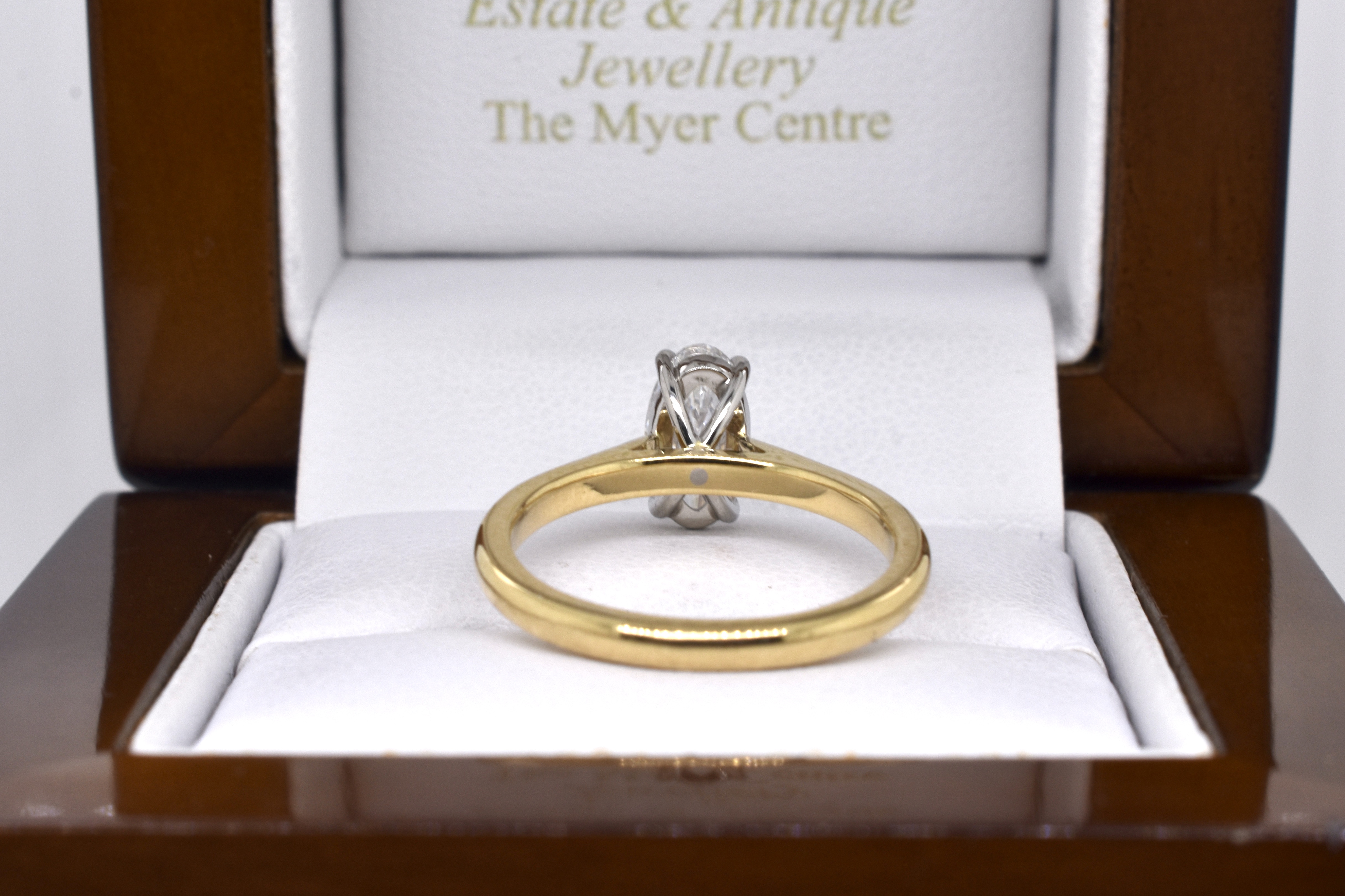This scintillating and beautiful elongated oval cut diamond was hand chosen instore to be the focus of this contemporary and timeless engagement ring. The 1.01ct oval diamond is four claw set in platinum with a plain 18ct yellow gold band, designed to sit perfectly next to the wedding band of choice in future. GIA Certificate & Independent Valuation Supplied