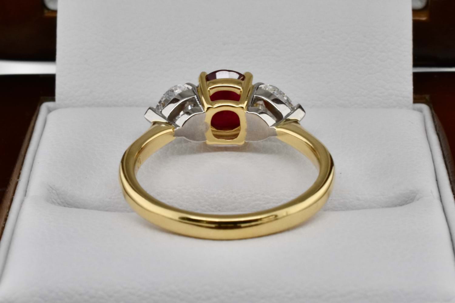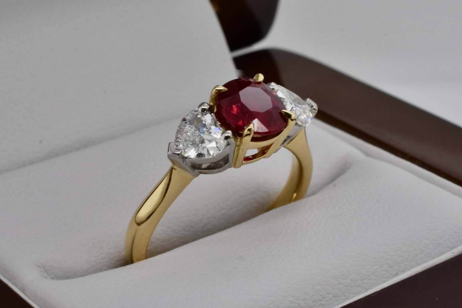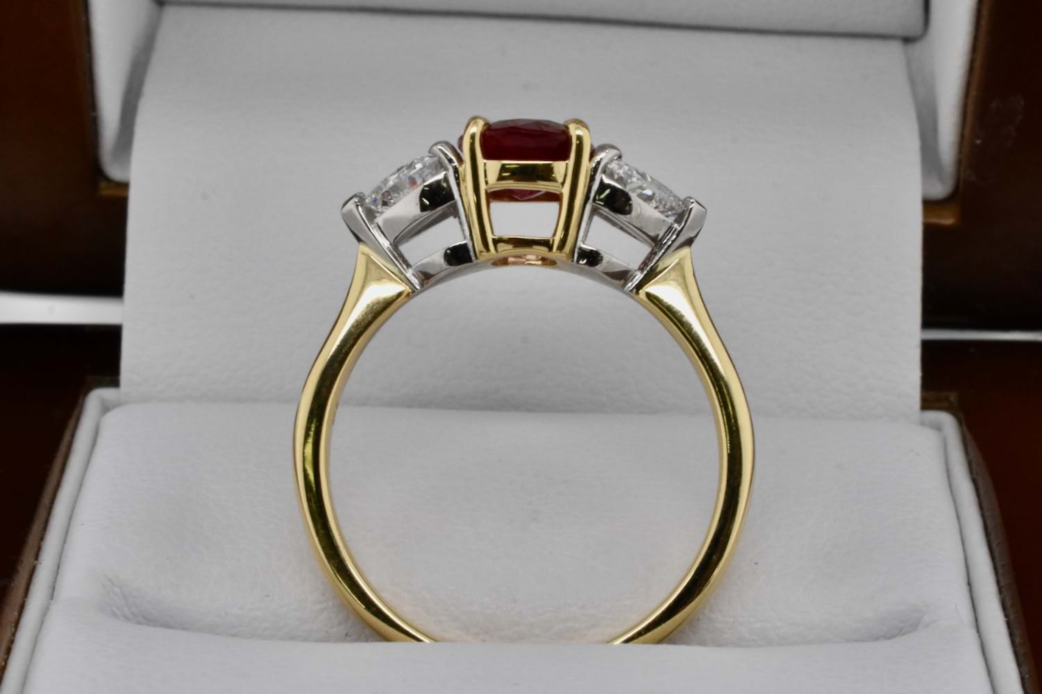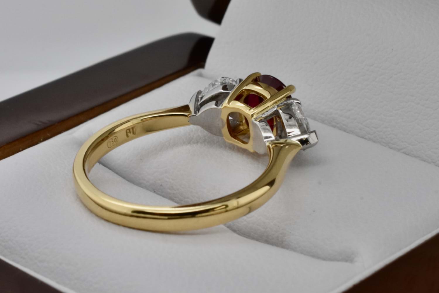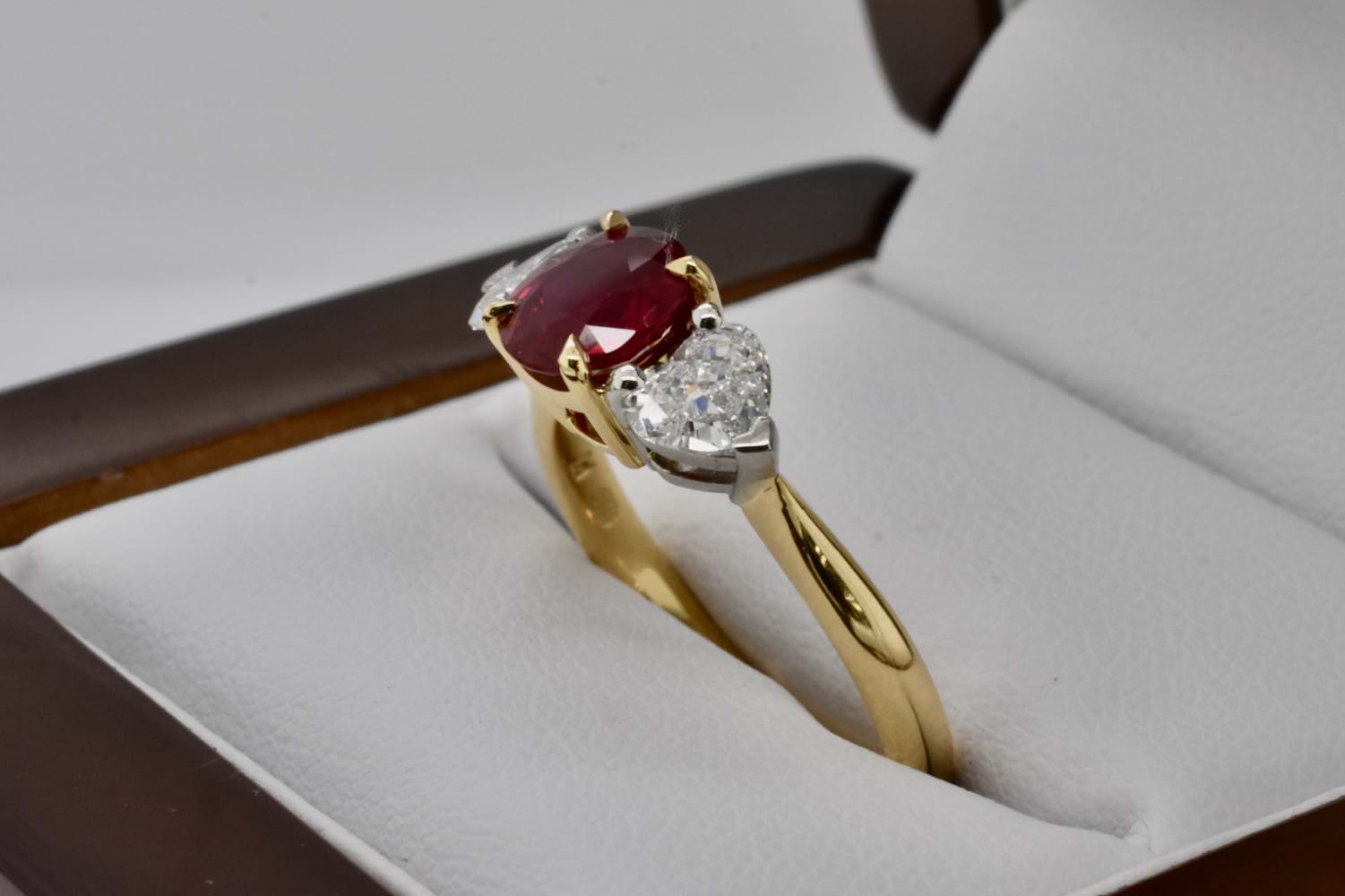 Seeking a rare and high quality Burmese ruby our client was given the opportunity to hand choose the ruby of her choice in store from a specially curated selection. Having chosen this stunning, bright, dark red, 1.19ct Burmese ruby, our design consultant worked with our client to pair these beautiful heart shape diamonds to sit on each side as a compliment to the ruby feature. The ring has been expertly crafted in our workshop in 18ct yellow gold and platinum and the two heart shape diamonds equal 0.63cts (DE/VVS2). Independent Valuation Supplied.