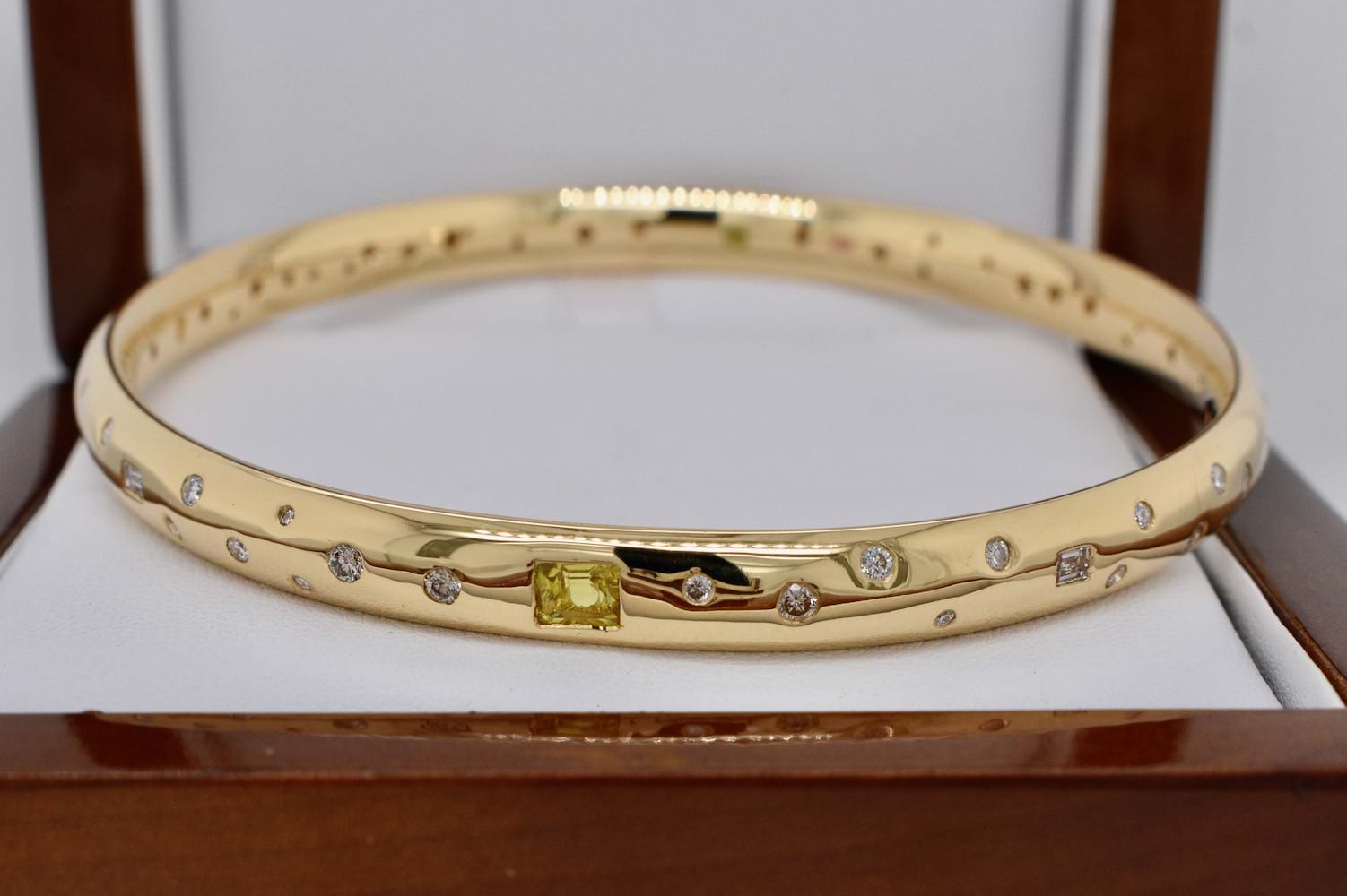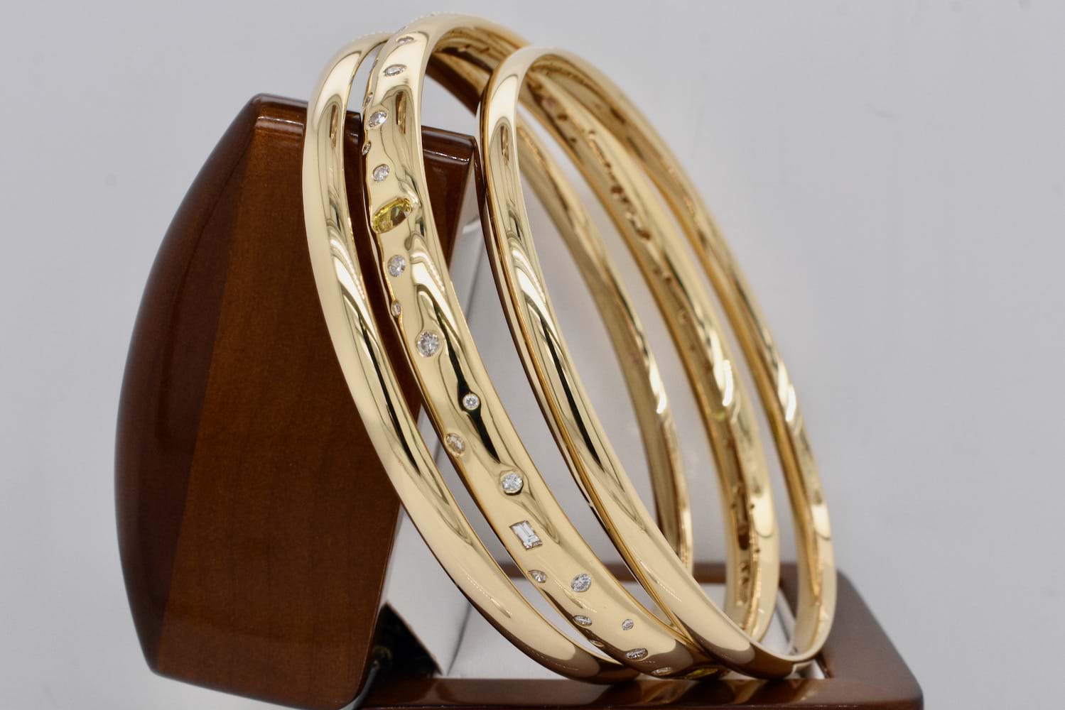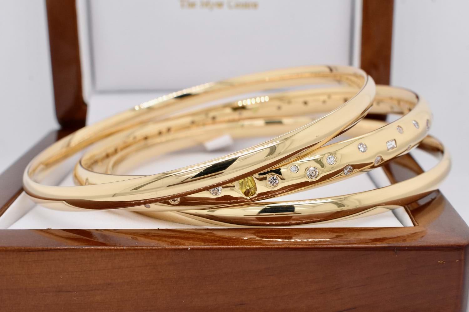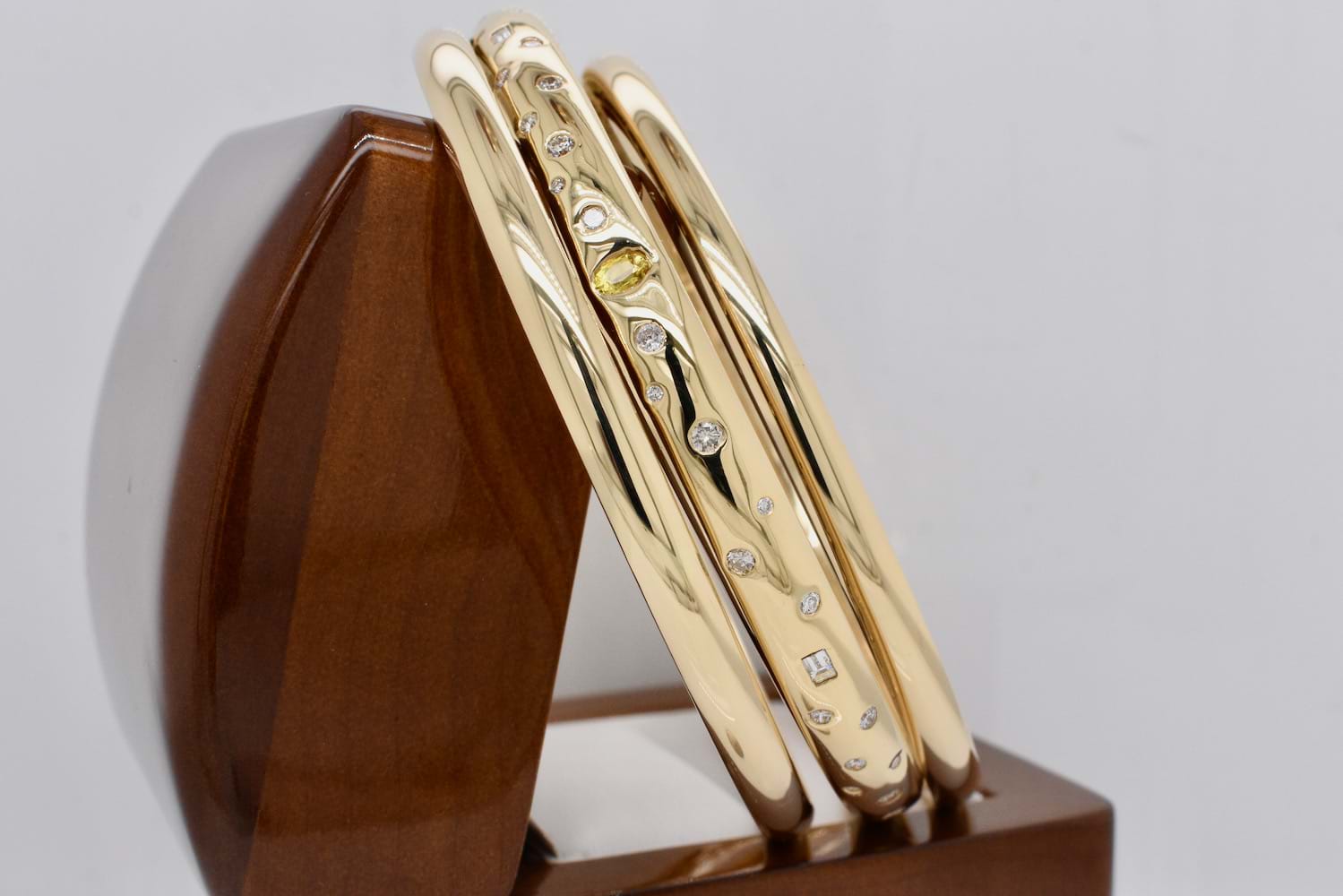 Handmade by our skilled goldsmith these stunning 18ct yellow gold bangles were made using recycled gold supplied by our client. Two of the solid bangles were left plain, whilst one has been set with a scattering of shimmering diamonds and yellow sapphires, some supplied by our client and some purchased in store. Independent Valuation Supplied.