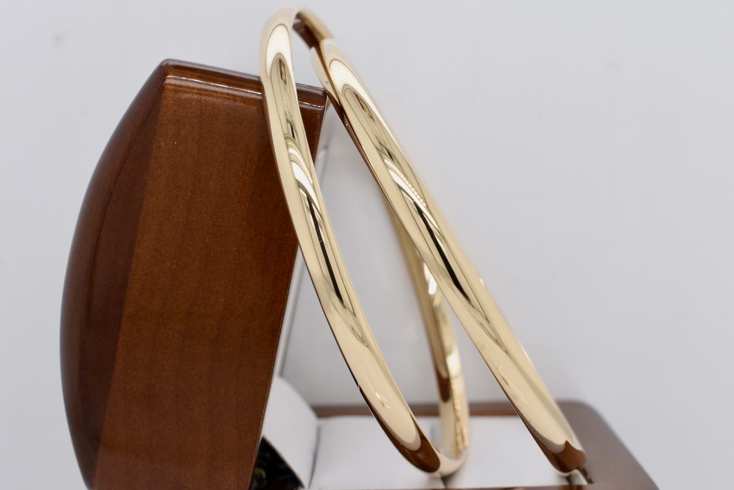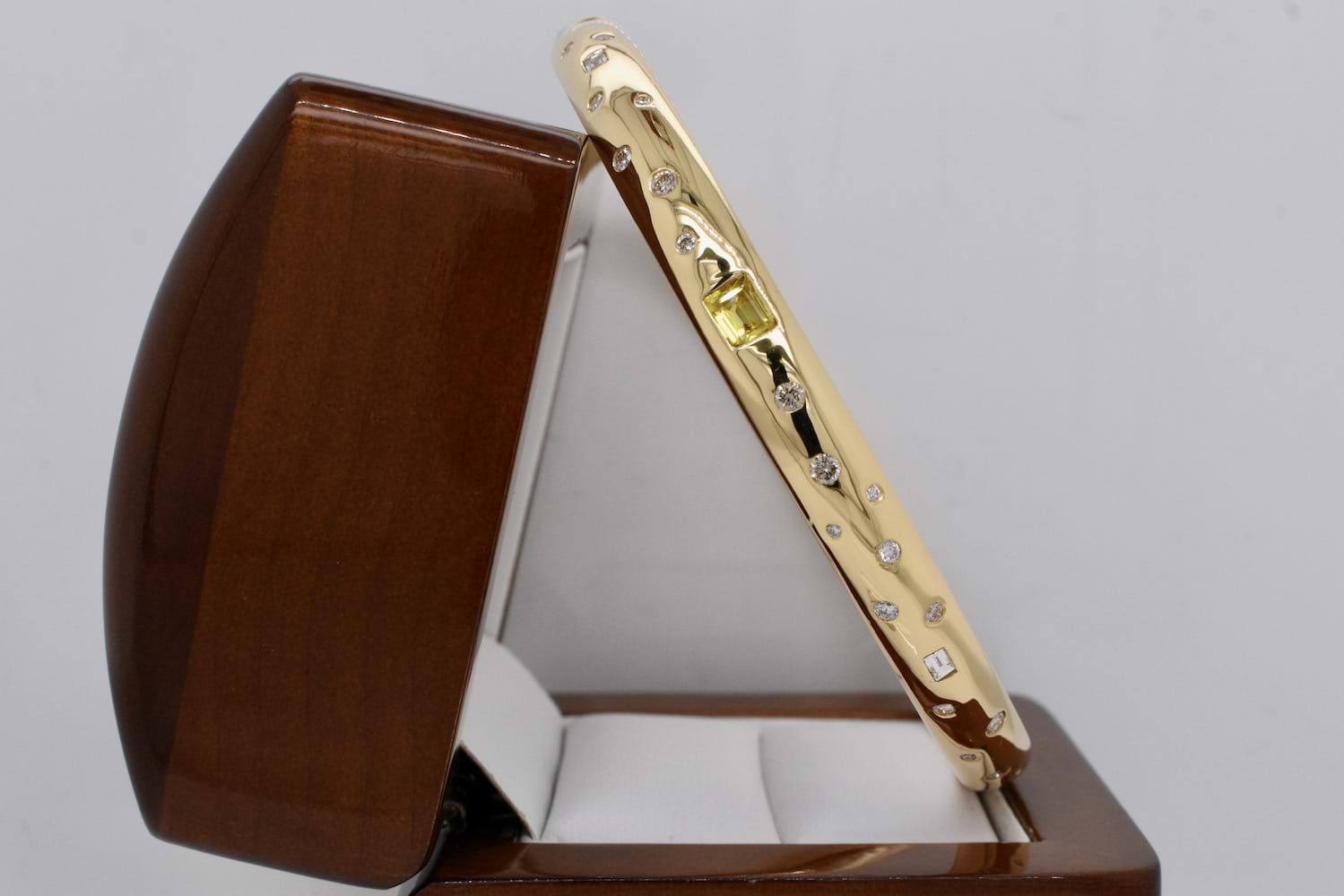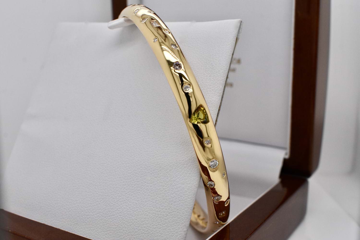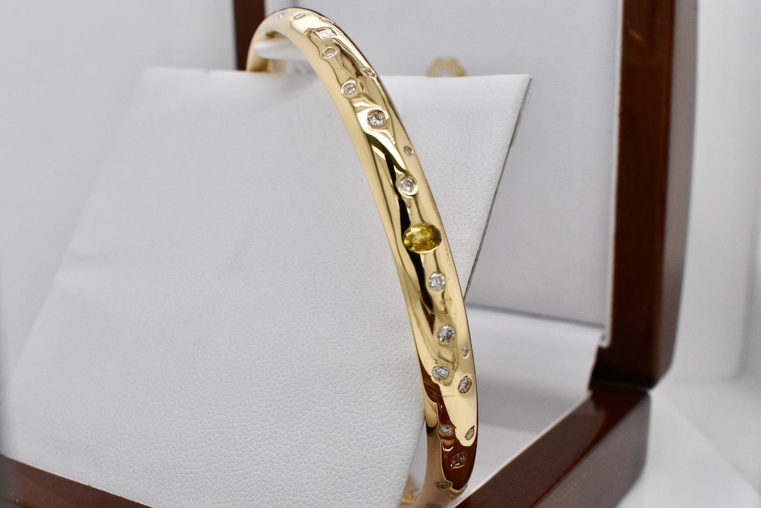 Handmade by our skilled goldsmith these stunning 18ct yellow gold bangles were made using recycled gold supplied by our client. Two of the solid bangles were left plain, whilst one has been set with a scattering of shimmering diamonds and yellow sapphires, some supplied by our client and some purchased in store. Independent Valuation Supplied.