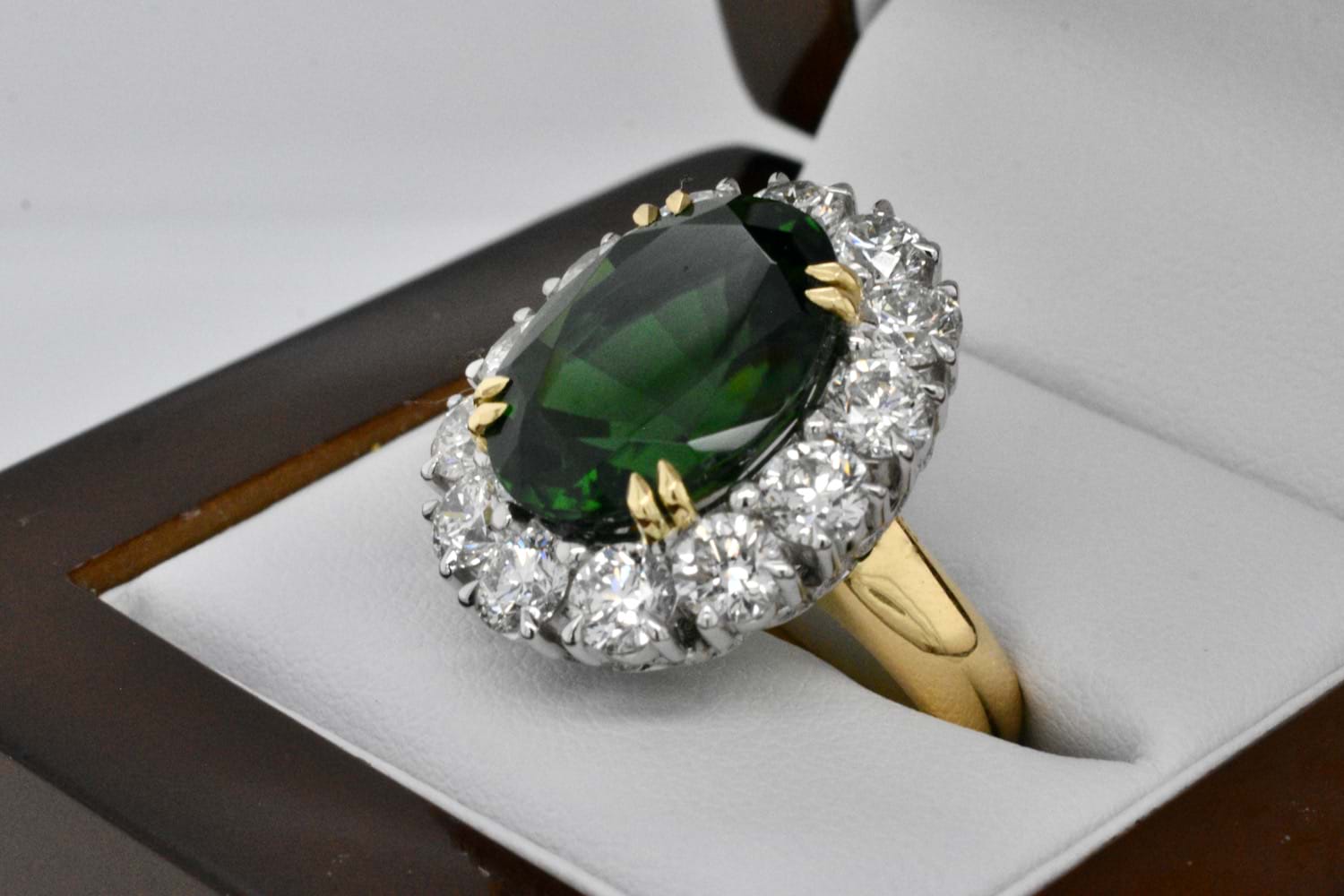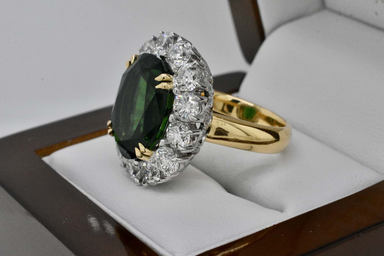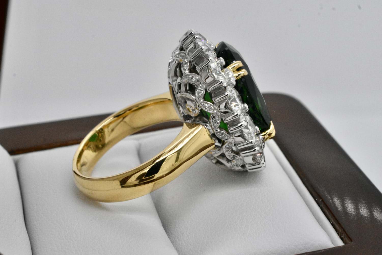 This show stopping and totally fantastic bespoke creation features an epic 11.10ct bright dark green (Chrome) tourmaline surrounded by thirteen scintillating round brilliant cut diamonds totalling close to 4cts- this fabulous ring is not for the faint of heart! The ring has been handmade in 18ct yellow and white gold with a decorative diamond set basket containing an additional 40 shimmering diamonds equalling 0.13cts. Independent Valuation Supplied.
