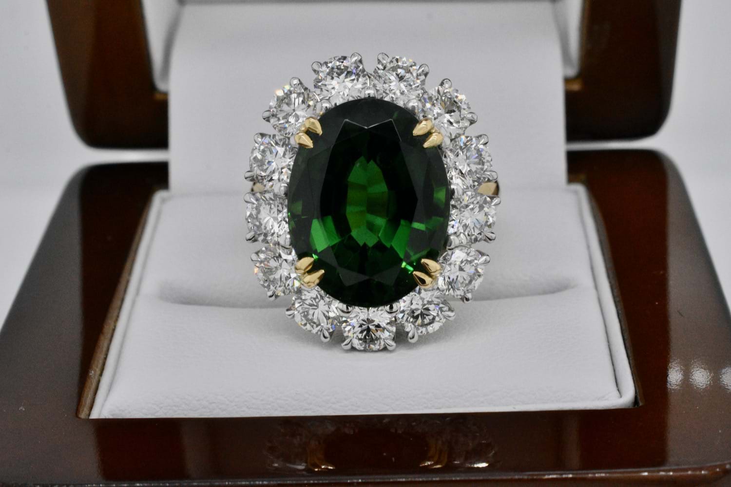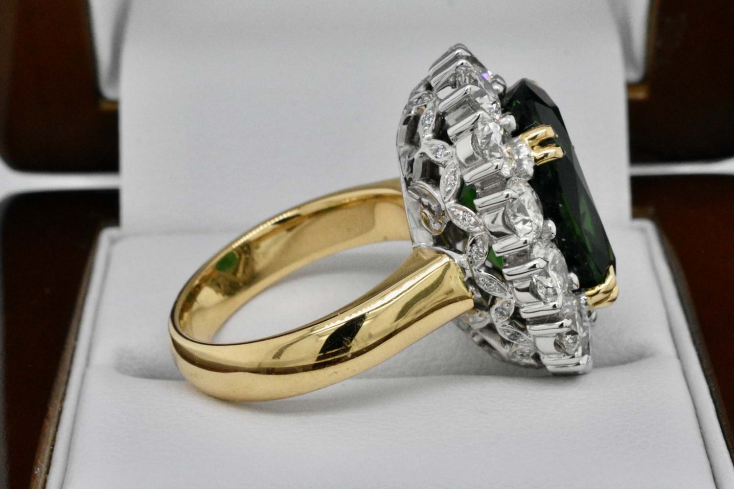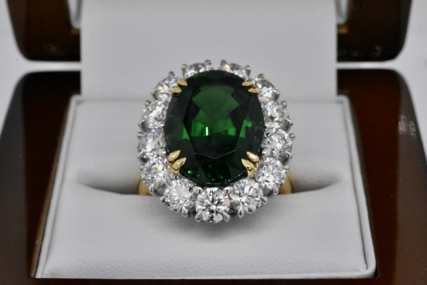 This show stopping and totally fantastic bespoke creation features an epic 11.10ct bright dark green (Chrome) tourmaline surrounded by thirteen scintillating round brilliant cut diamonds totalling close to 4cts- this fabulous ring is not for the faint of heart! The ring has been handmade in 18ct yellow and white gold with a decorative diamond set basket containing an additional 40 shimmering diamonds equalling 0.13cts. Independent Valuation Supplied.
