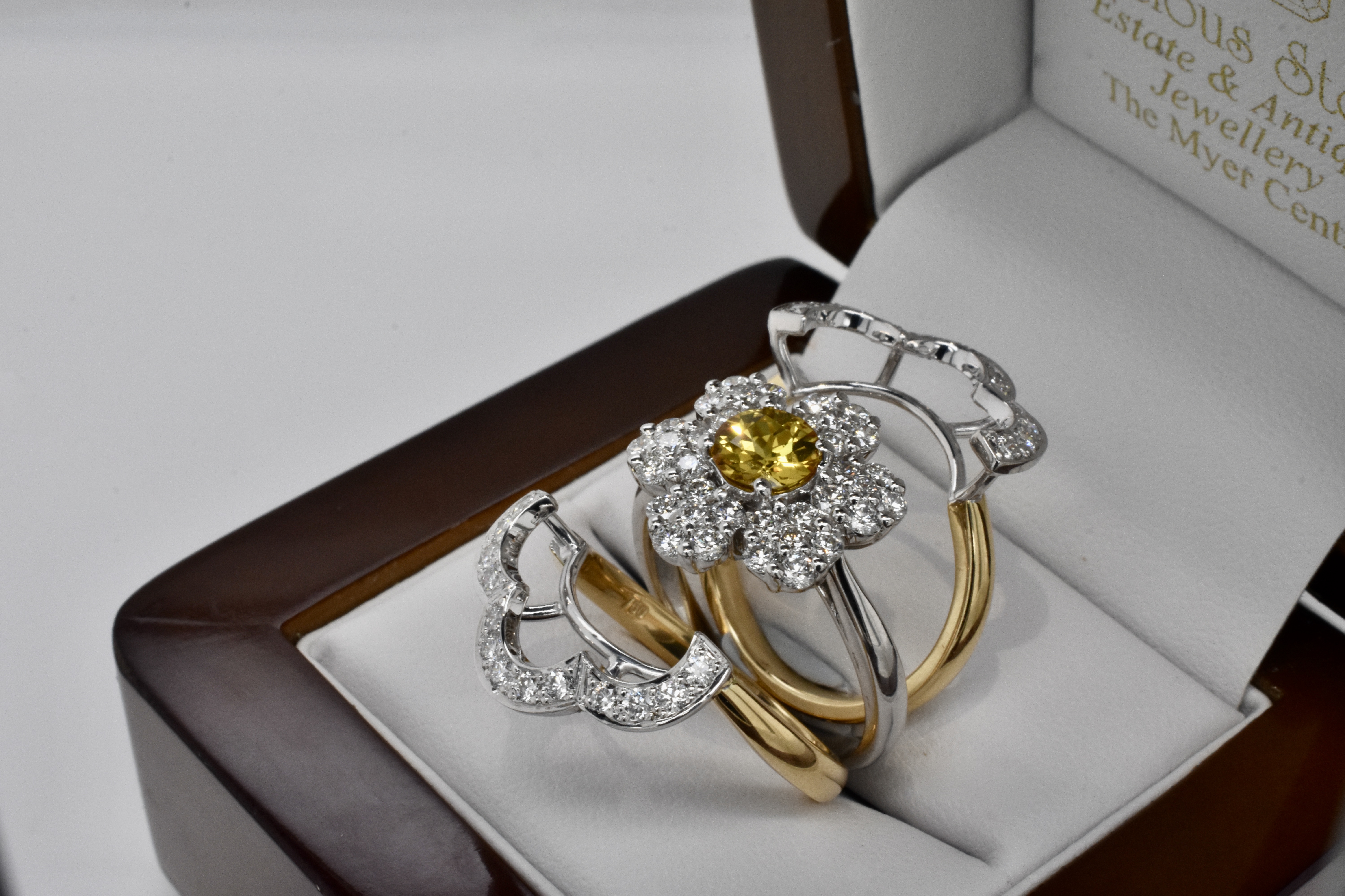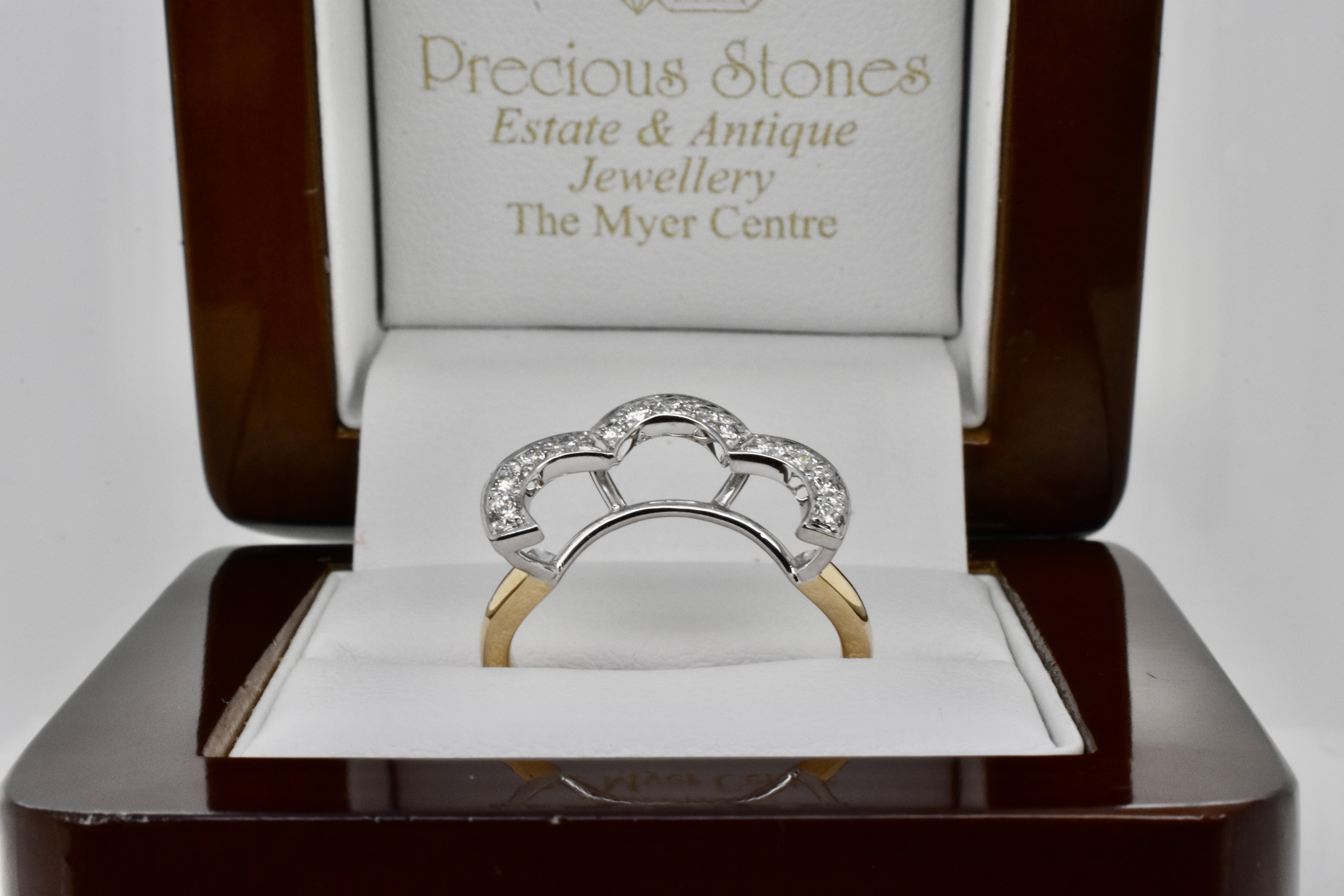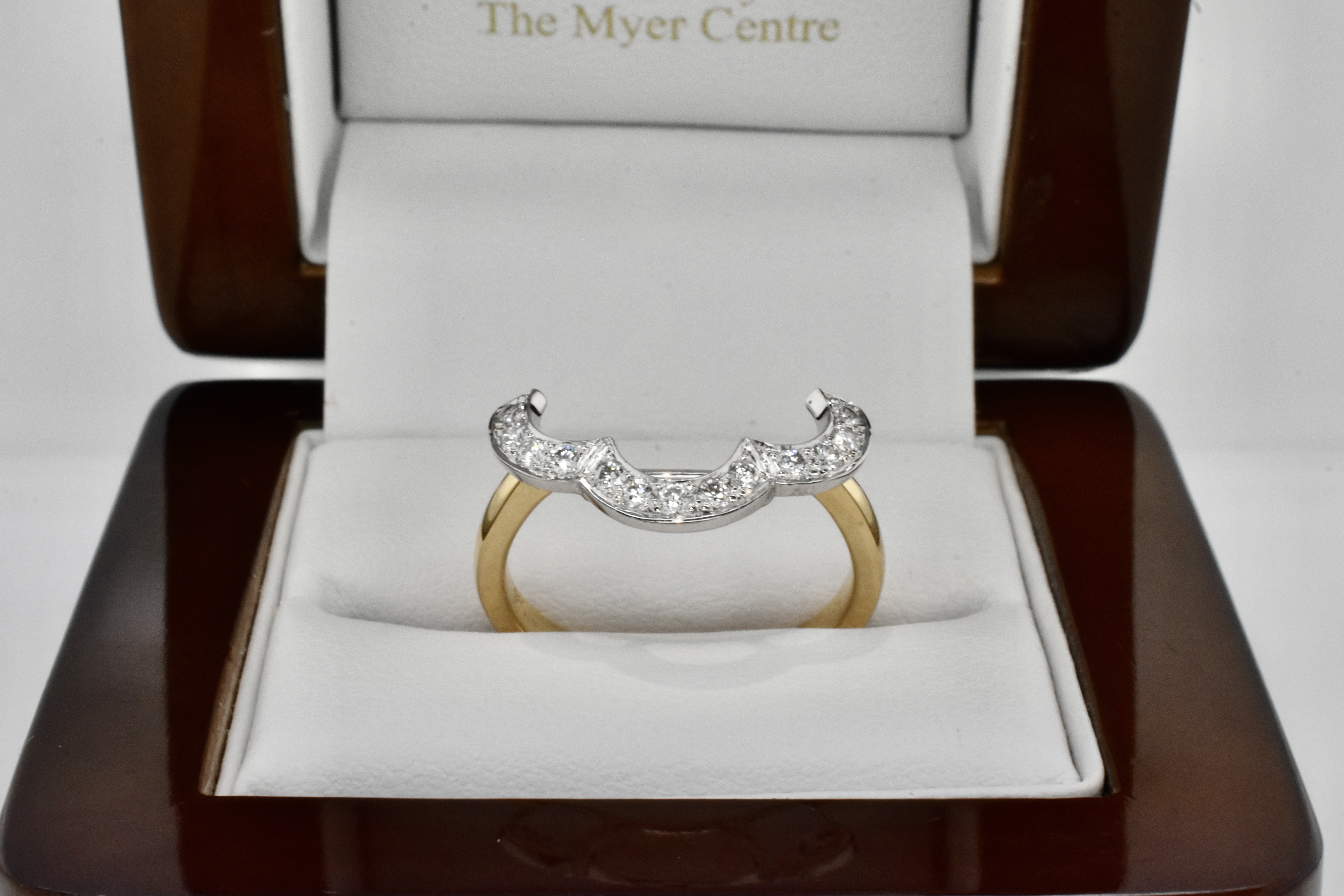 These custom bands were designed to fit around an existing ring to bring more sparkle and incorporate yellow gold into the overall look. Handmade in our workshop in 18ct yellow and white gold each band contains 13 round brilliant cut diamonds totalling 0.265ct grain set with an edge in a scalloped shape to fit around the existing flower ring. Independent Valuation Supplied.