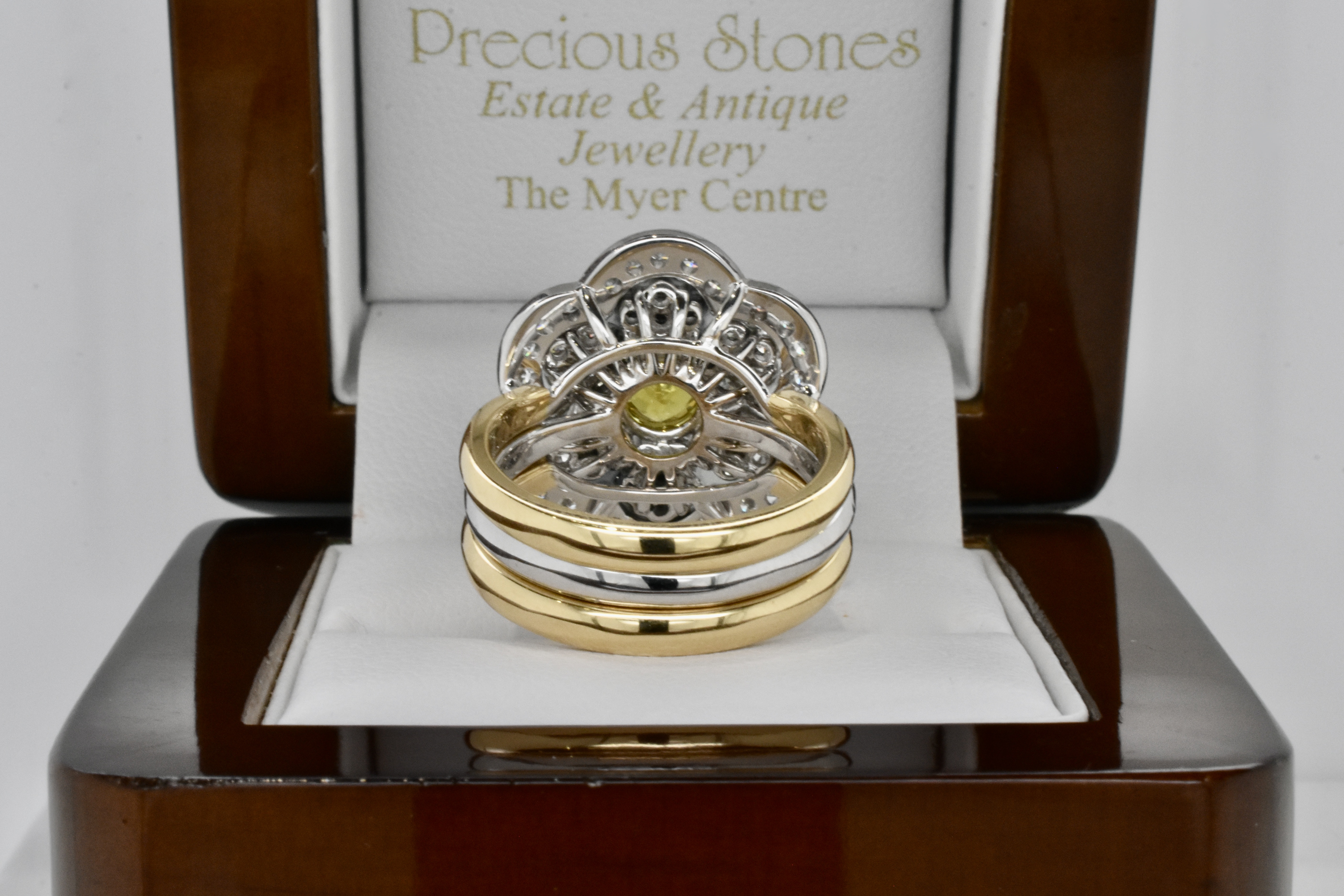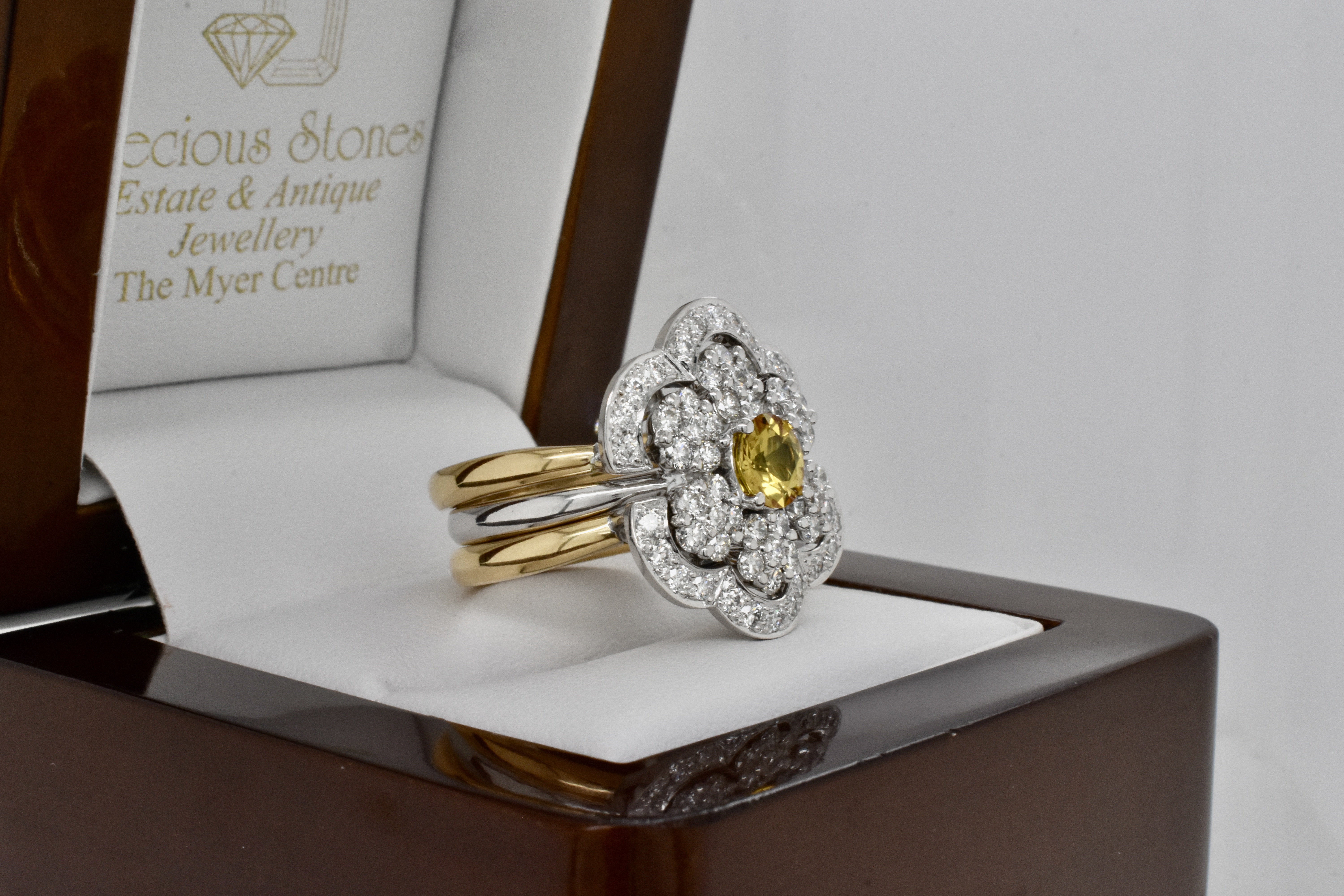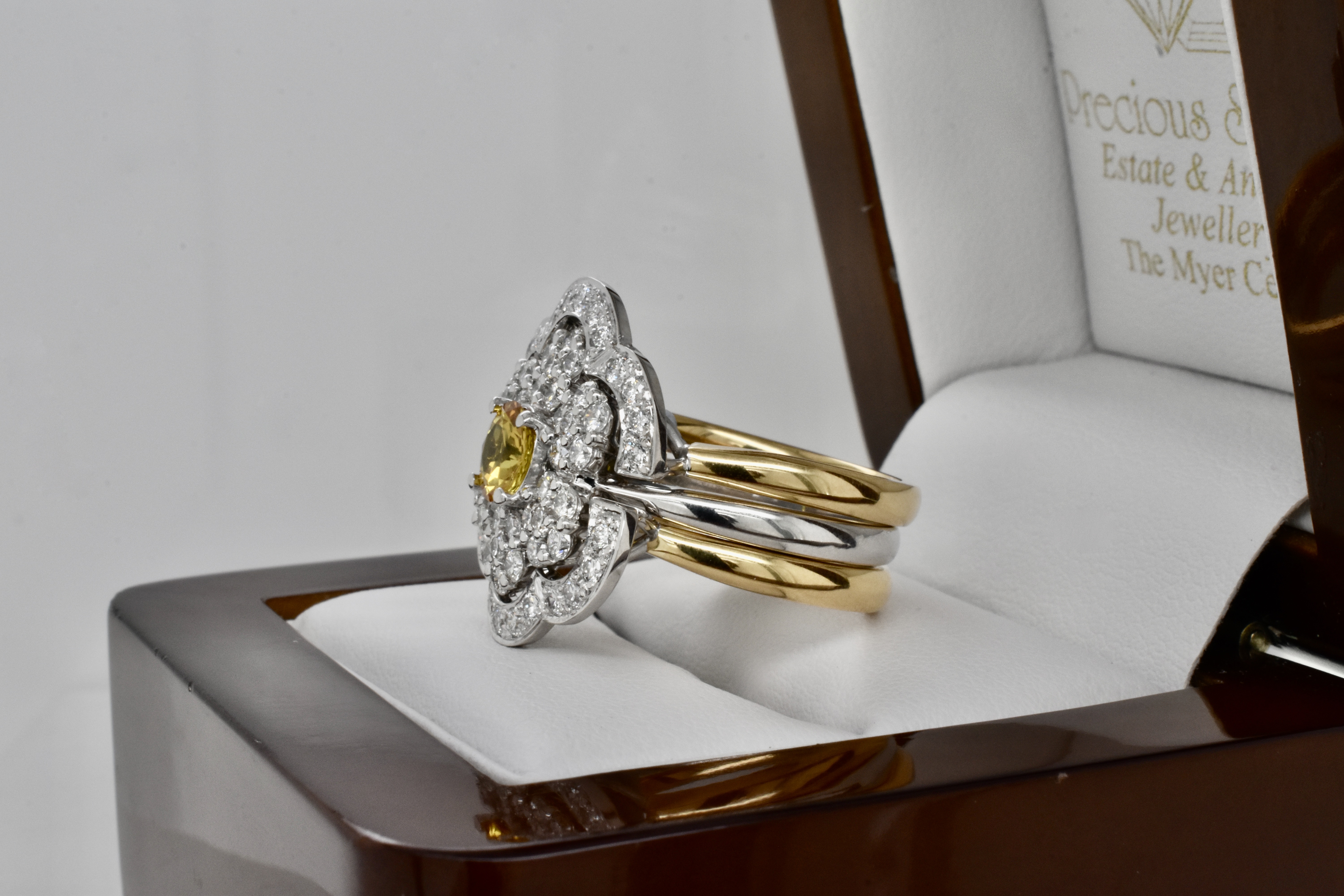 These custom bands were designed to fit around an existing ring to bring more sparkle and incorporate yellow gold into the overall look. Handmade in our workshop in 18ct yellow and white gold each band contains 13 round brilliant cut diamonds totalling 0.265ct grain set with an edge in a scalloped shape to fit around the existing flower ring. Independent Valuation Supplied.