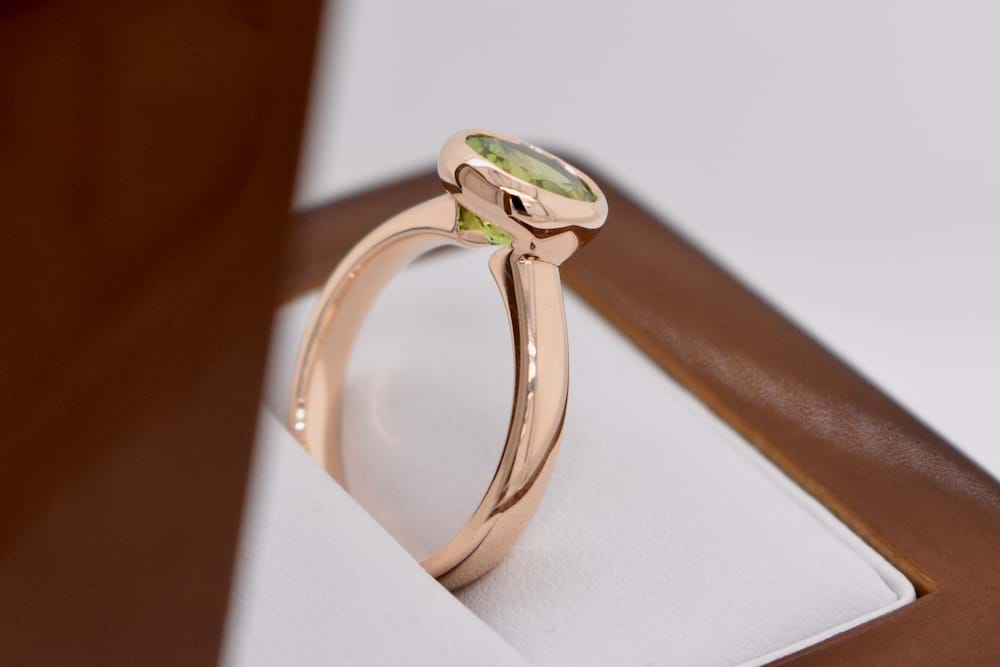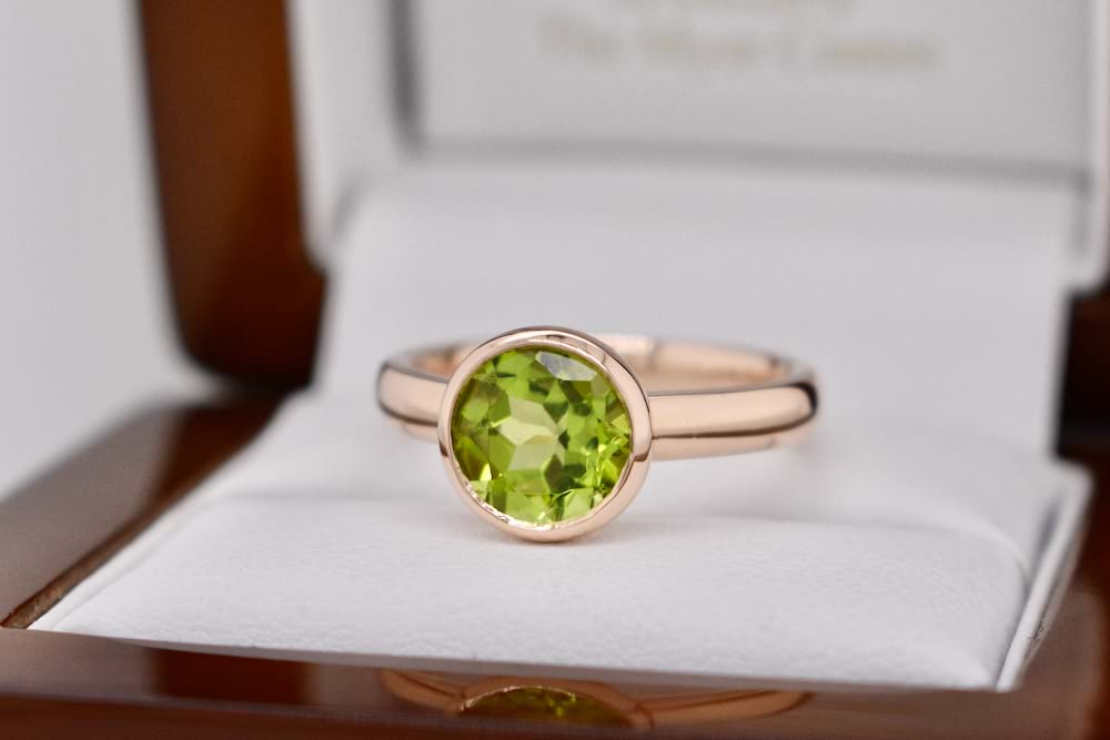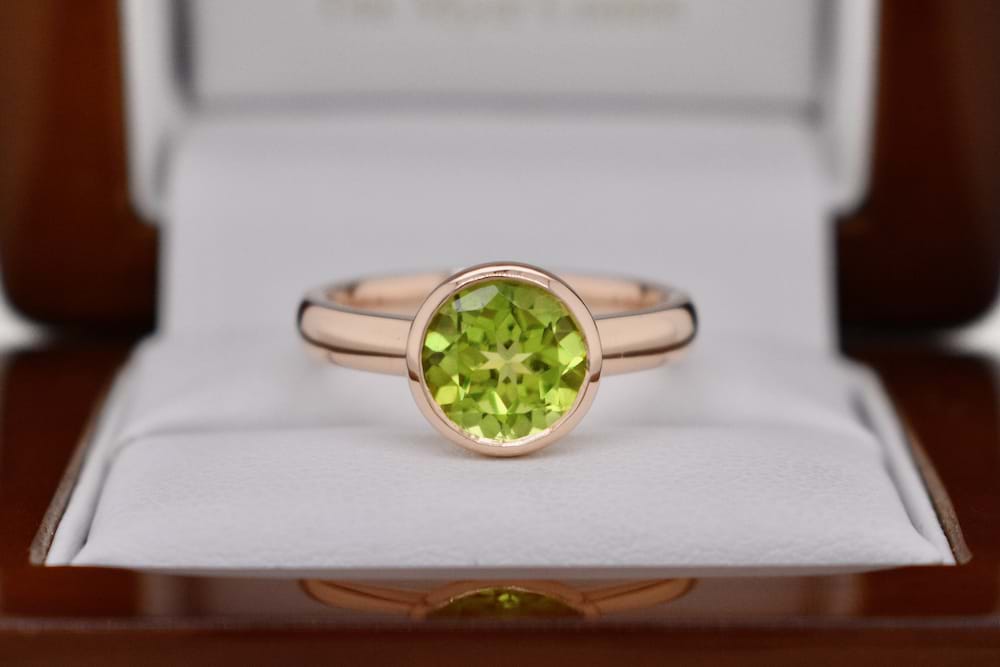 Chosen by its current owner this bright mid yellowish-green peridot of 2.29cts has been bezel set into a custom made 9ct rose gold ring. Independent Valuation Supplied.
