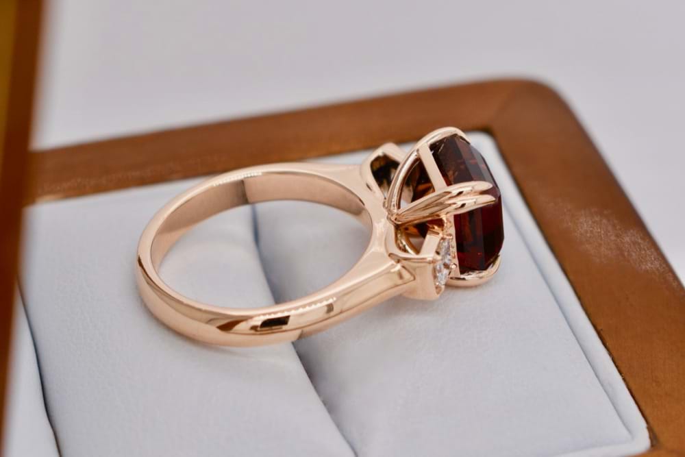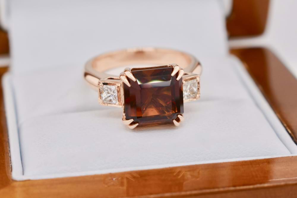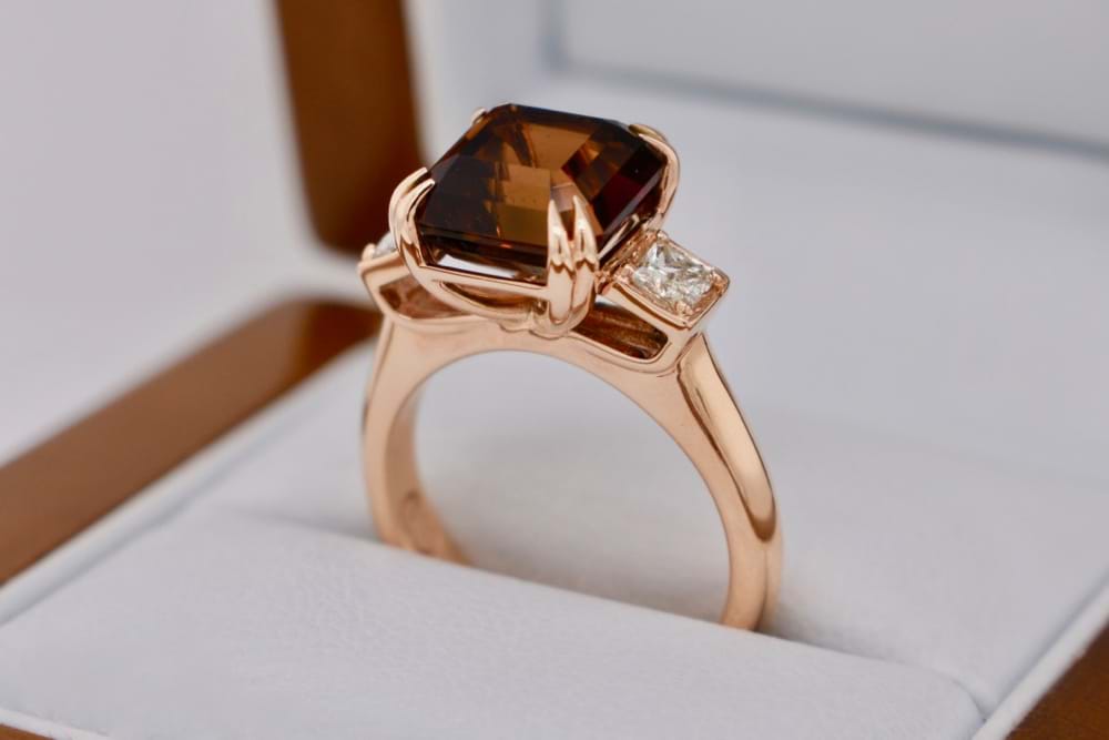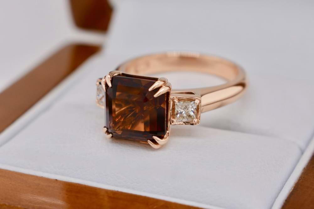 A striking 5.87ct sherry topaz chosen in store to be the feature of this gorgeous 9ct rose gold ring. Incorporating the clients diamonds this design was dreamed up in store alongside one of our chief designers and the finished product has our customer beaming! Independent Valuation Supplied. If you are inspired by this archived design contact us today to discuss how we can create something incredible for you or your loved one.