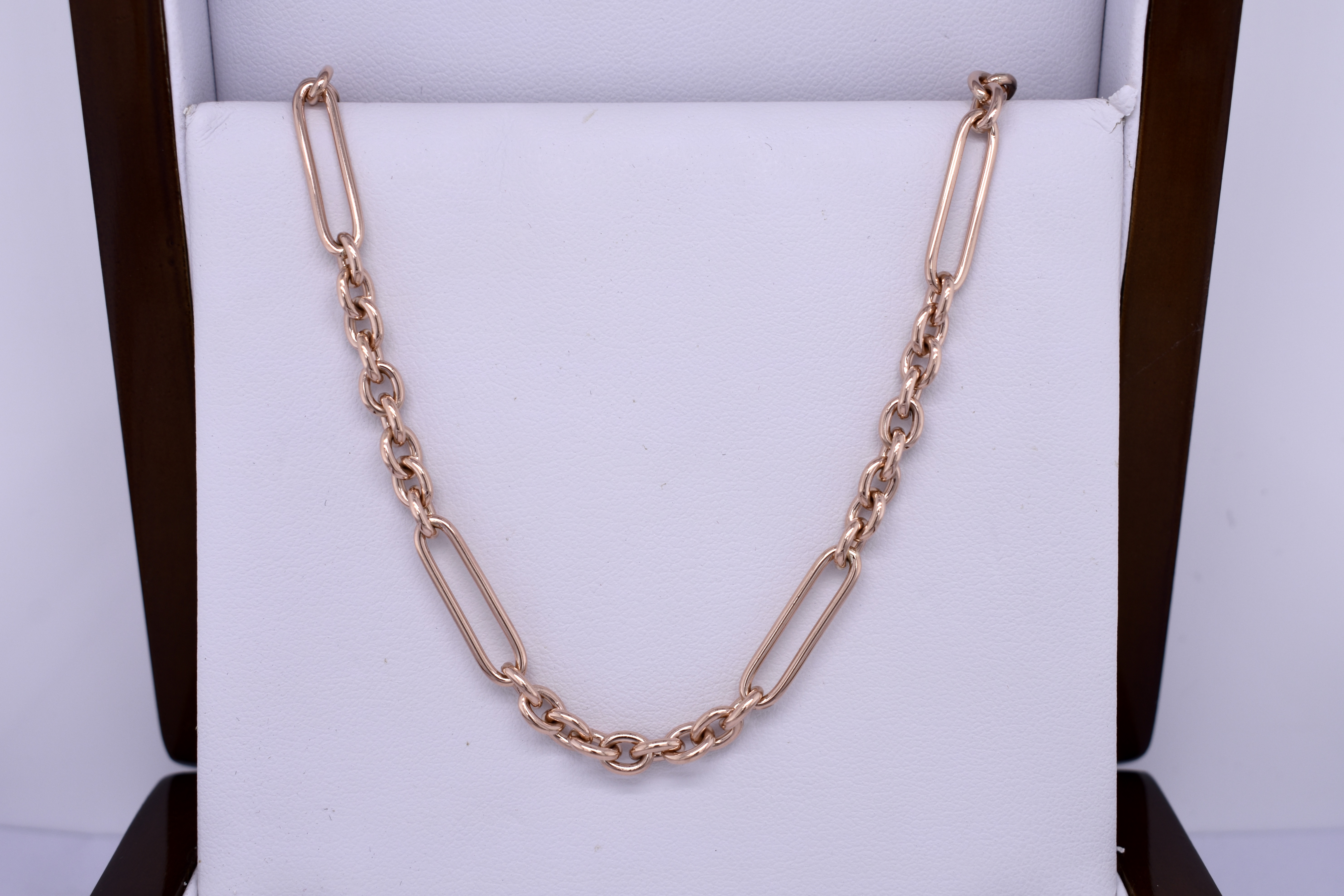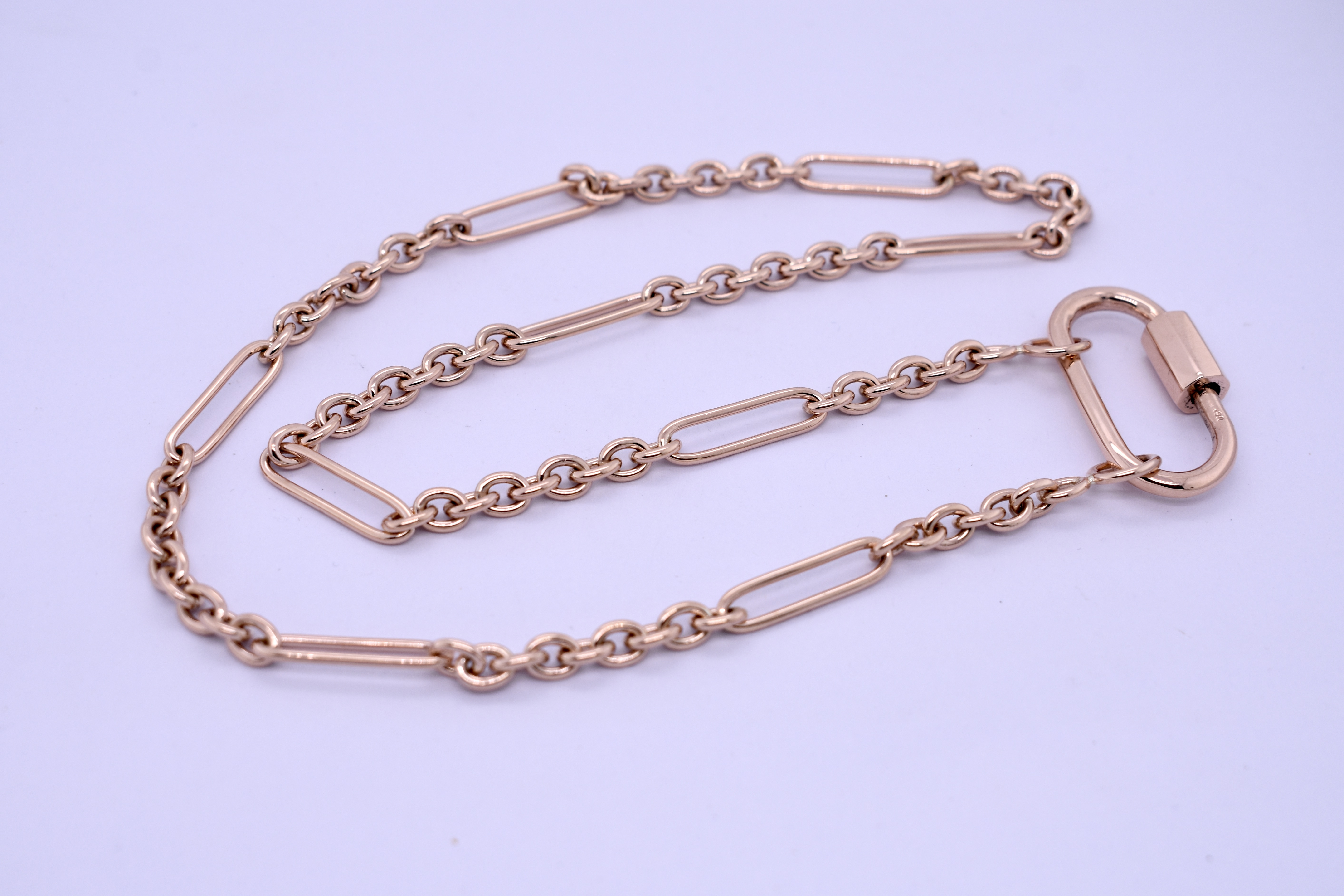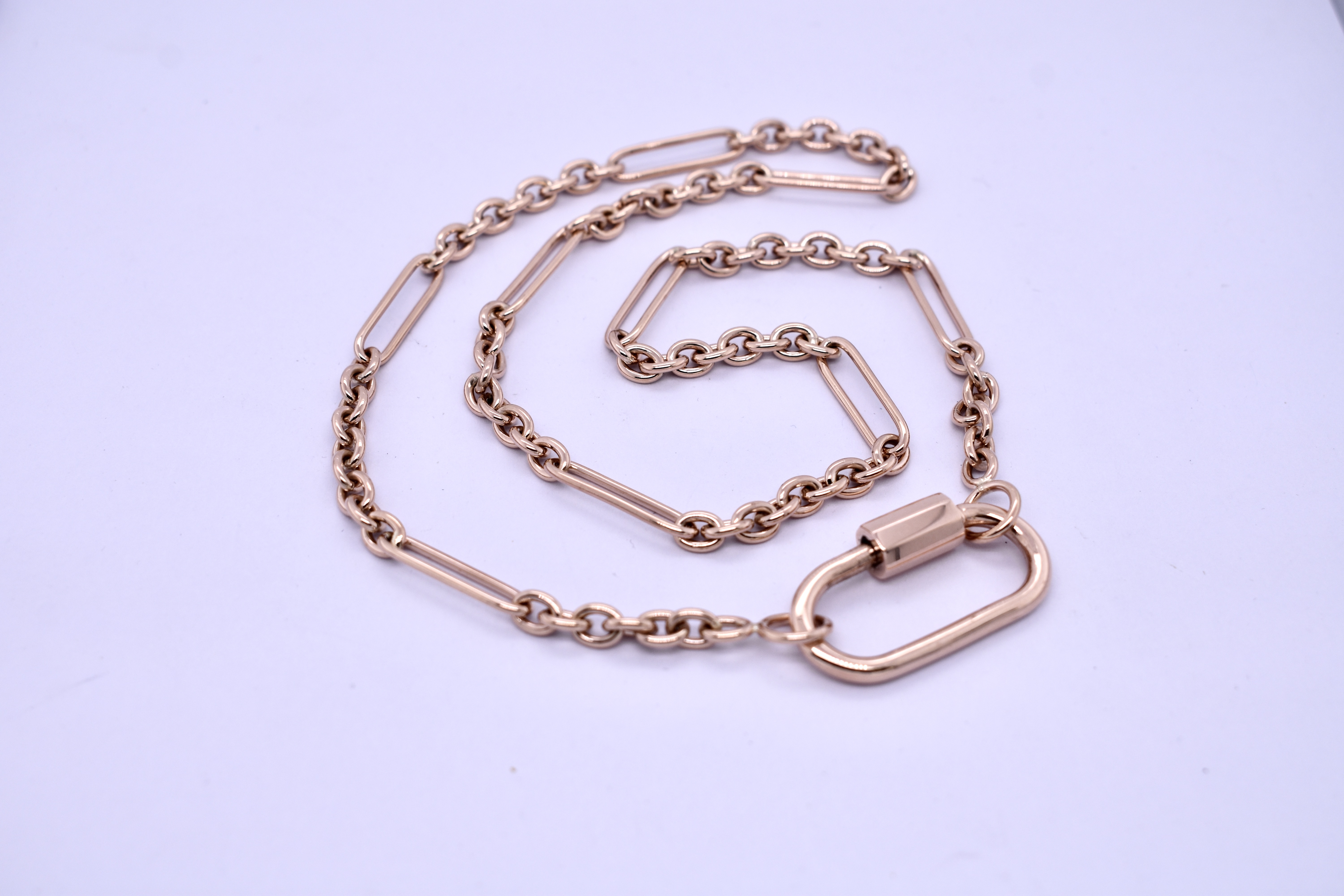 Handmade by our talented goldsmith in 9ct rose gold using our clients recycled gold, this beautiful 9/1 cable link chain has been made in our BB gauge and we have paired the chain with our classic oval carabiner clasp.